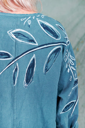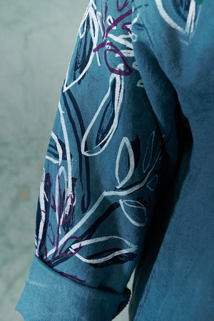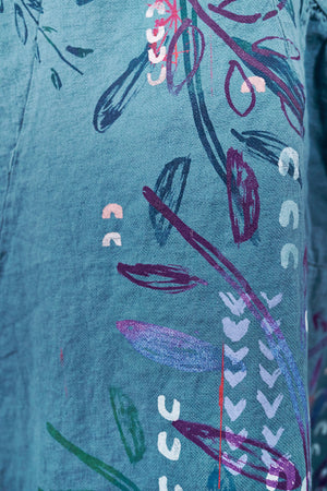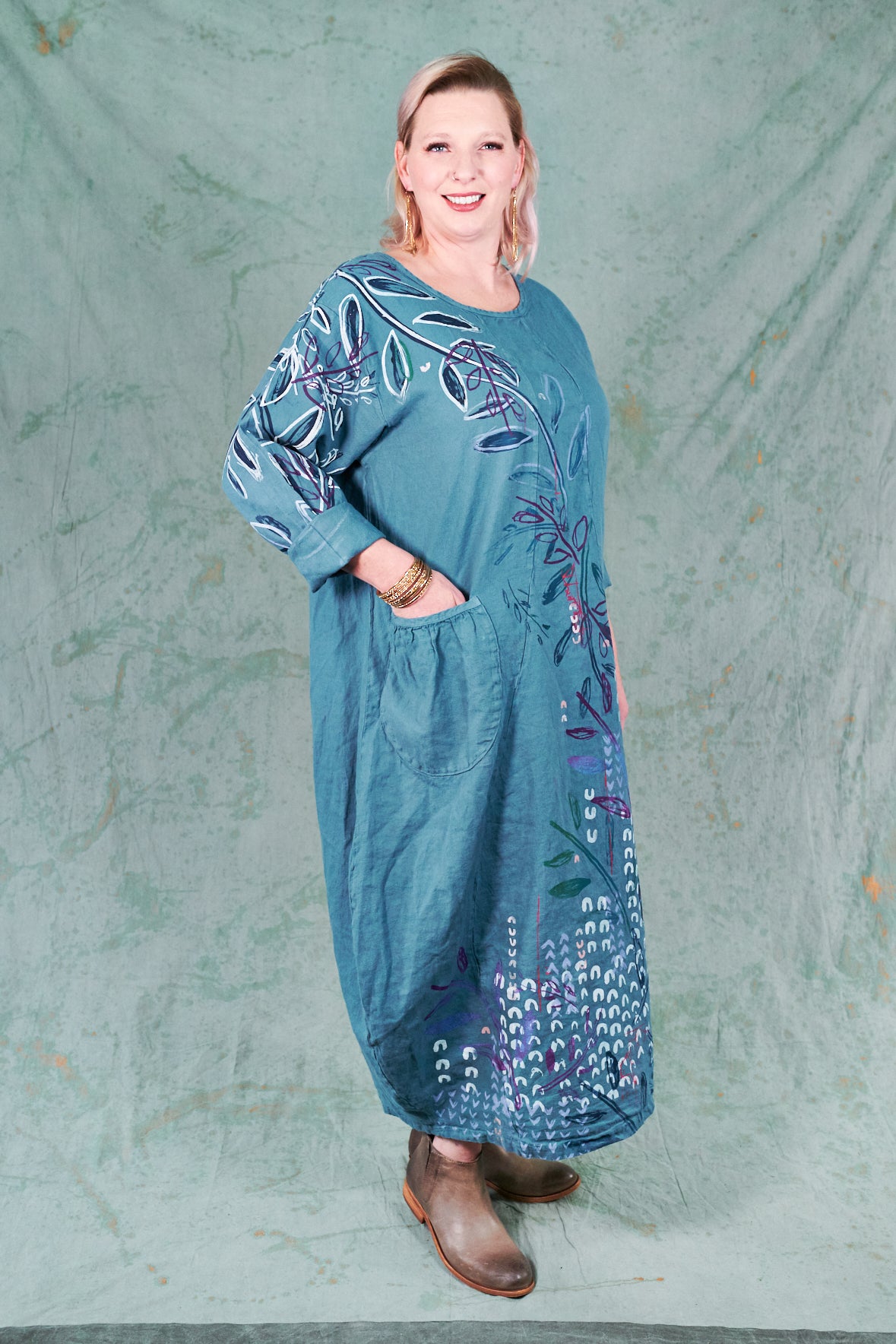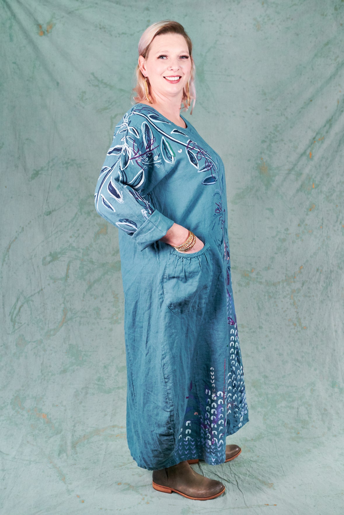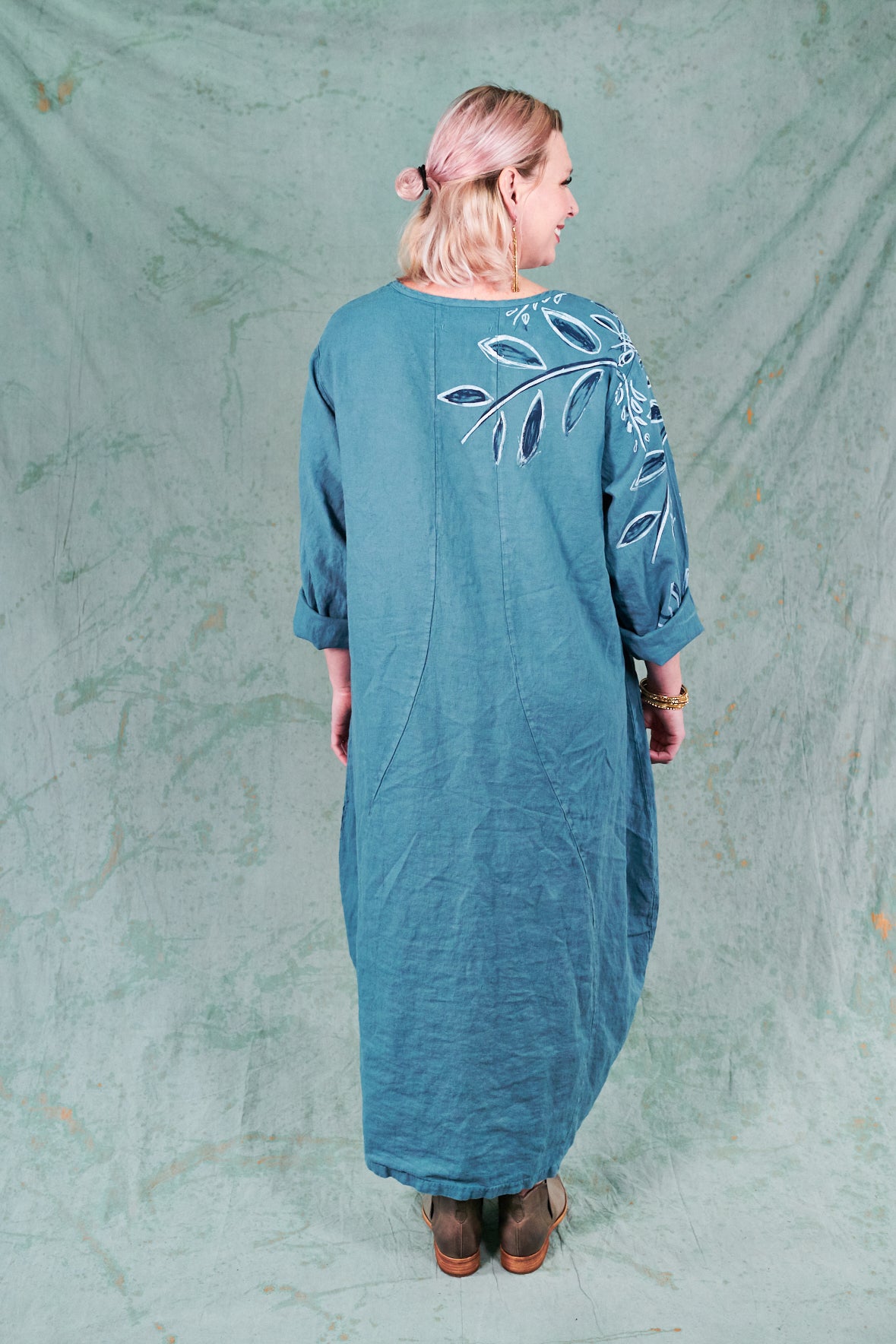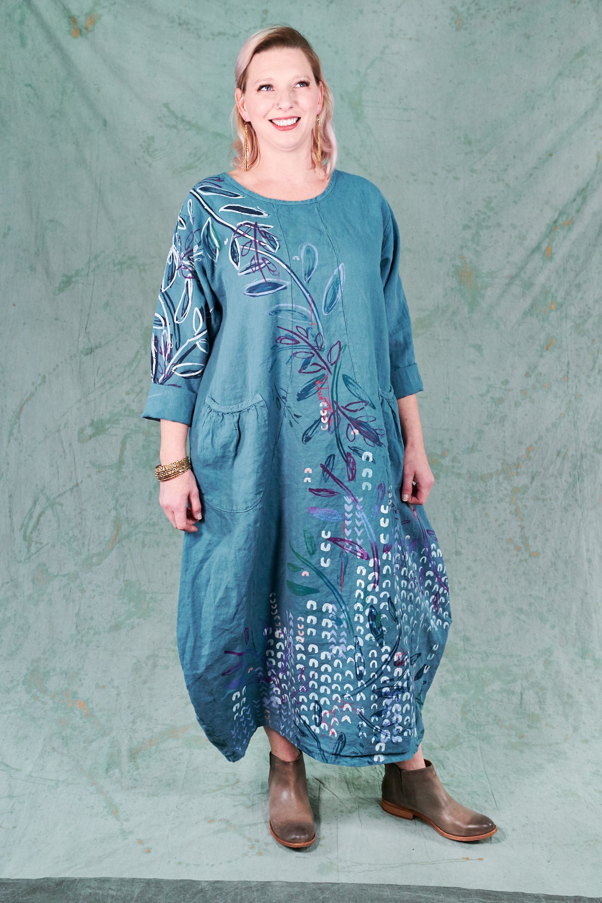 You may know this also as our popular Thistle Dress. Textural woven heavy linen made into a flattering, curved dress with a tulip shaped lower half. Featuring center front vertical, curving design lines for shaping and 2 sweet gathered pockets with binding and tucks.