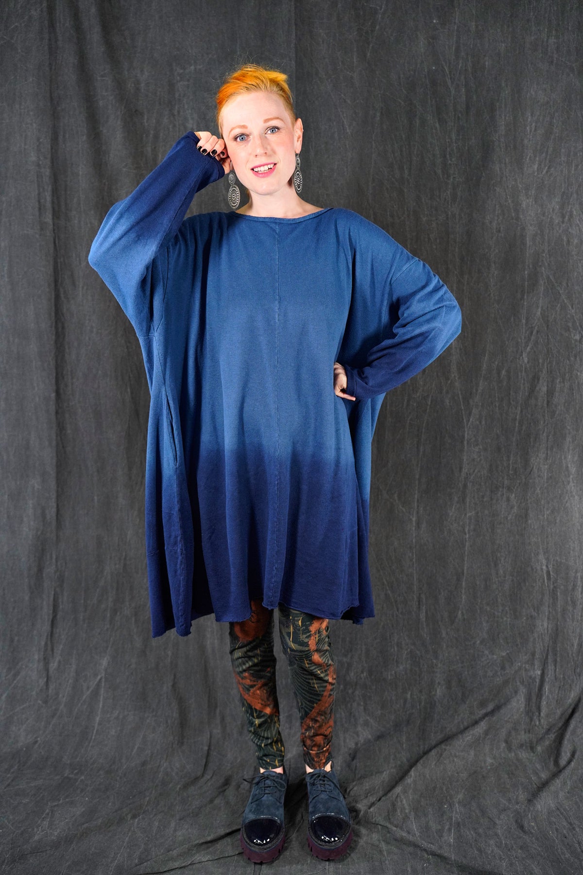Heavier weight hand dyed ombre hemp organic cotton knit has a nice hemp texture, keeps you warm + cozy. This style is cut wide for drape and layers over easily, an essential cold weather piece- wear with leggings like a dress, or layer over whatever you like to use as a huge & loose sweatshirt.
