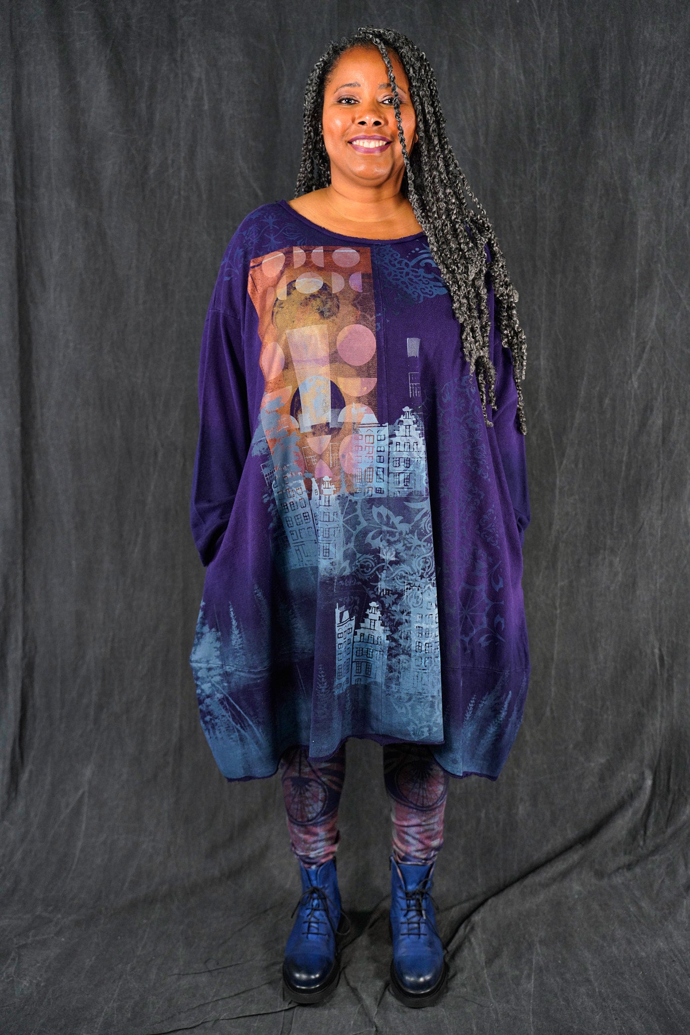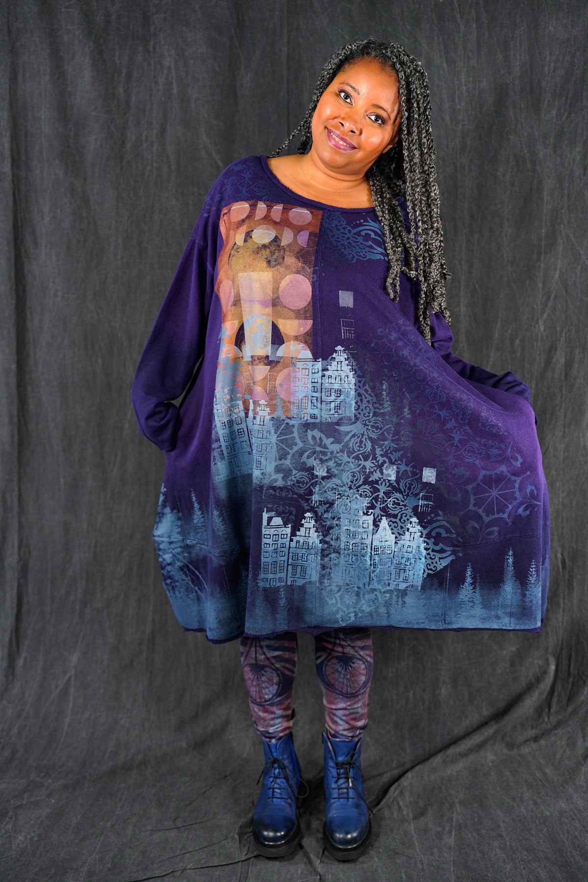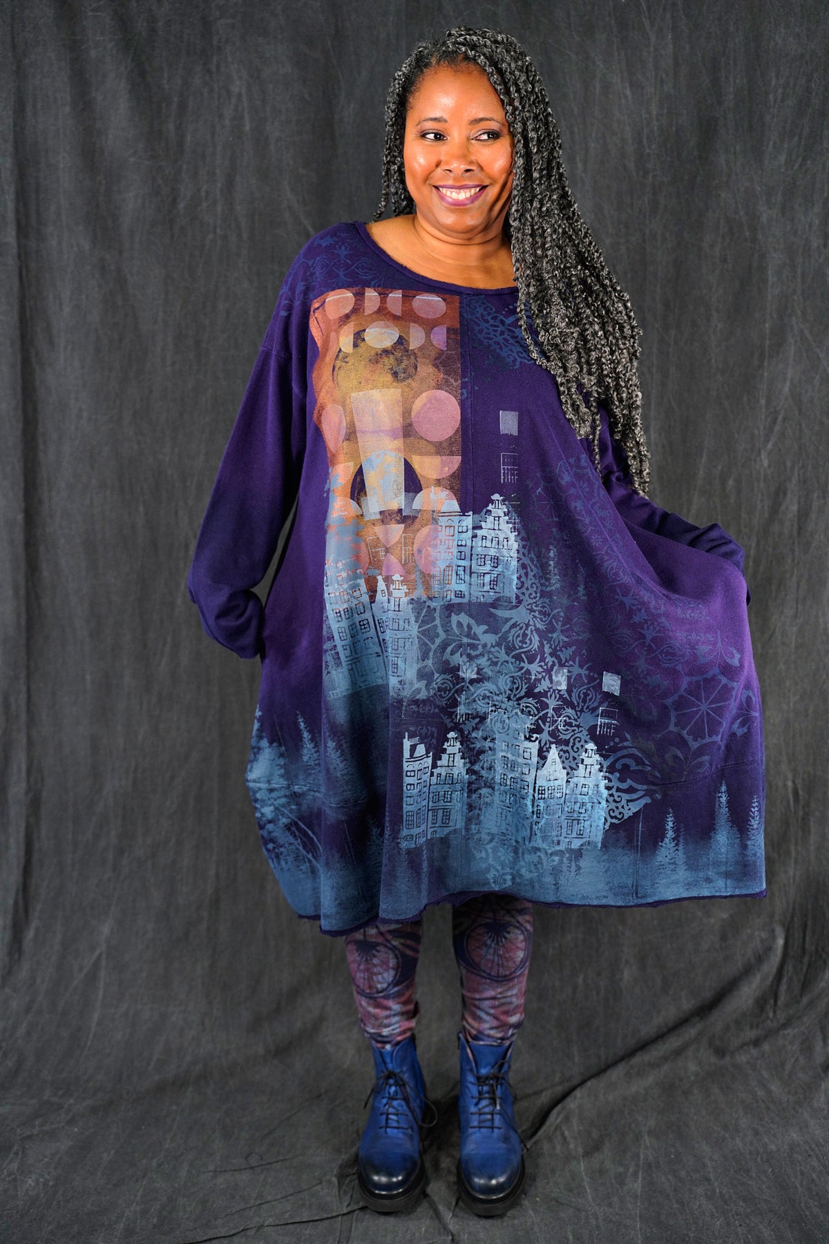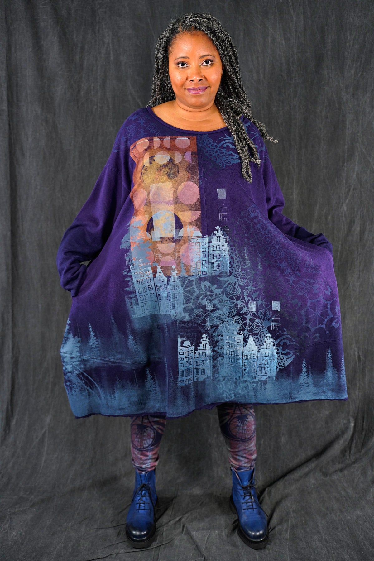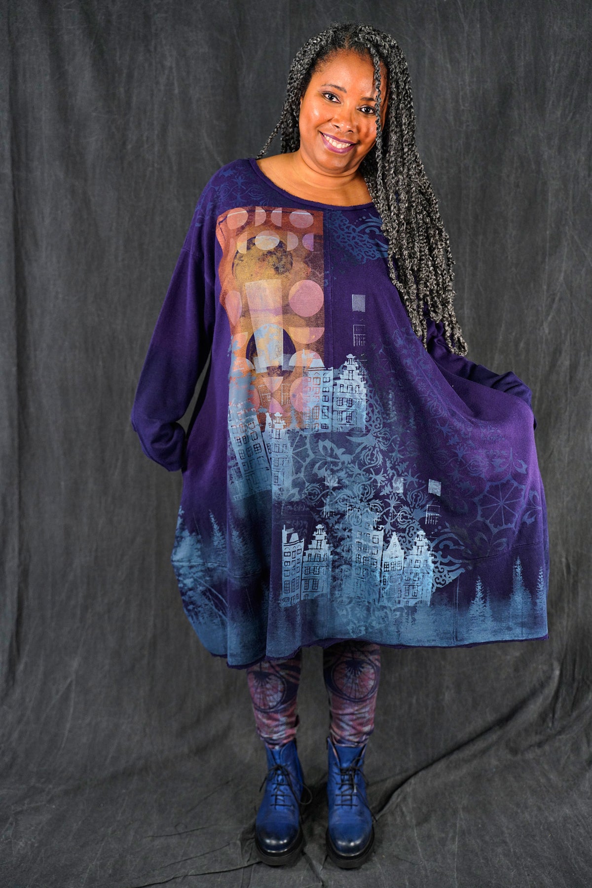 Hemp organic cotton knit. super shaped wide dress with darts for shaping at hemline. pockets, roll to raw edge treatment. City Moon limited print.