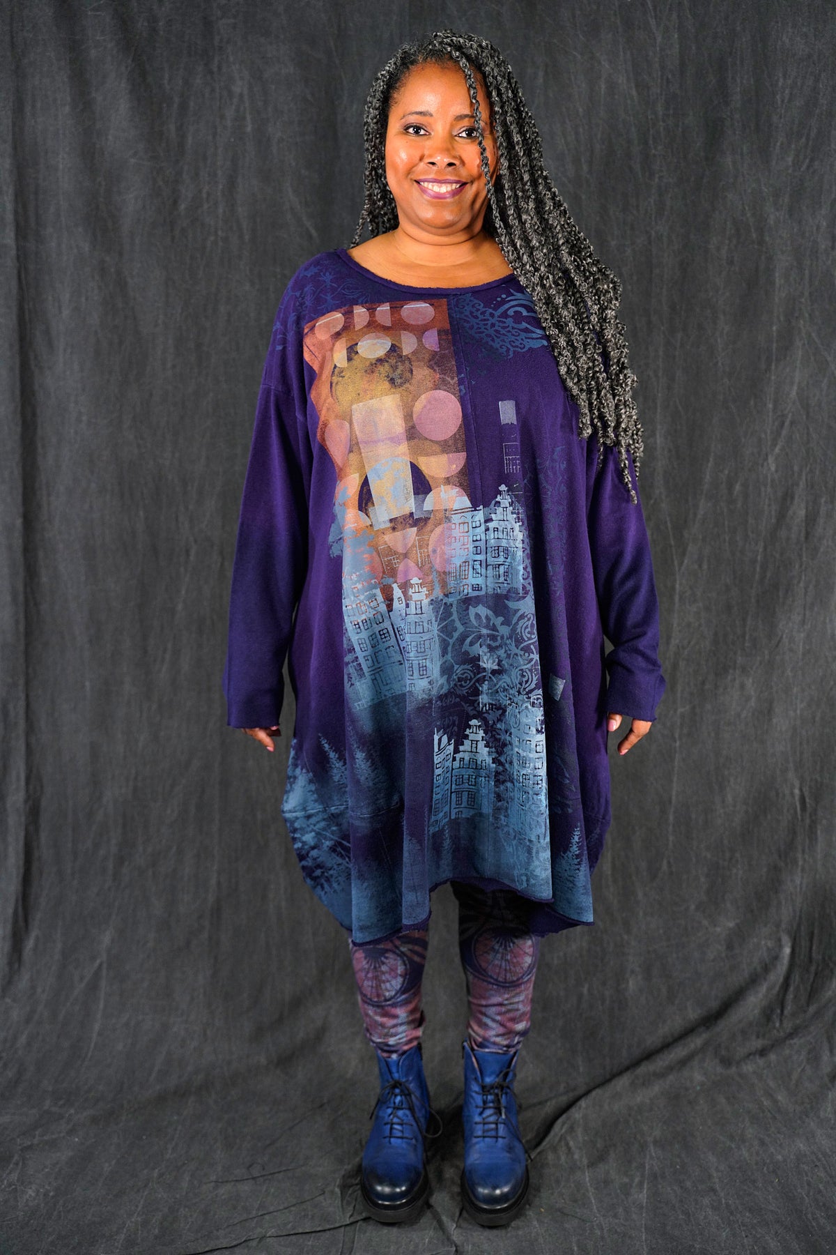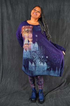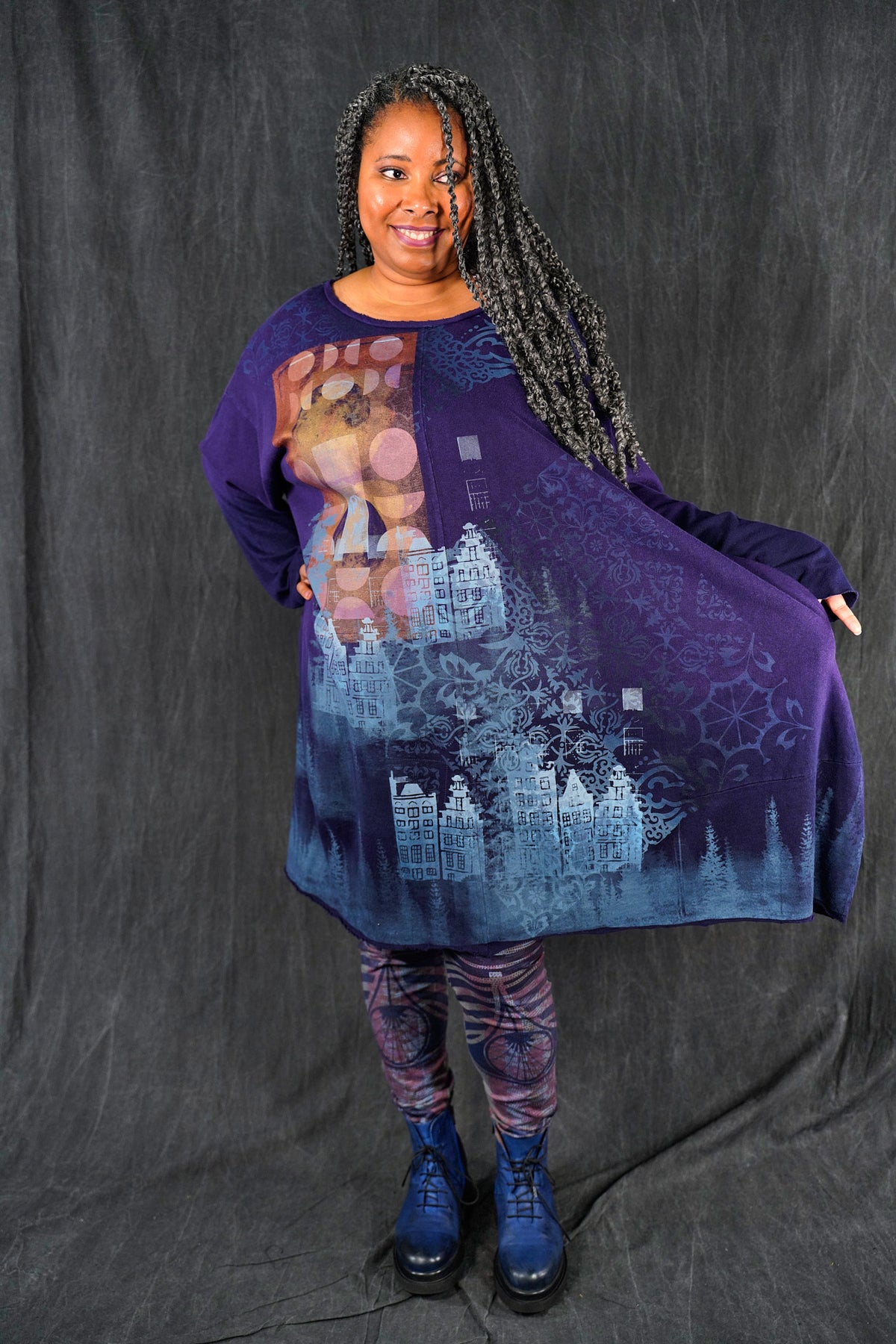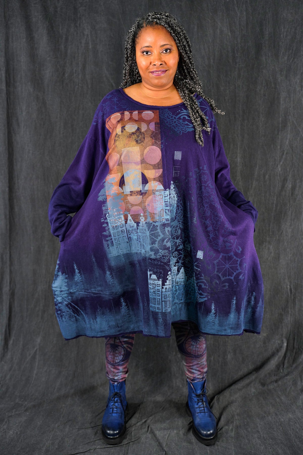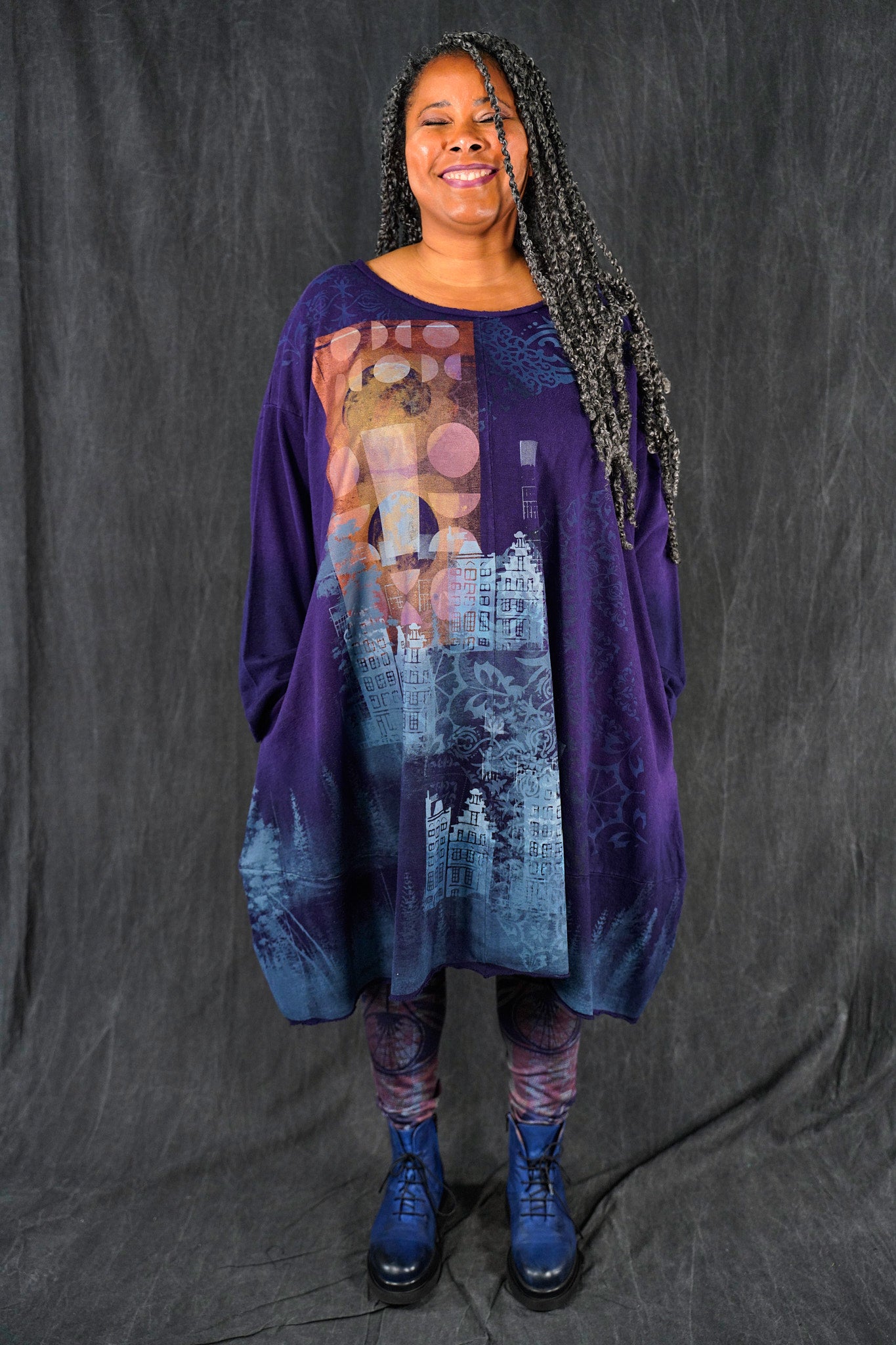 Hemp organic cotton knit. super shaped wide dress with darts for shaping at hemline. pockets, roll to raw edge treatment. City Moon limited print.