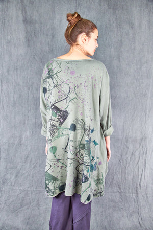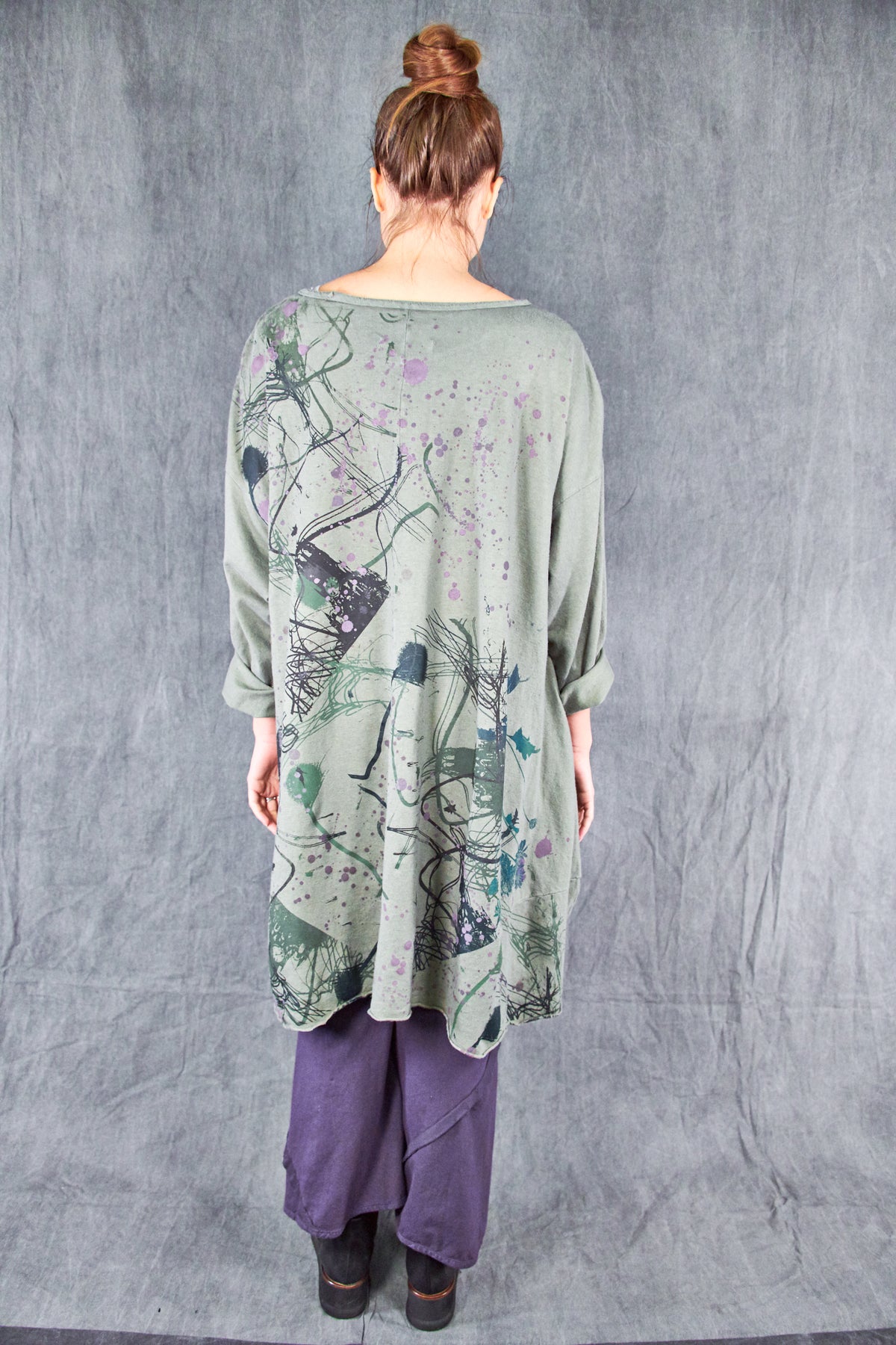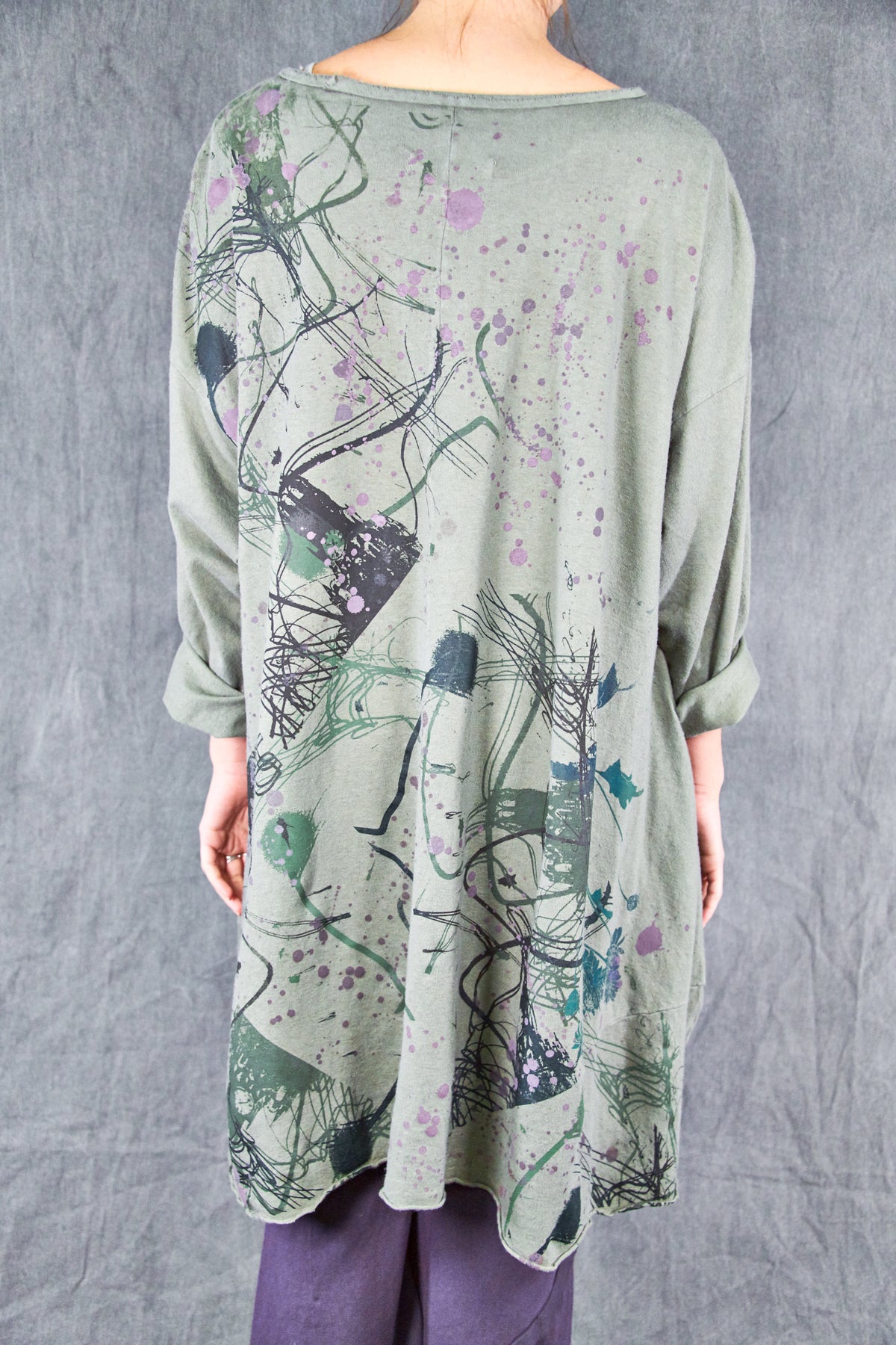 Heavier weight hemp organic cotton knit has a nice hemp texture, keeps you warm + cozy. This style is cut wide for drape and layers over easily, an essential cold weather piece- wear with leggings like a dress, or layer over whatever you like to use as a huge & loose sweatshirt. *Seasonal Favorite* it features wonderful artwork- take a closer look to see the details.