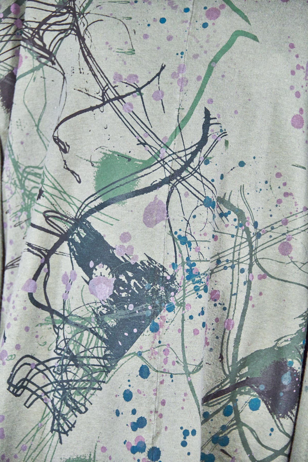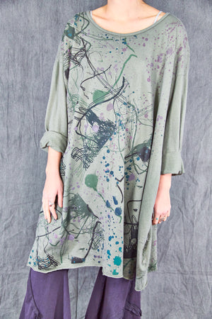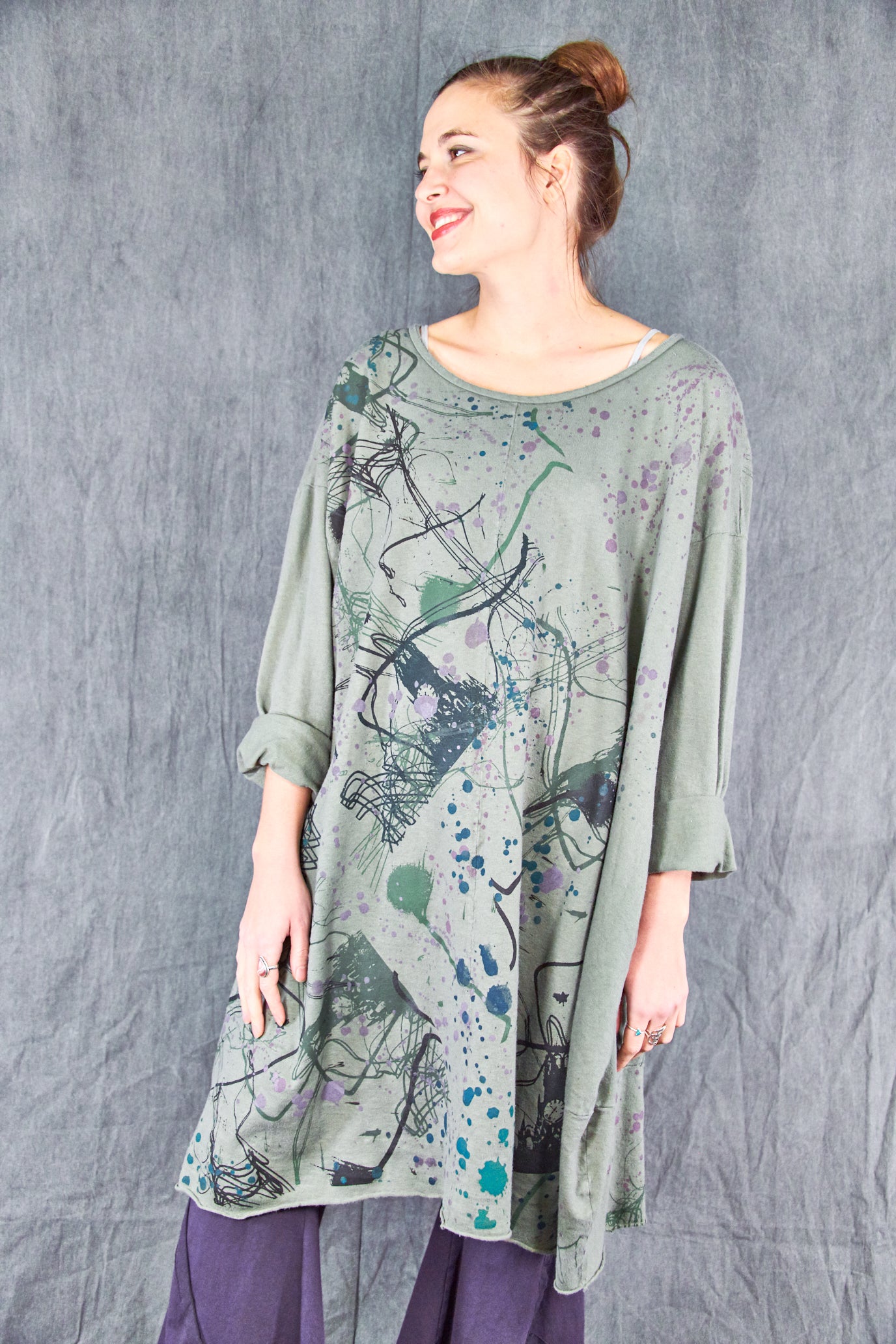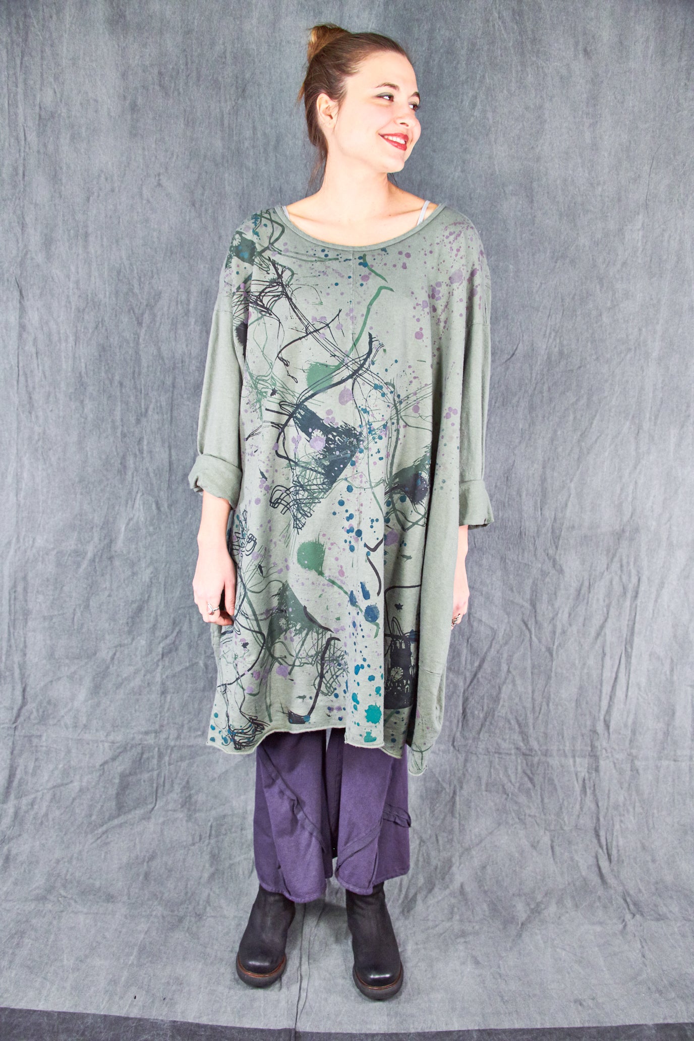Heavier weight hemp organic cotton knit has a nice hemp texture, keeps you warm + cozy. This style is cut wide for drape and layers over easily, an essential cold weather piece- wear with leggings like a dress, or layer over whatever you like to use as a huge & loose sweatshirt. *Seasonal Favorite* it features wonderful artwork- take a closer look to see the details.