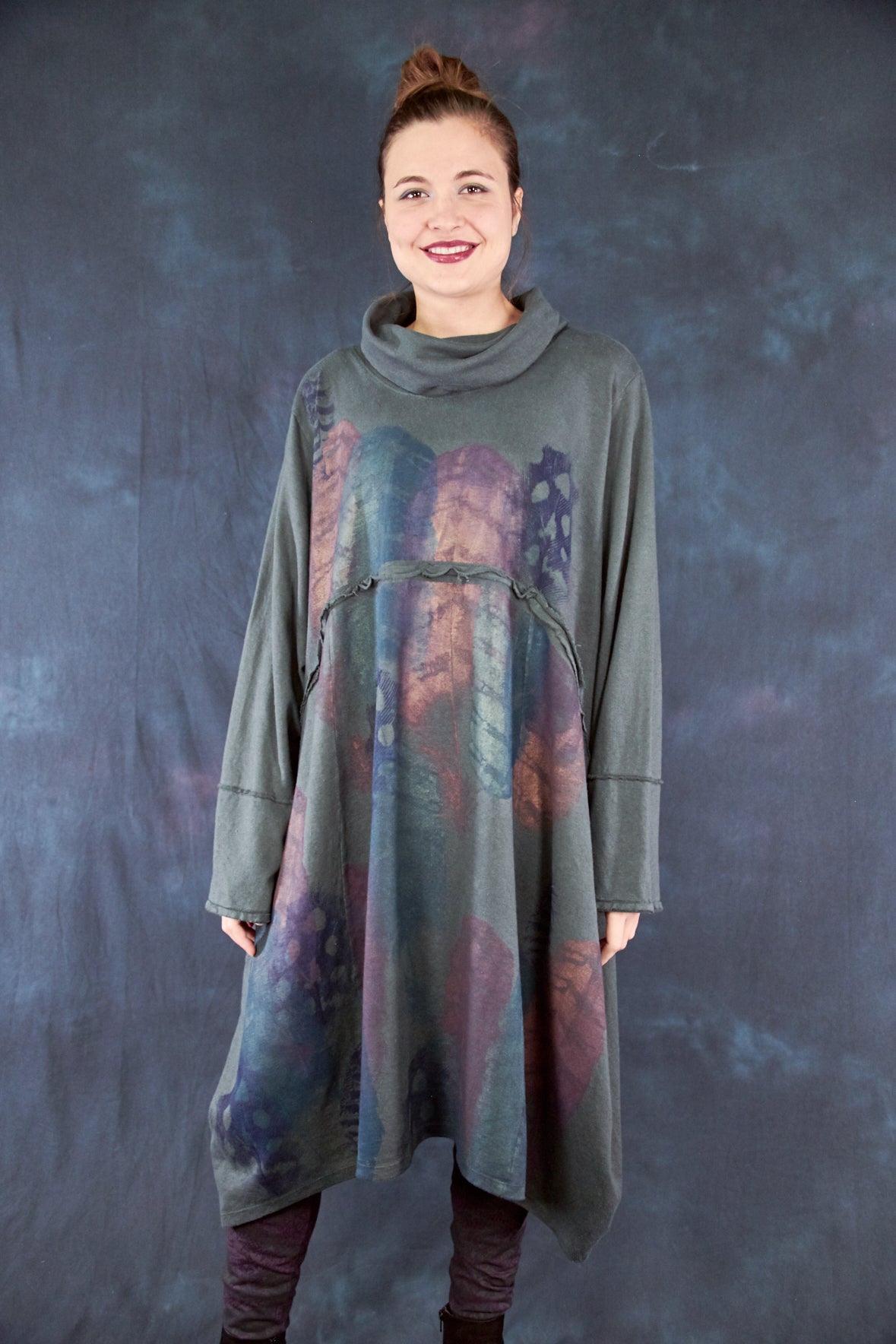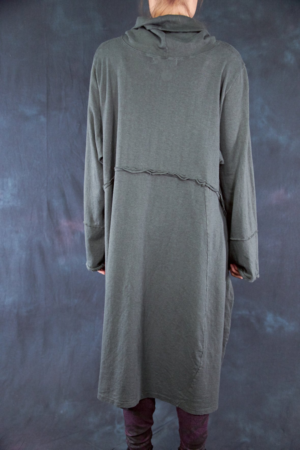 Effortless shape with a beautifully wide cowl neck. Inside out/raw-edged details. Made from organic cotton and hemp knit, which offers extra warmth for colder days. This shape is oversized and easy; throw it on over anything for a unique look and pure Blue Fish comfort. On seam pockets, cuffable sleeves, warm cowl...just try to take it off. P.S. Model is wearing a sz 1- she would wear a 0 in real life. This is a generous style but it drapes well and is not overwhelming when sized correctly.