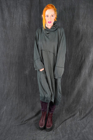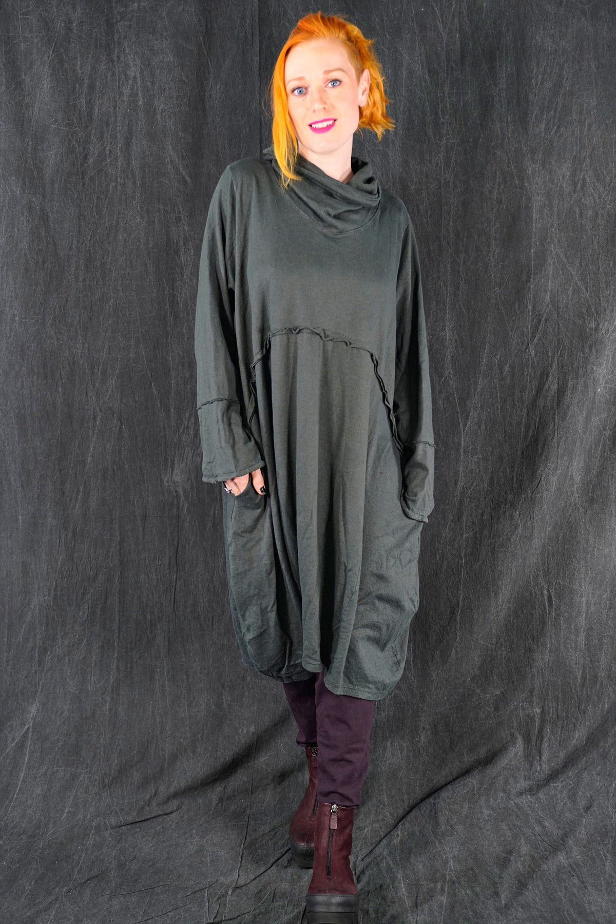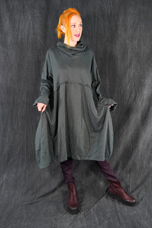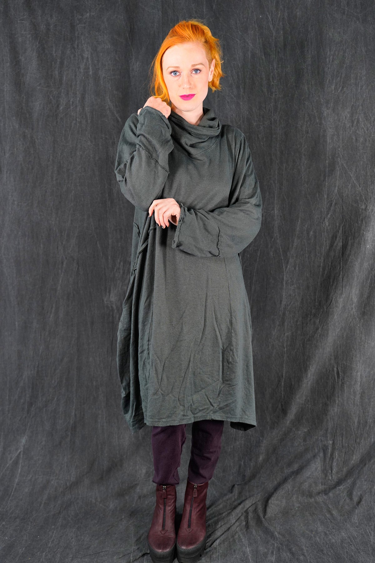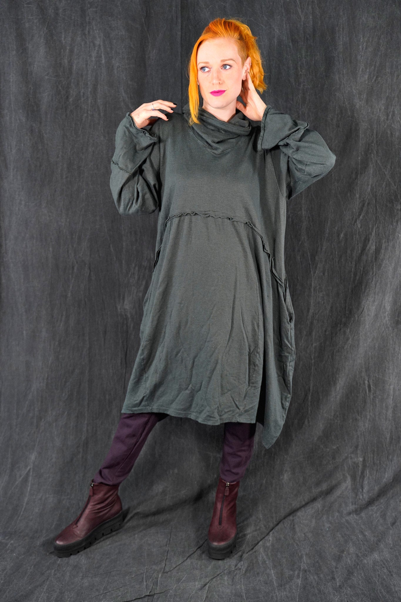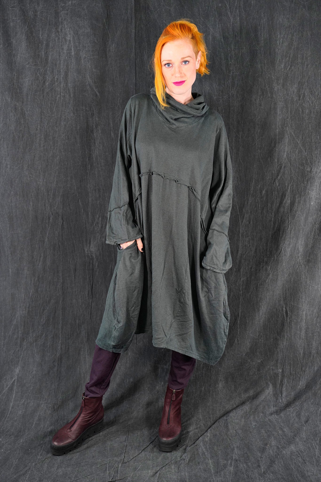Effortless shape with a beautifully wide cowl neck. Inside out/raw-edged details. Made from organic cotton and hemp knit, which offers extra warmth for colder days. This shape is oversized and easy; throw it on over anything for a unique look and pure Blue Fish comfort. On seam pockets, cuffable sleeves, warm cowl...just try to take it off. This is a generous style but it drapes well and is not overwhelming when sized correctly.