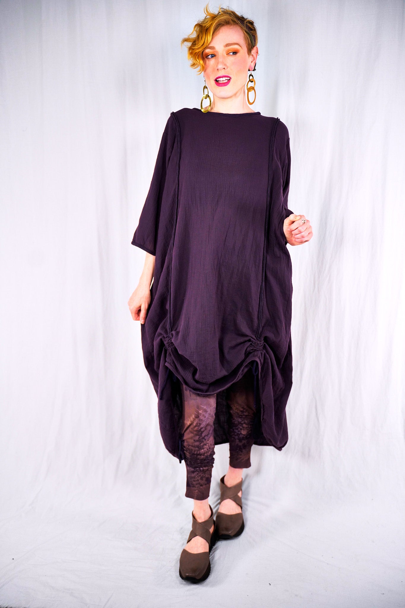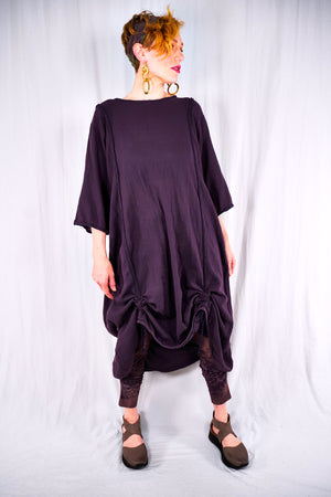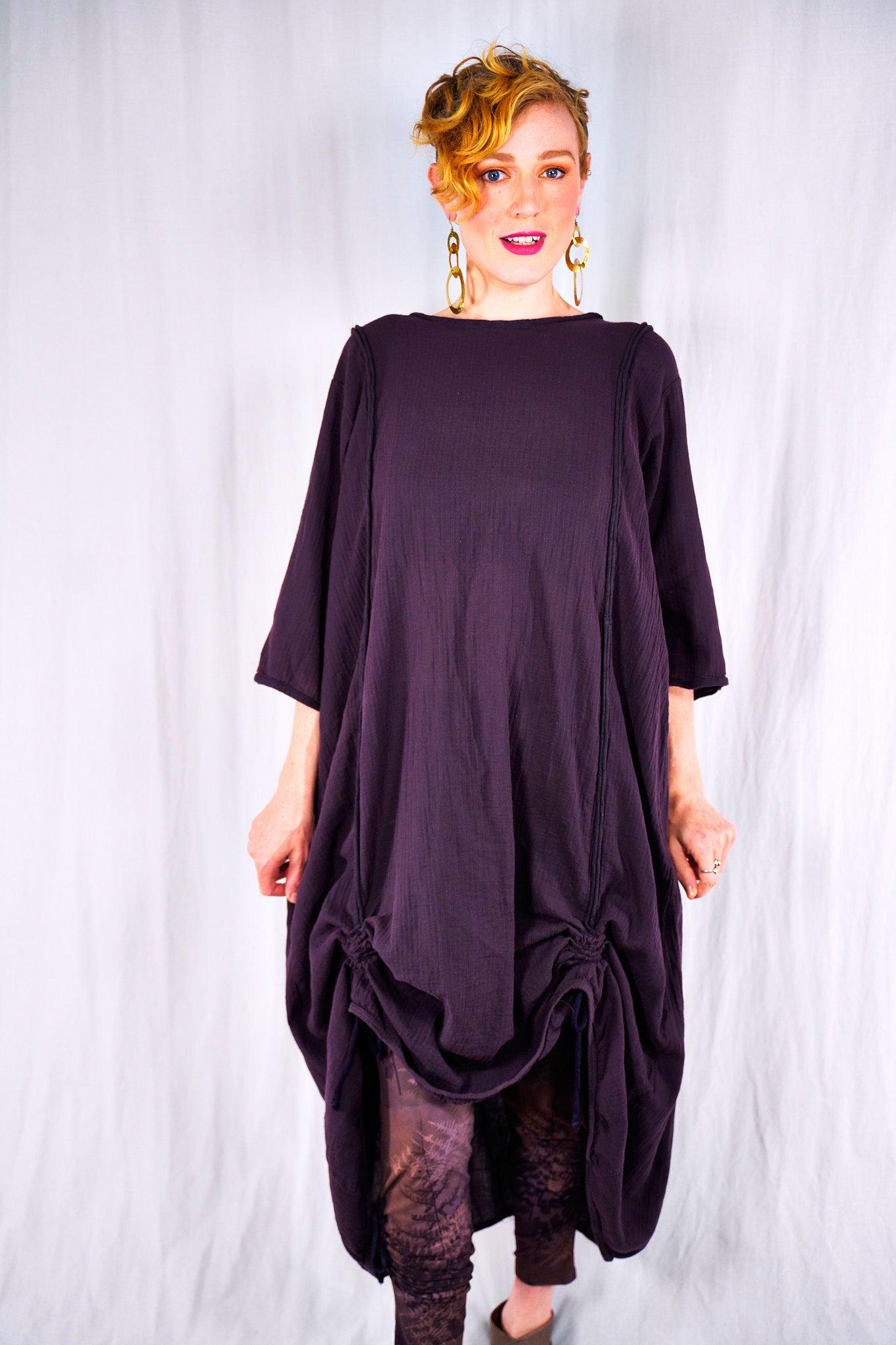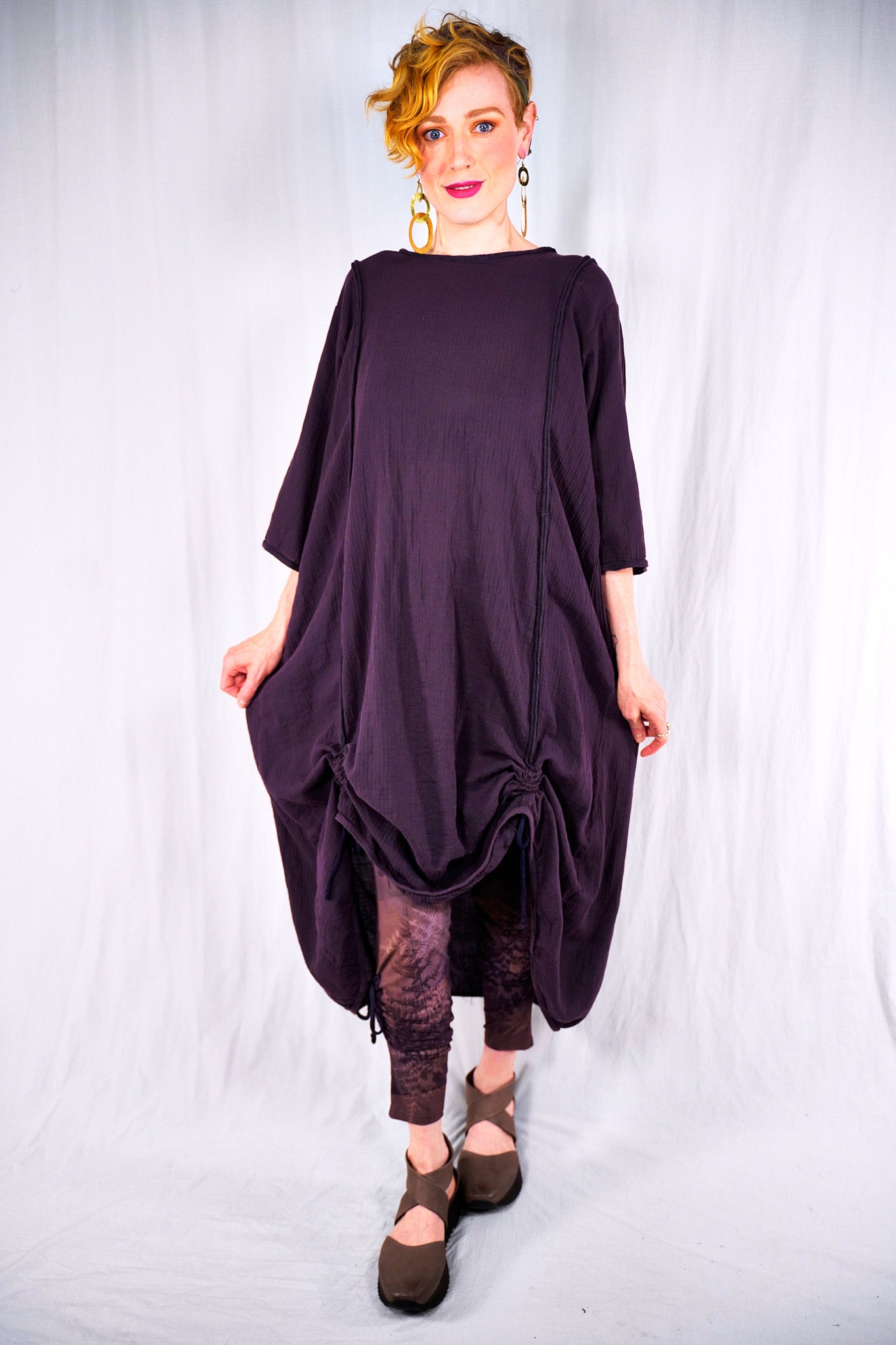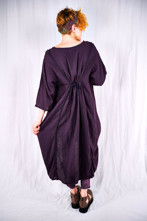 This 100% textured cotton dress with drawcords is very versatile. It is a finely woven cotton, more interesting than gauze with tiny windowpane checks woven into the fabric. Wear it alone, or layered under a midlayer or apron, you will always find a place for it. Shorten to a tunic, wear alone as a dress, or layer it up. It is so lightweight- it will keep you cool in the heat. Drawcords vertically to create interest and adjust length or wear assymetric looks; drawcord horizontally in back for shaping. raw details.