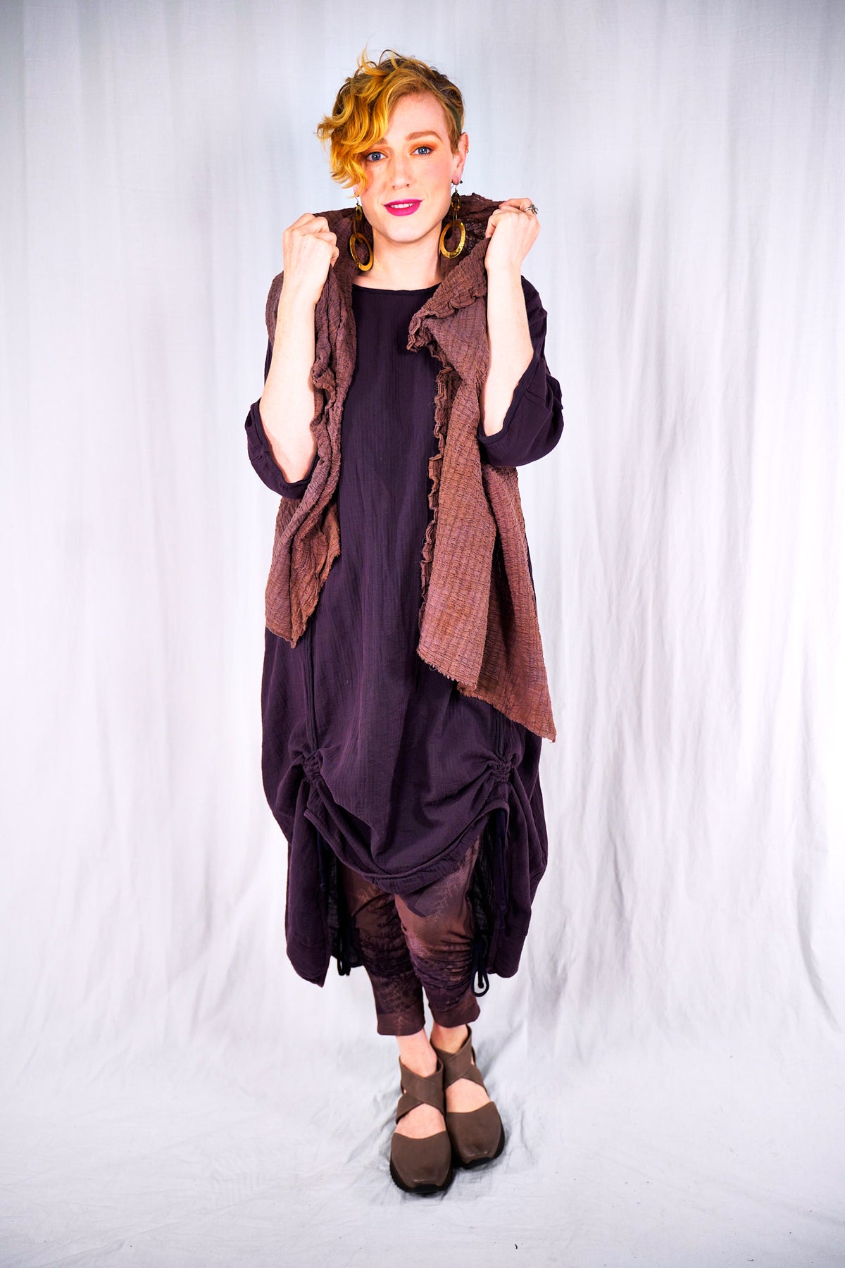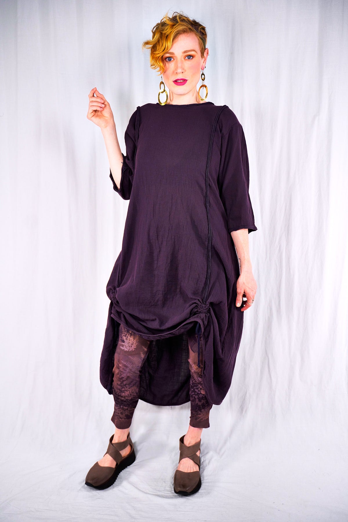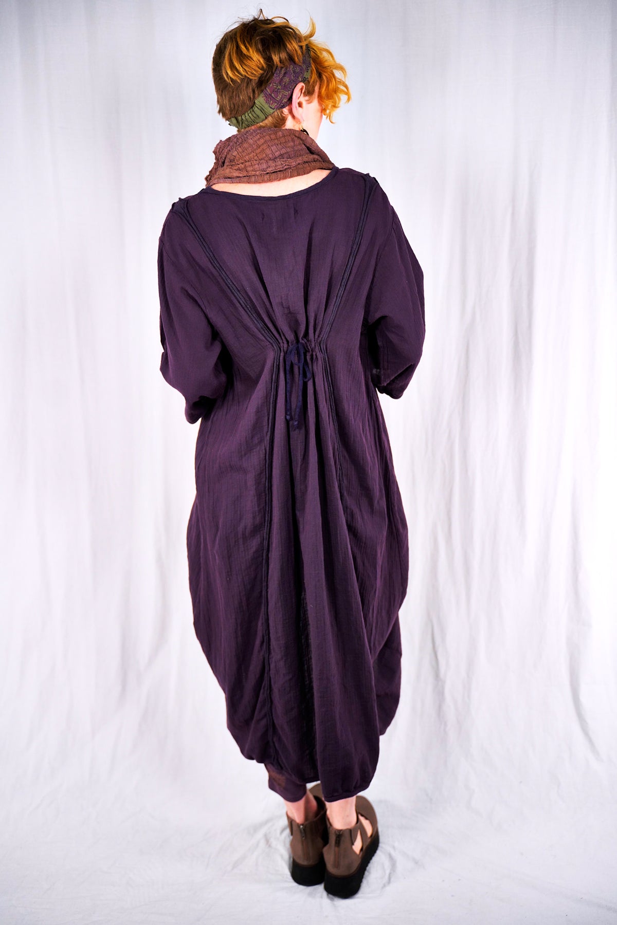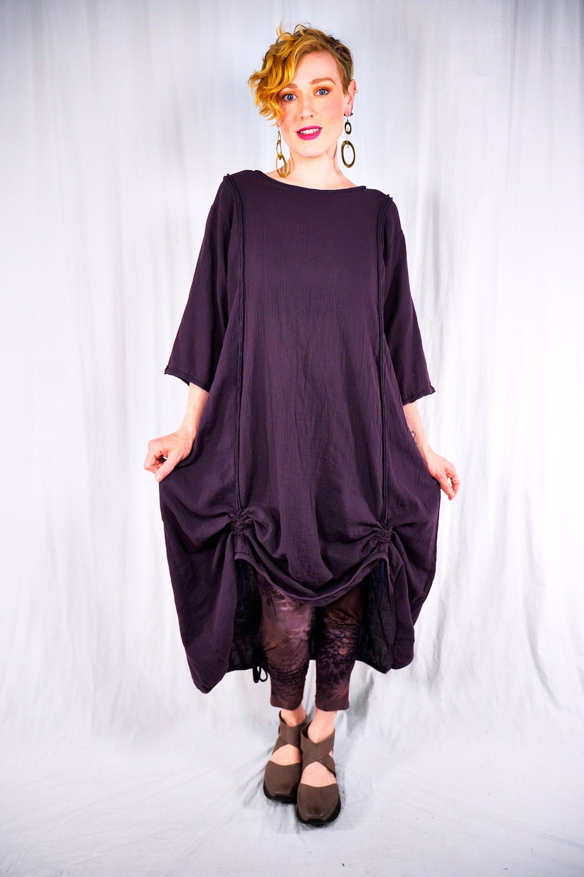 This 100% textured cotton dress with drawcords is very versatile. It is a finely woven cotton, more interesting than gauze with tiny windowpane checks woven into the fabric. Wear it alone, or layered under a midlayer or apron, you will always find a place for it. Shorten to a tunic, wear alone as a dress, or layer it up. It is so lightweight- it will keep you cool in the heat. Drawcords vertically to create interest and adjust length or wear assymetric looks; drawcord horizontally in back for shaping. raw details.