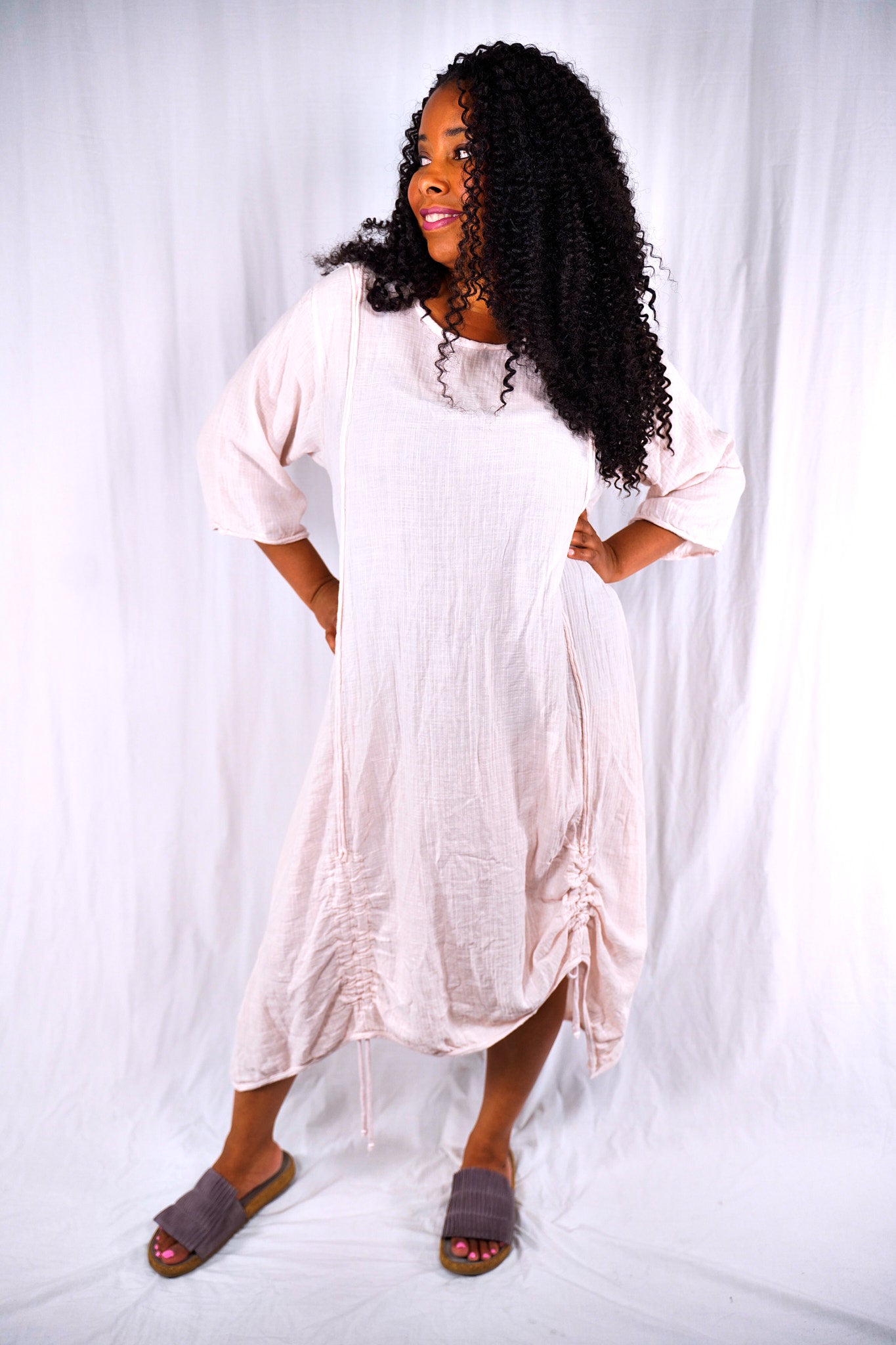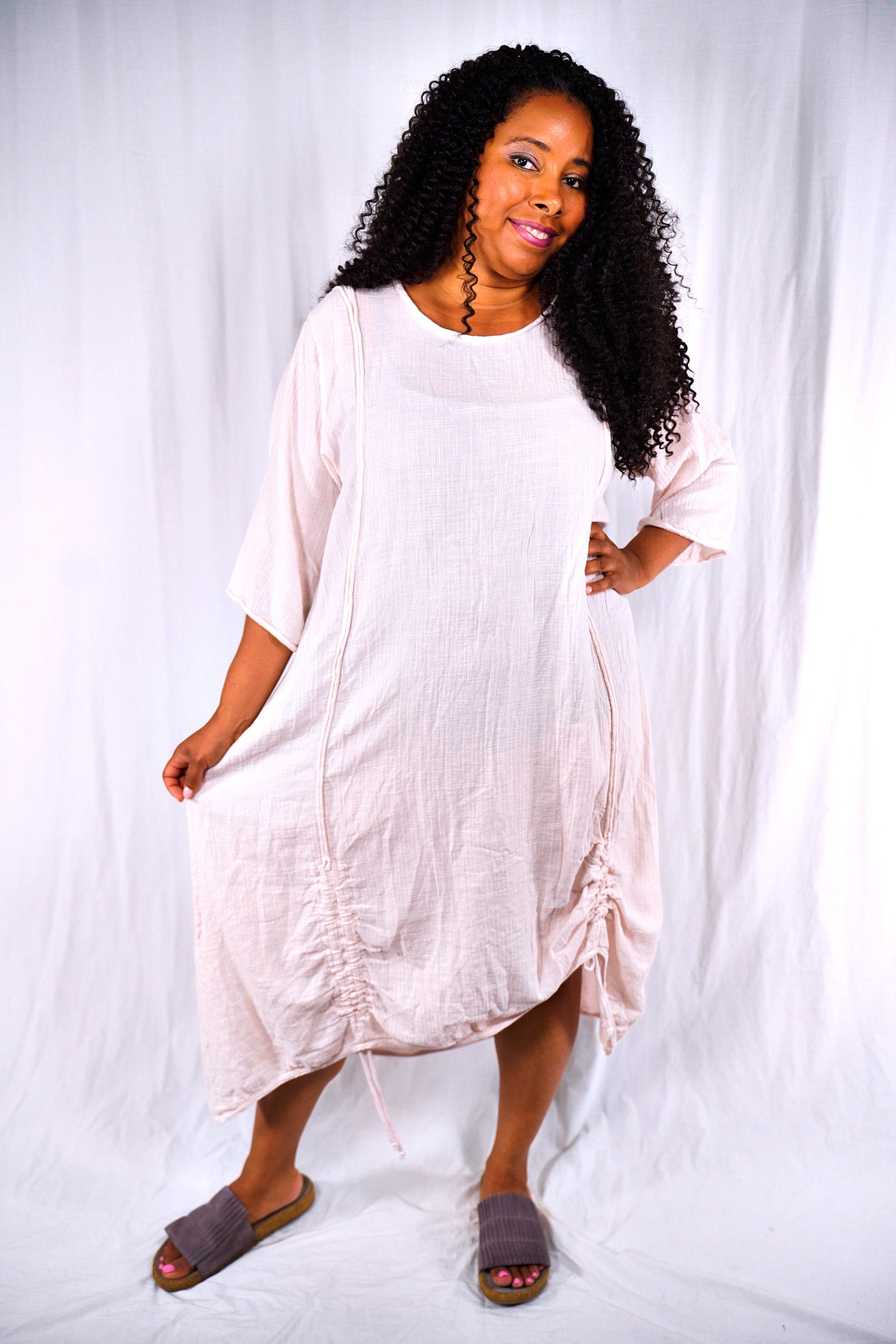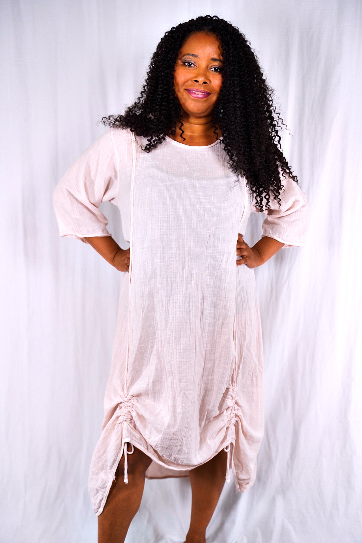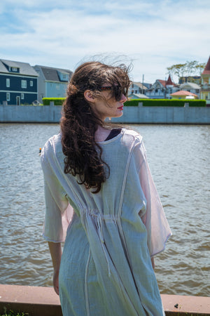 The dress on the left- looks almost white- billowy and cool, with drawstrings. "Translucent" that is actually a very beautiful pale pink- mixes easily with pure white, soft greys or our color Oriel, a nude pink.