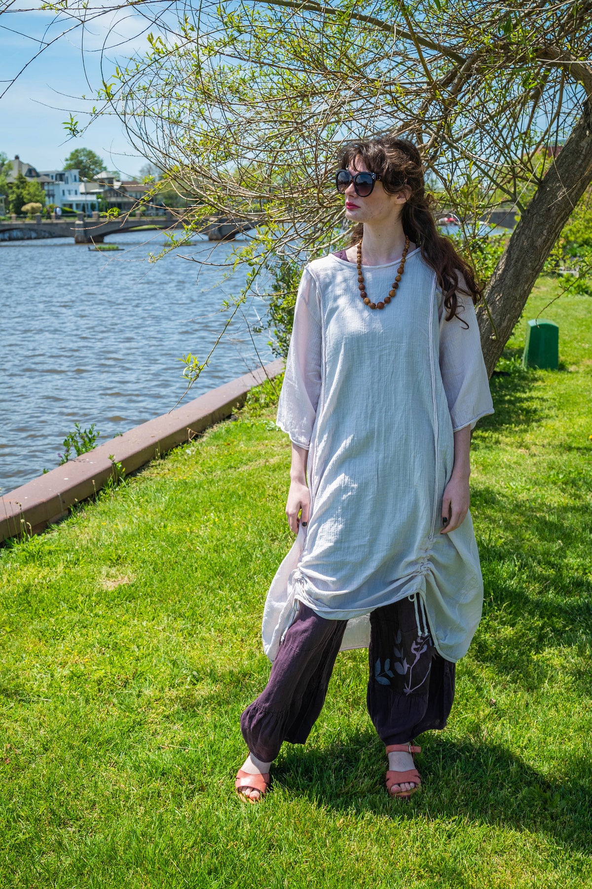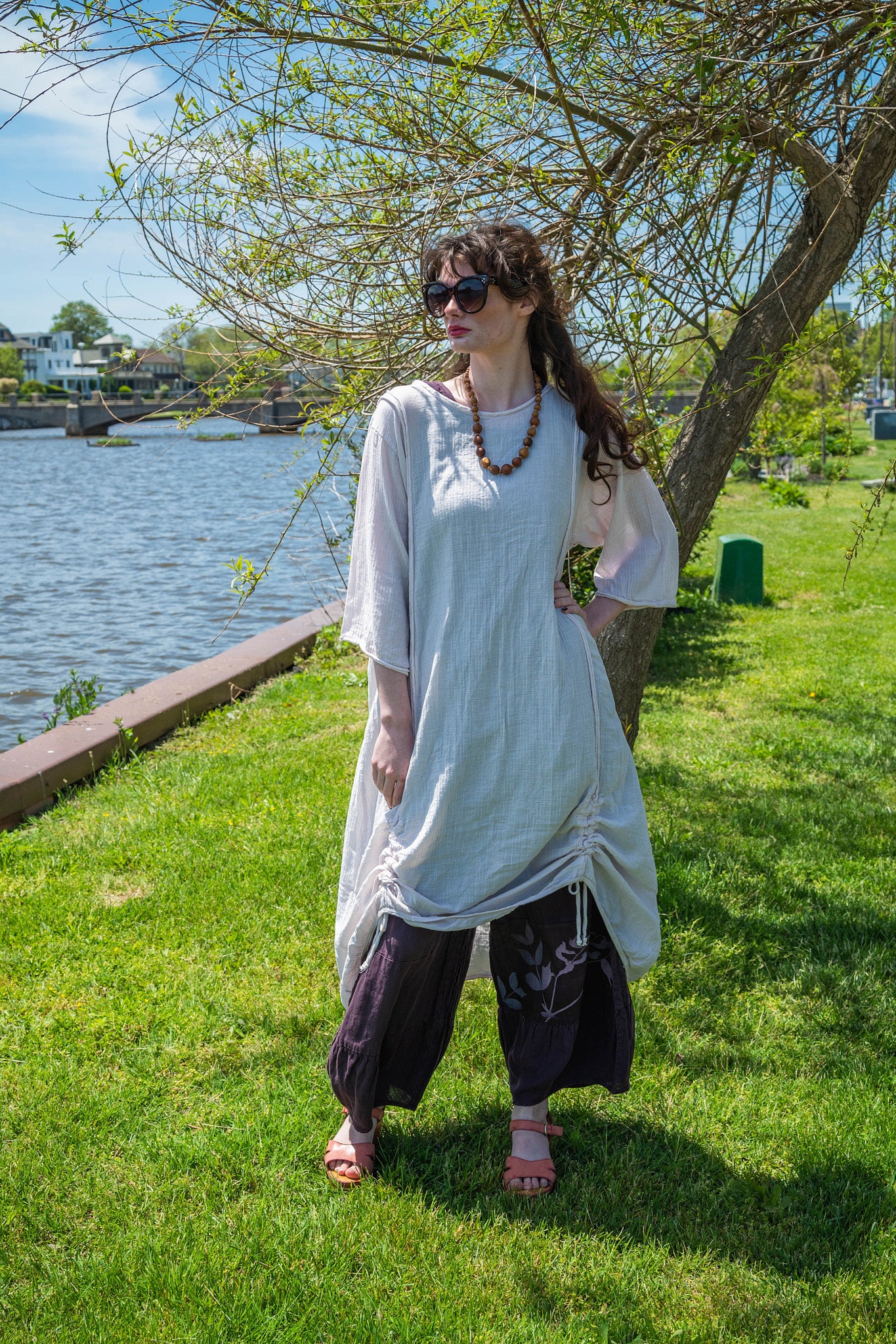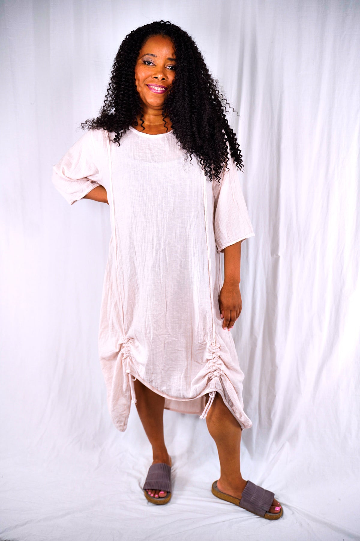 The dress on the left- looks almost white- billowy and cool, with drawstrings. "Translucent" that is actually a very beautiful pale pink- mixes easily with pure white, soft greys or our color Oriel, a nude pink.