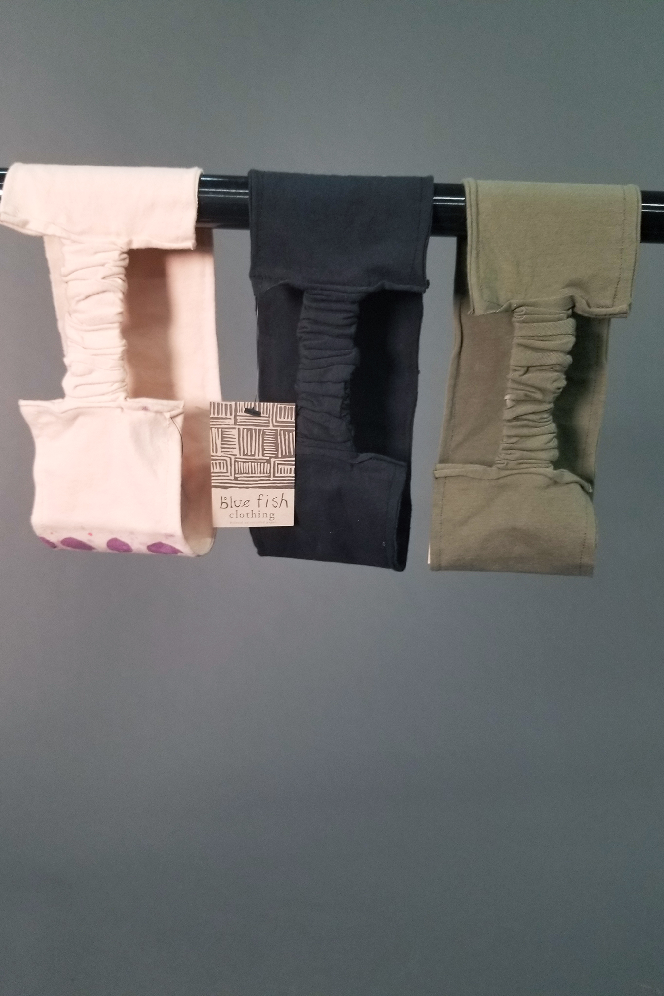 A beautiful circle of delight from our studio artists. This hand-printed, USA made organic cotton headband adds a touch of artistry to every ensemble. Layered imagery is truly beautiful and will coordinate with many outfits. A priceless Blue Fish treasure to add to your collection!