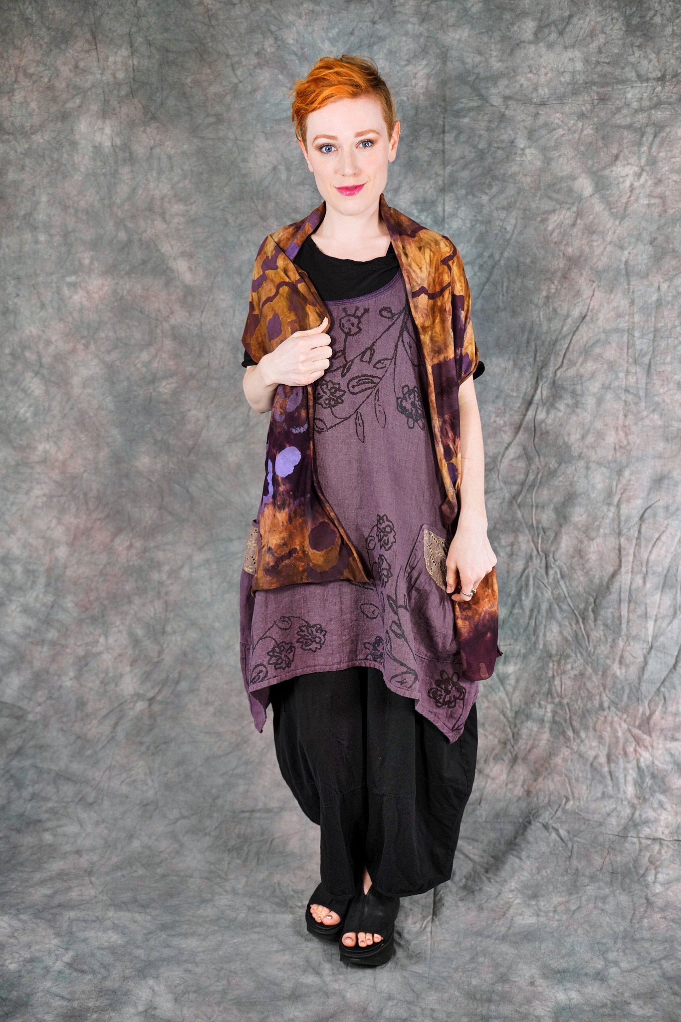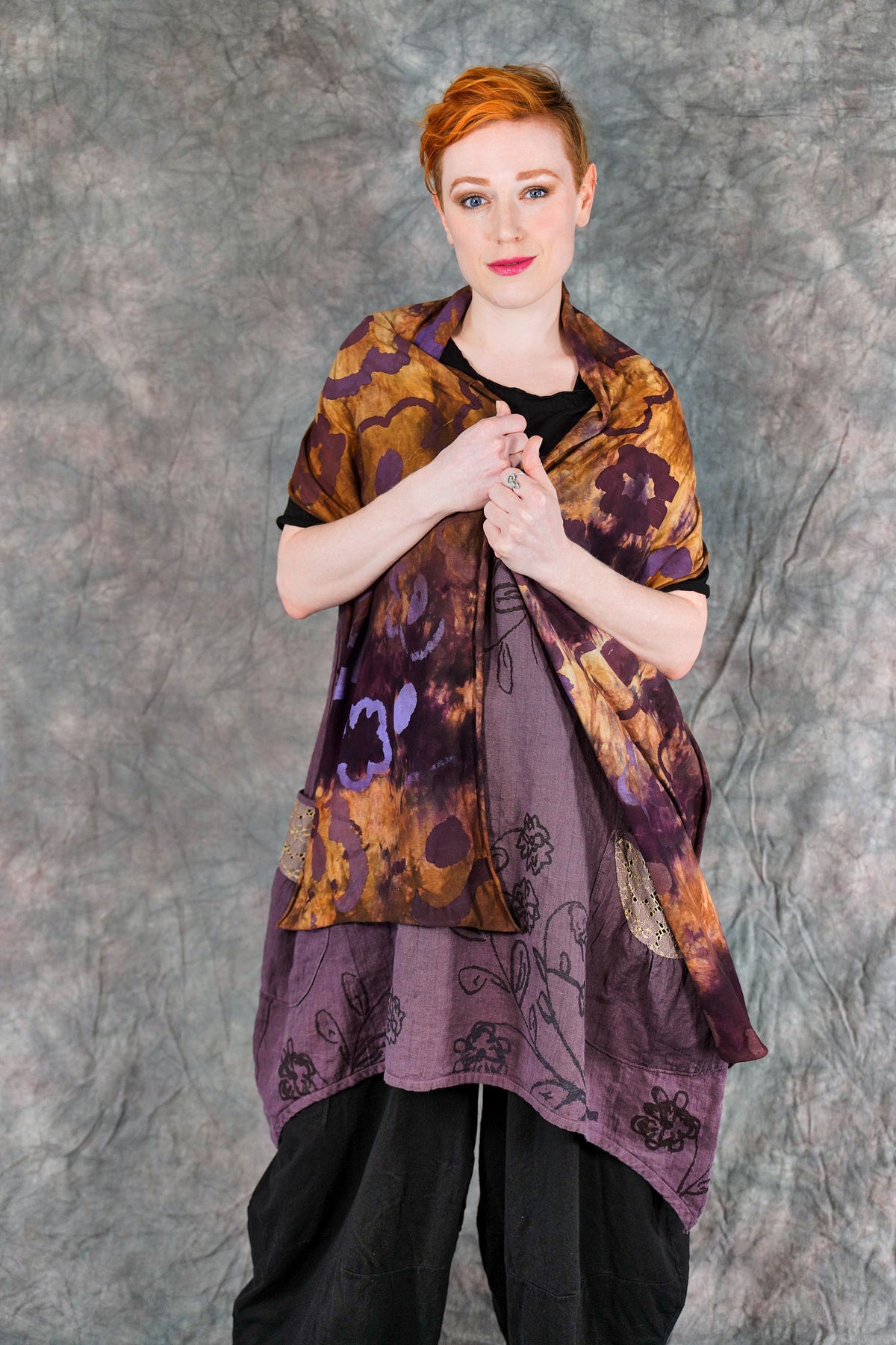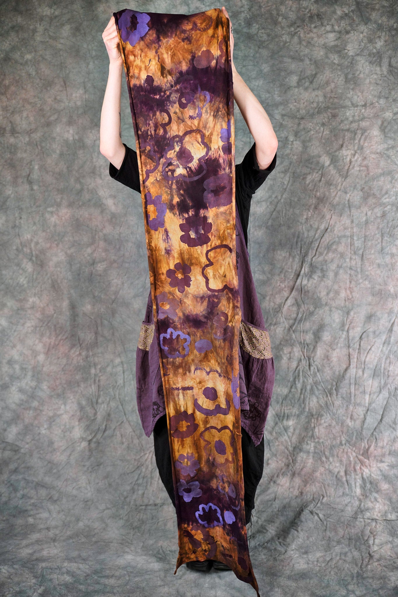 A beautiful scarf made of our favorite organic jersey material. Look closely--the colorful seams on this are sewn at an angle, adding unique visual interest! Intricate hand-printed art inspired adds delight and detail to every ensemble.