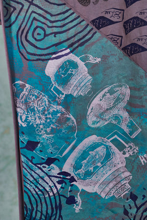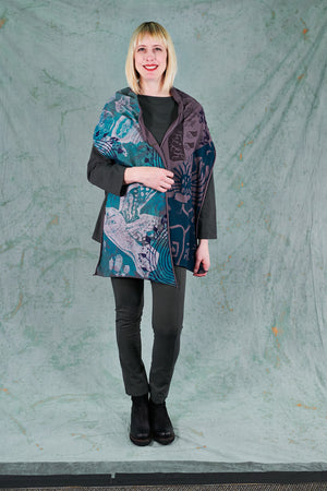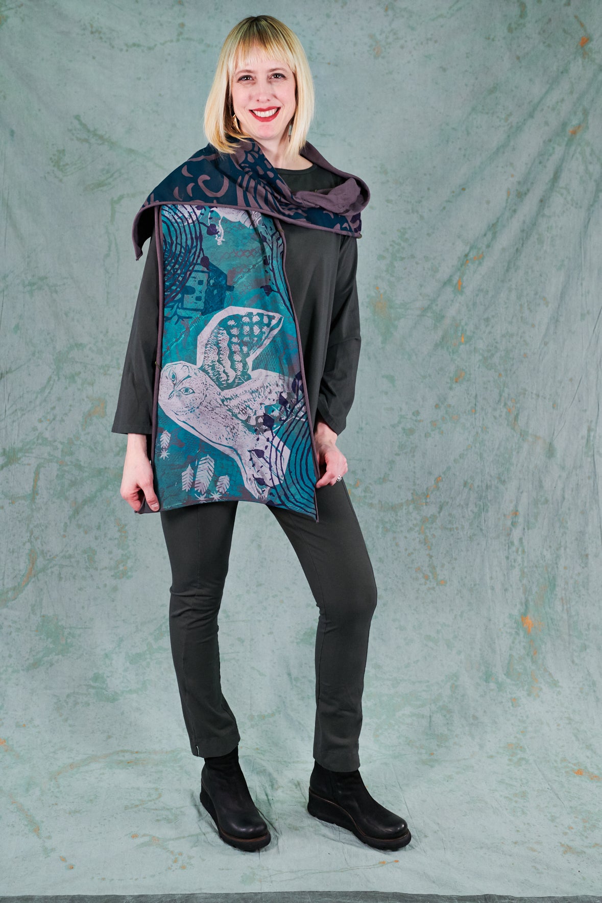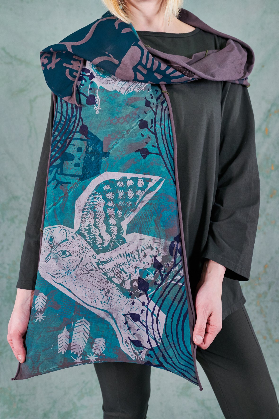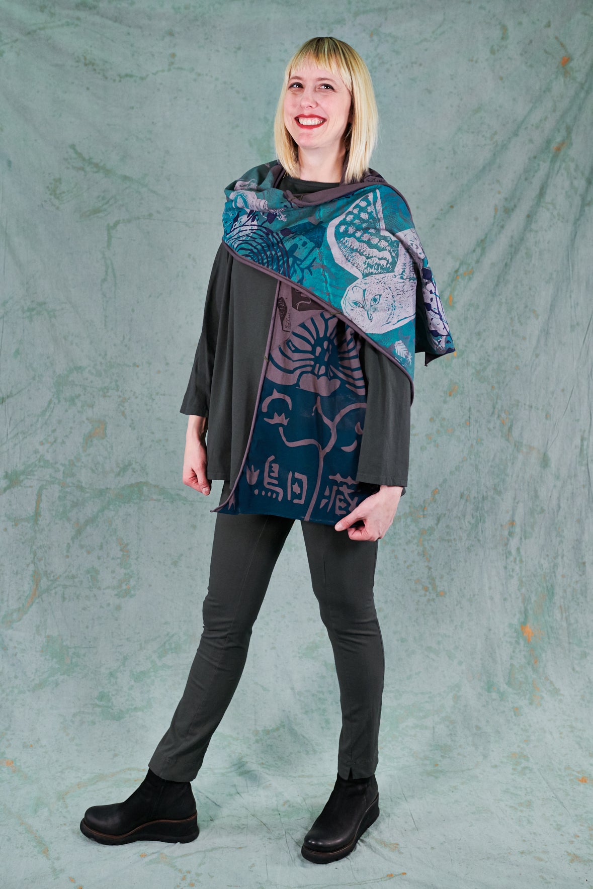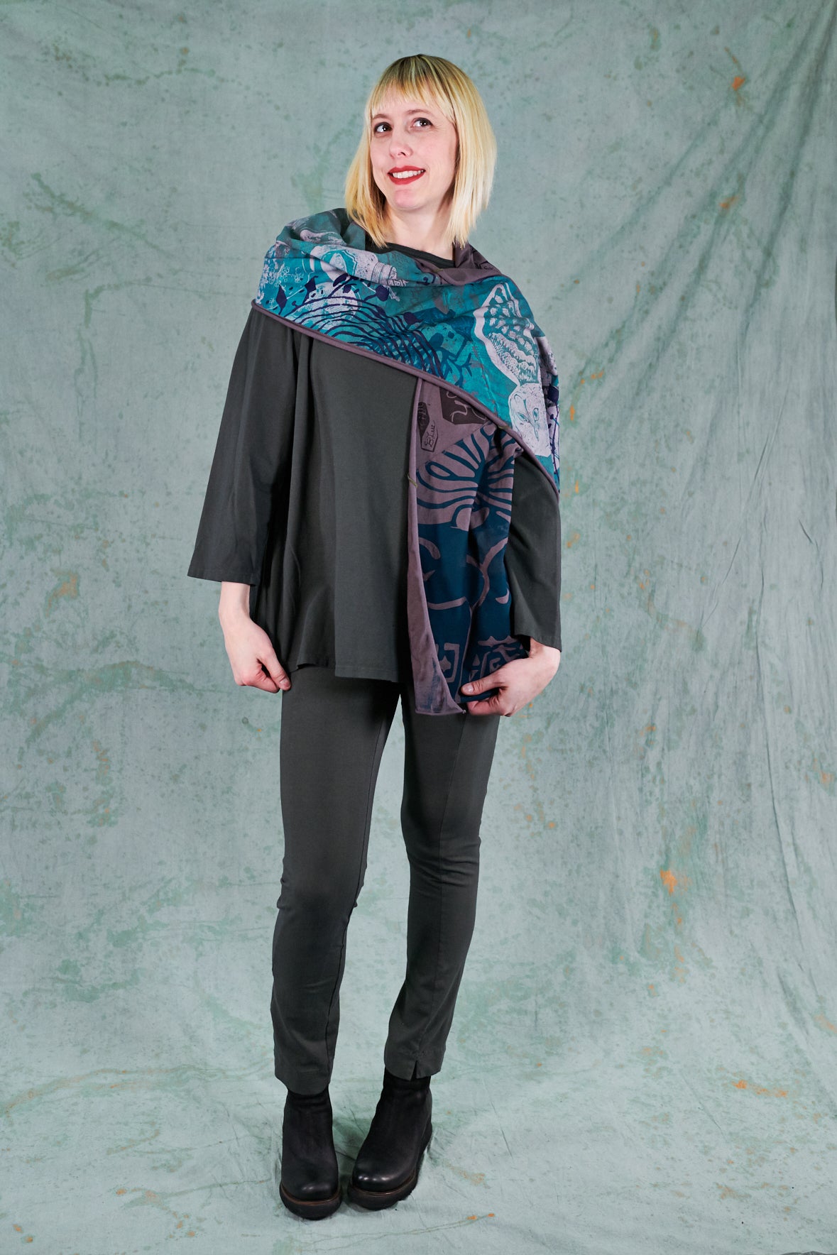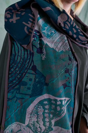 A beautiful scarf made of our favorite organic jersey material. Look closely--the colorful seams on this are sewn at an angle, adding unique visual interest! Intricate hand-printed art inspired adds delight and detail to every ensemble.