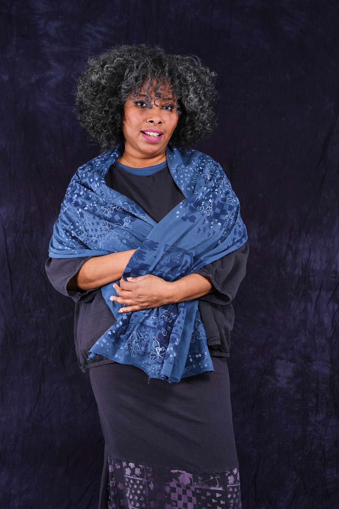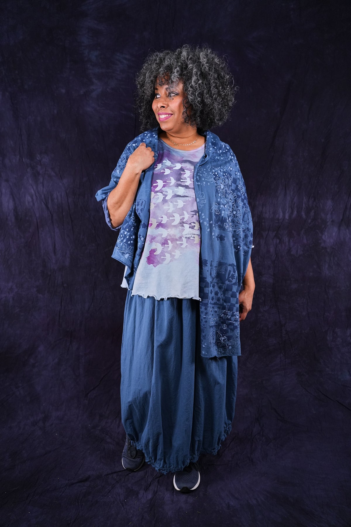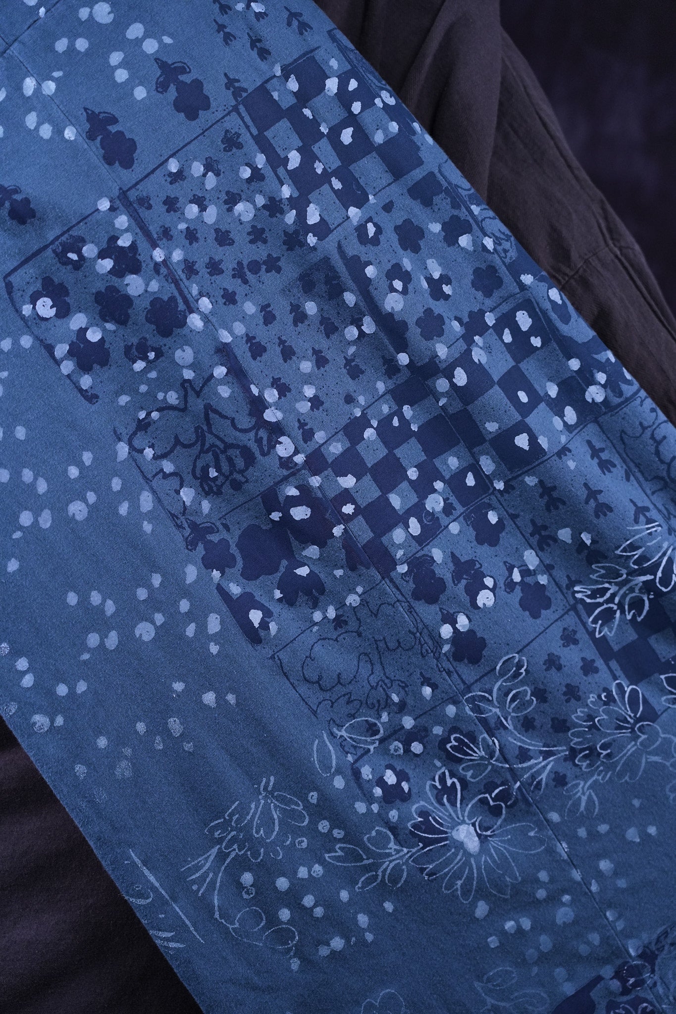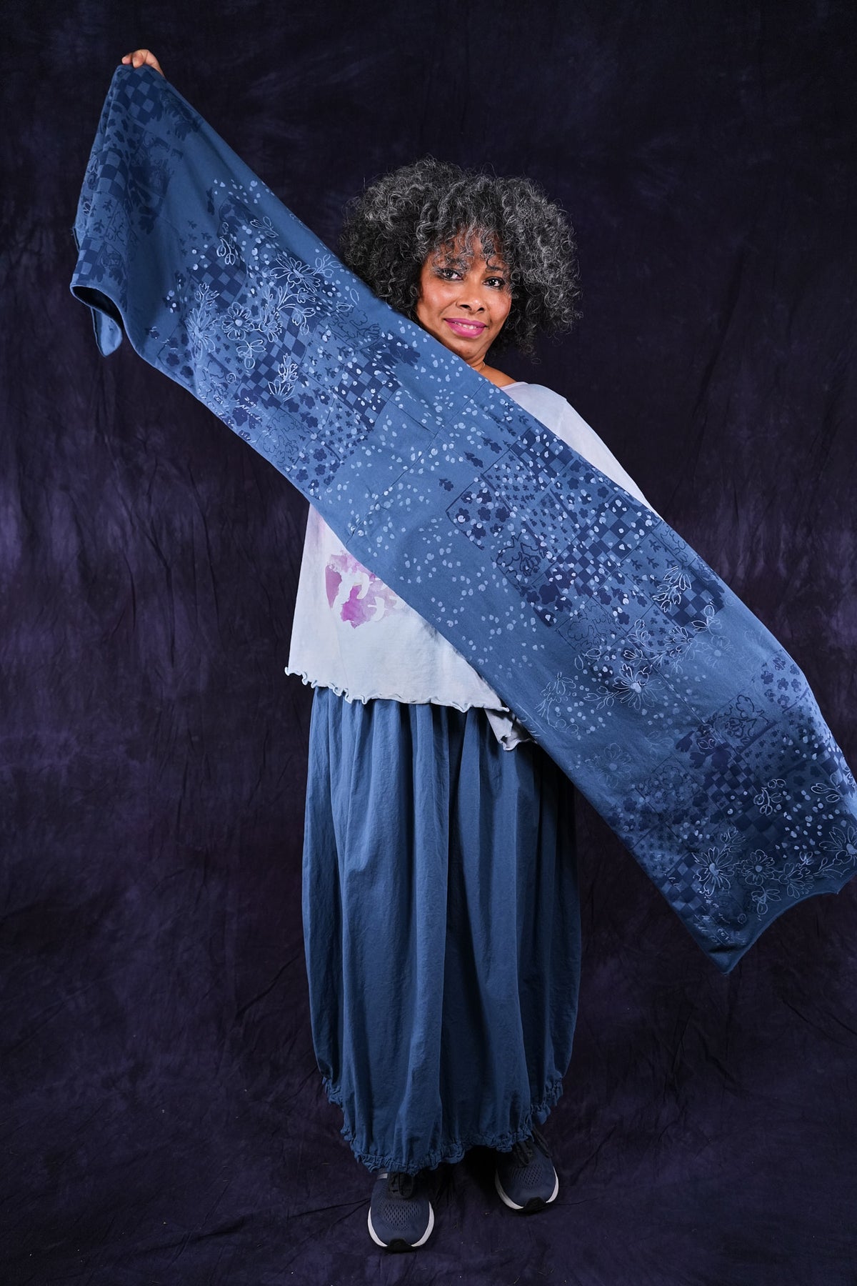 Organic scarf/wrap in generous proportions covered with layered hand prints in multiple colors. Some people make other items from our scarves- like pillows, or patches...you get a lot of print beauty in one of these pieces. Use as a table runner. Wrap as a layer over a skirt. Keep in your car for the days you need a little buffer from the cool air. Let your imagination play- what would you use this for?