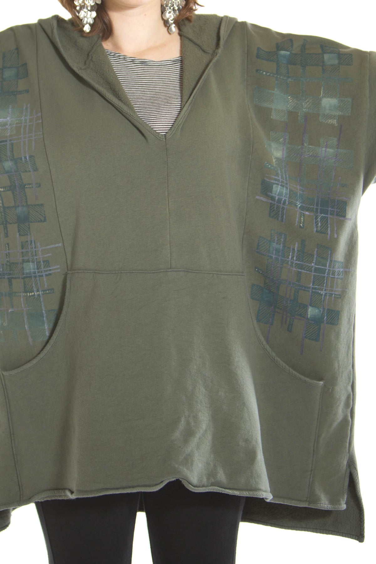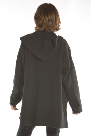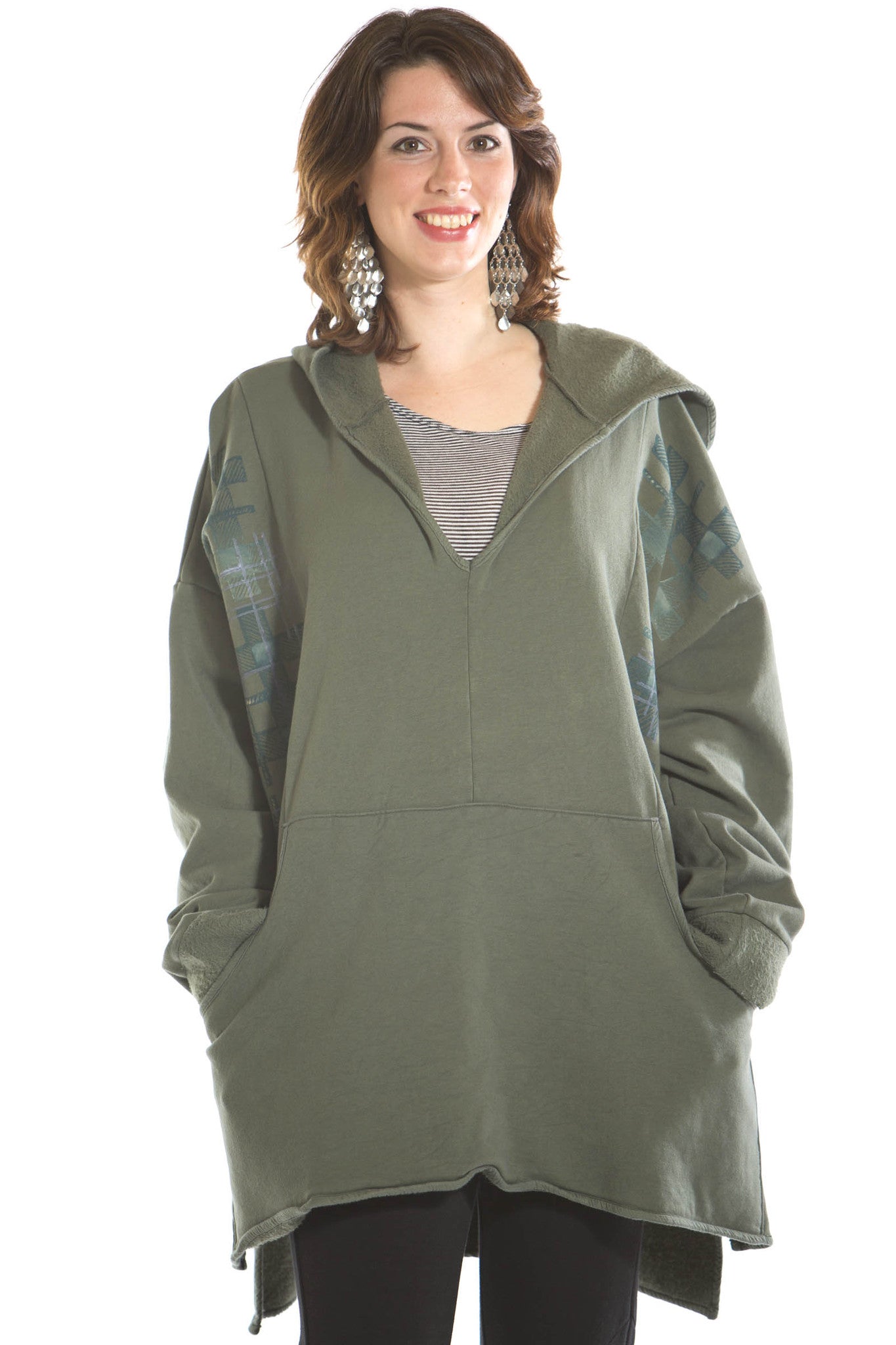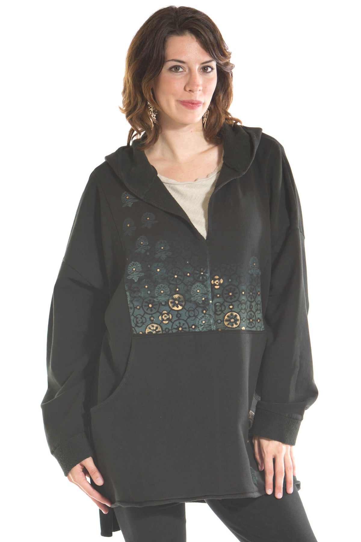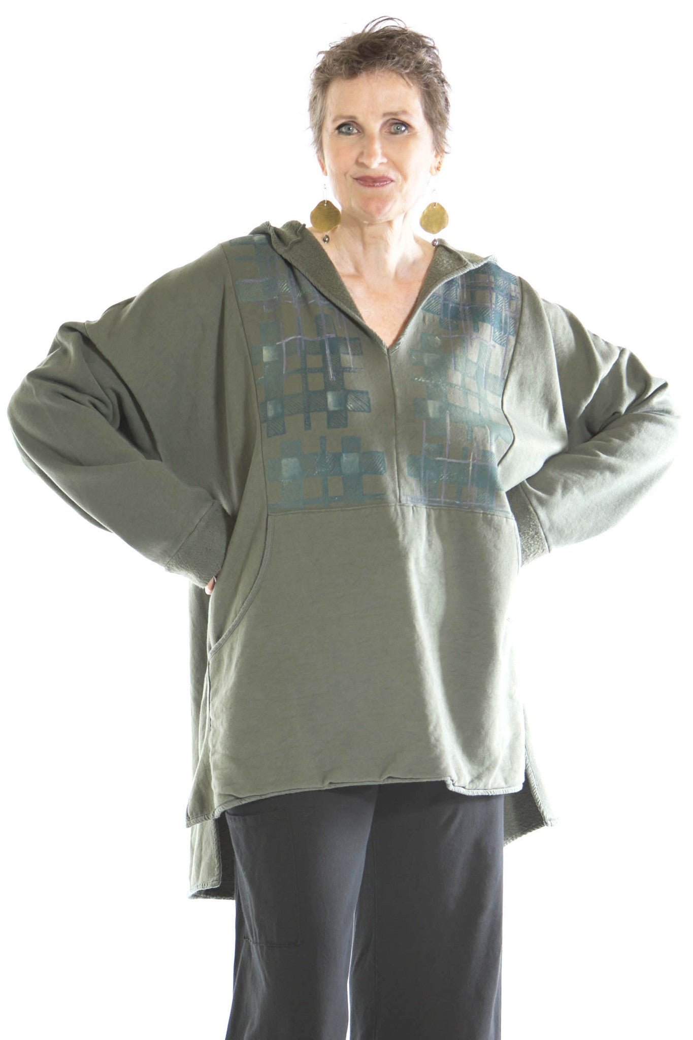 Here is a colorful organic fleece hoodie with front pouch pocket for the changing weather. Wear indoors or out, our soft organic cotton with a bit of stretch feels good all the time. Hi-Lo hem, slightly longer in the back. Fleece cuffs. Hand-warmer front pocket.