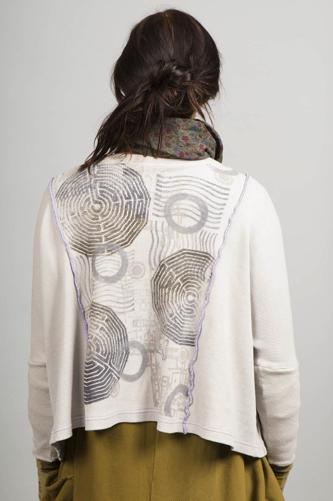 A darling little square cardigan with tapered sleeves and contrast stitching! Two pockets at the hip and 5 wooden buttons complete the look. A perfect over layer for longer tees, it is equally cute buttoned or worn open.