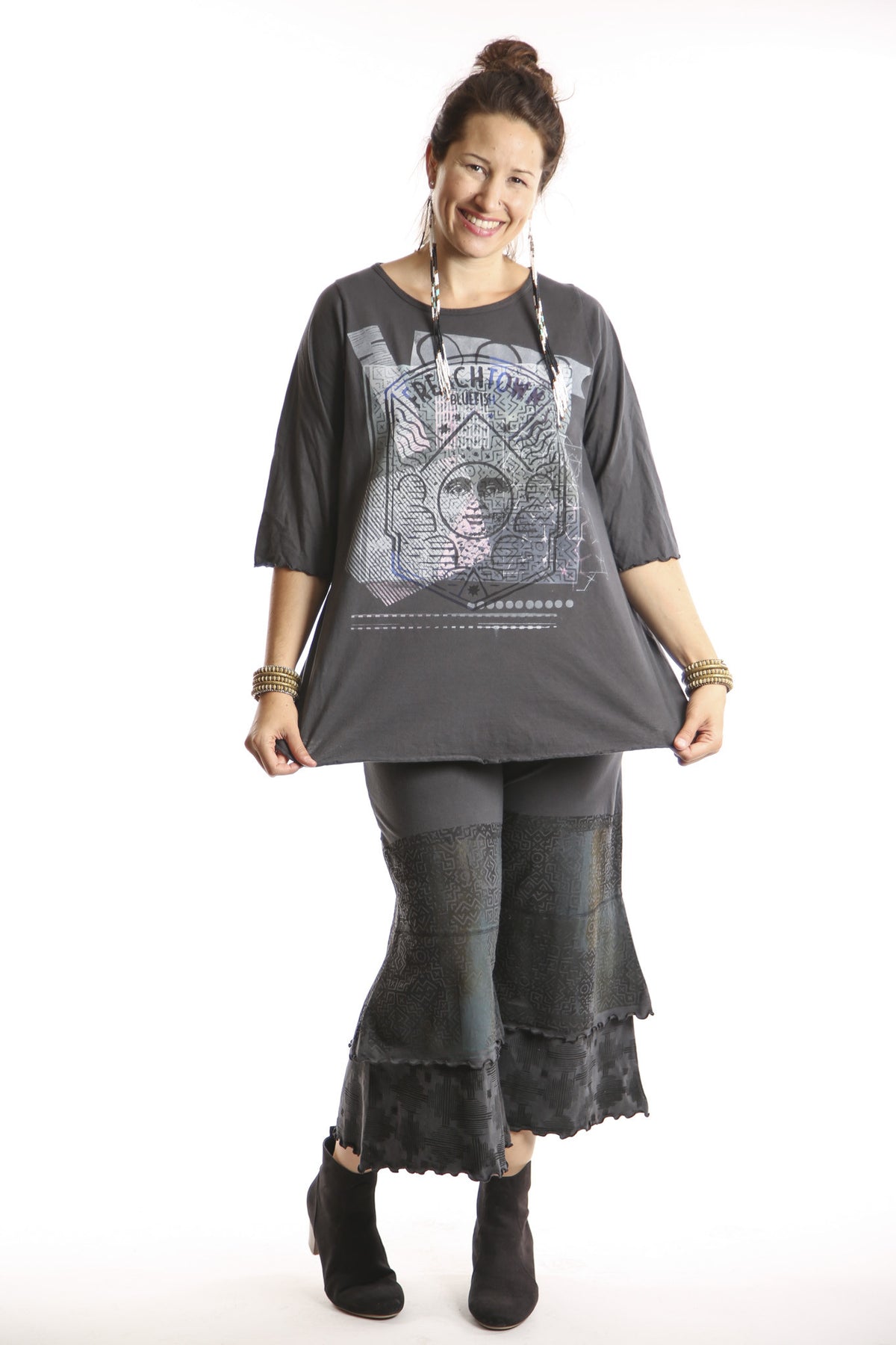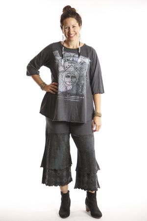 Your favorite café tee style with lettuce-edged finish at hem and elbows. Perfect weight organic cotton, somewhere in between tissue and our heavier weight studio tee fabric. This longer top has the characteristic A-line swing, wide at the bottom. A great piece because it can be layered or worn alone. Available printed or unprinted. The printed version transforms this top into a singular artful garment.