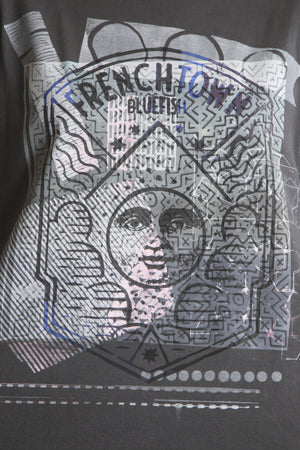 This print celebrates our Frenchtown location, where our store has stood in an old stone mill since 1987. Frenchtown is a riverside town, and I first started selling my tee shirts long ago just in front of the Full Moon Cafe in a nearby town. This design pulls together the moon, the town, and celebrates our fondness for art with textured and colorful accents in the imagery.