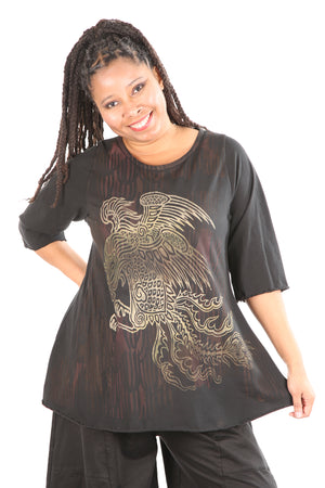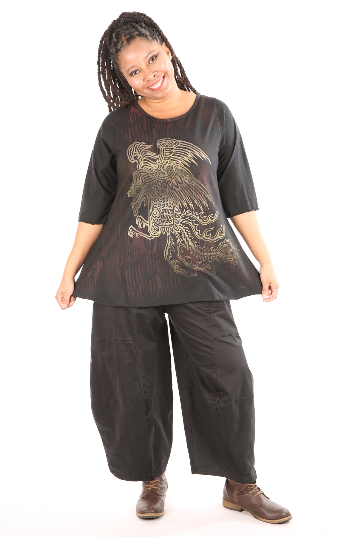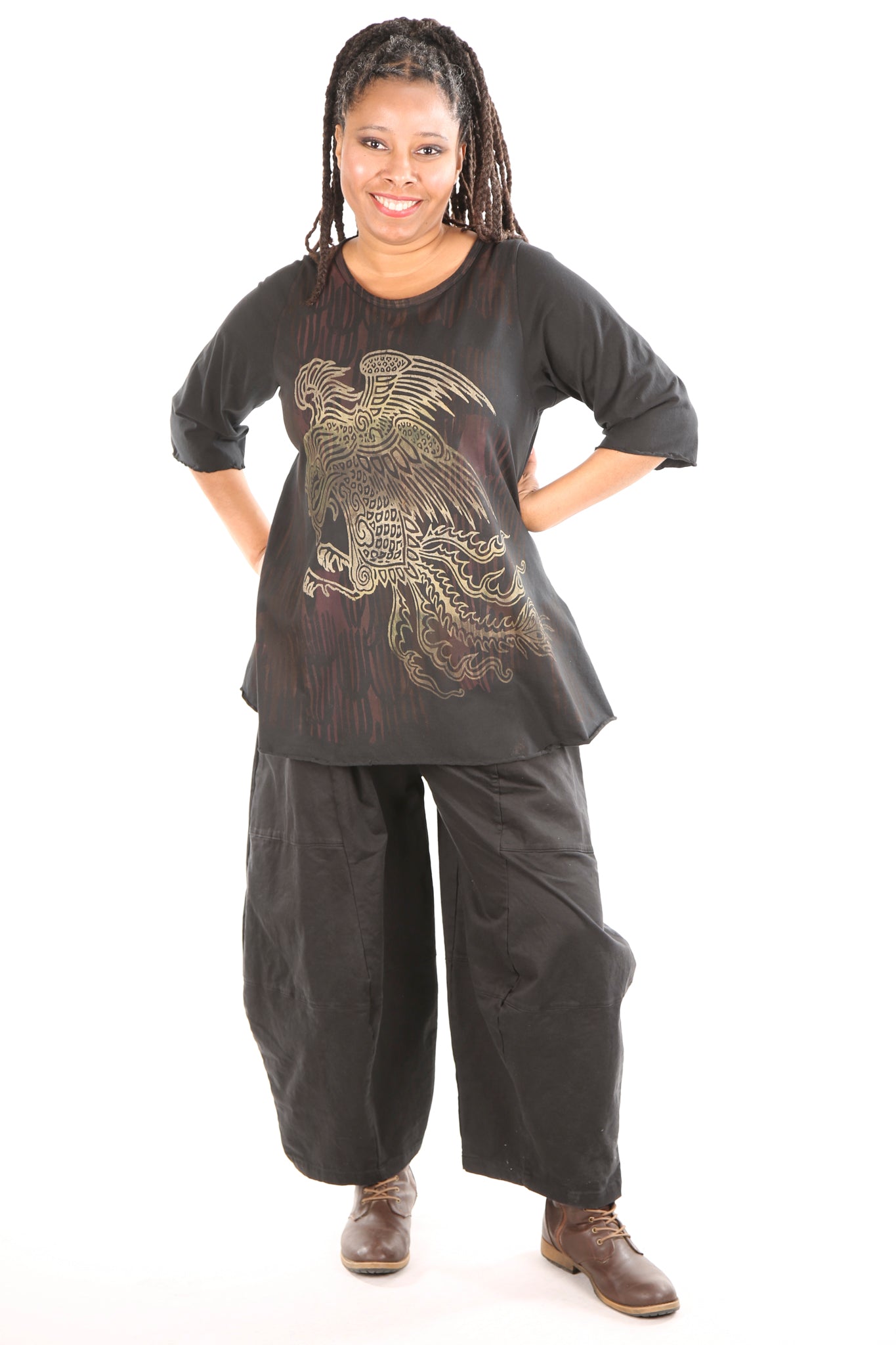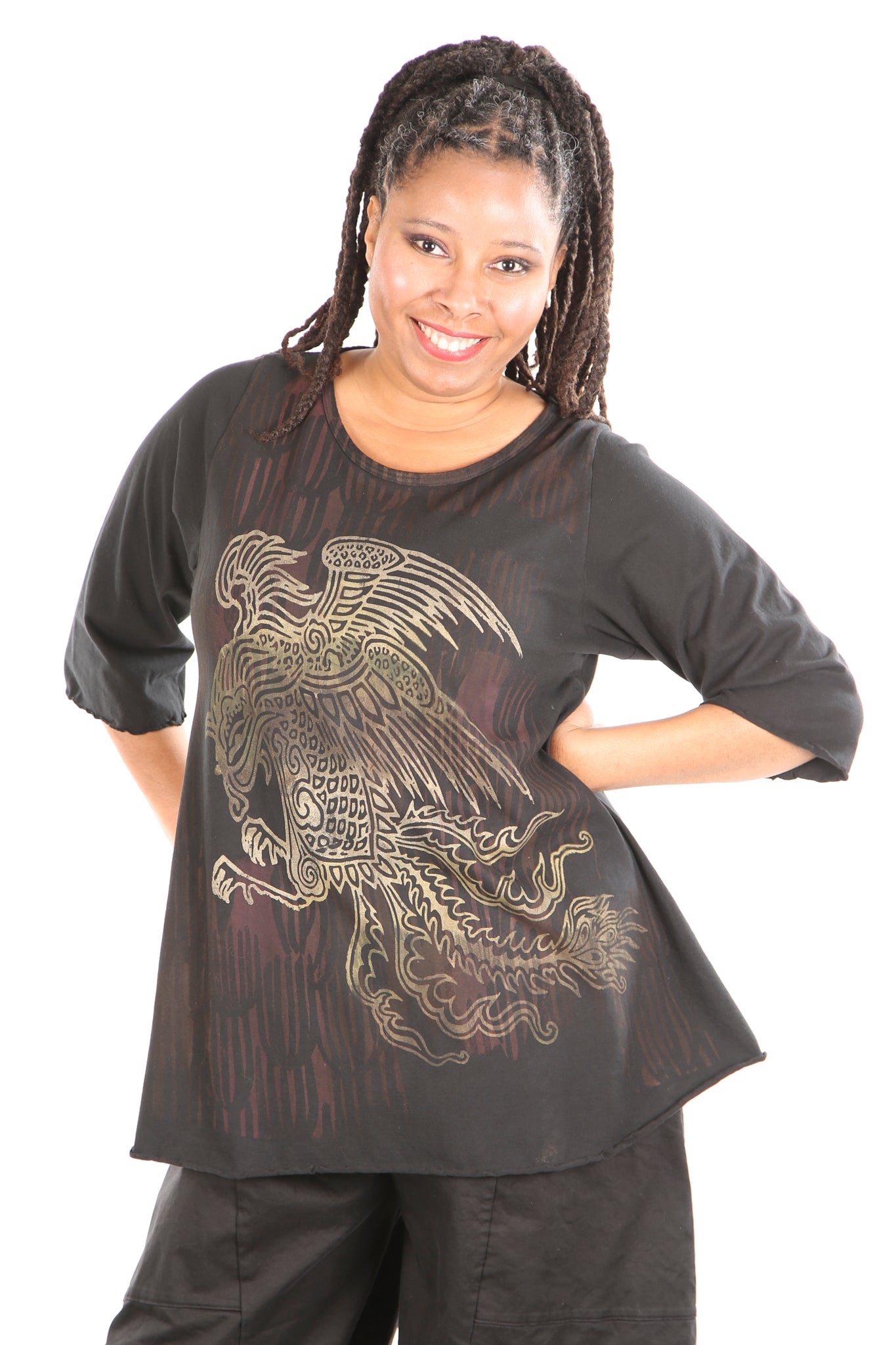 Your favorite café tee style with sleeves to just past the elbow. Lettuce-edged finish at hem and sleeves. Perfect lightweight organic cotton, somewhere in between tissue and our heavier weight studio tee fabric. This top has the characteristic A-line swing, wide at the bottom. A great piece because it can be layered or worn alone. 100% Organic Lightweight Cotton Jersey