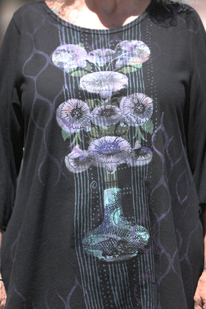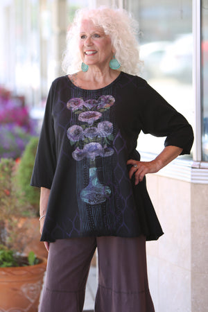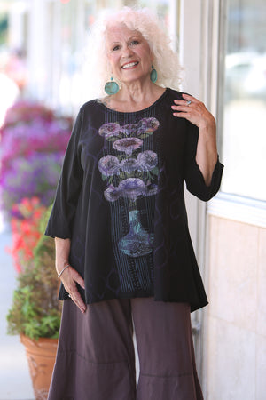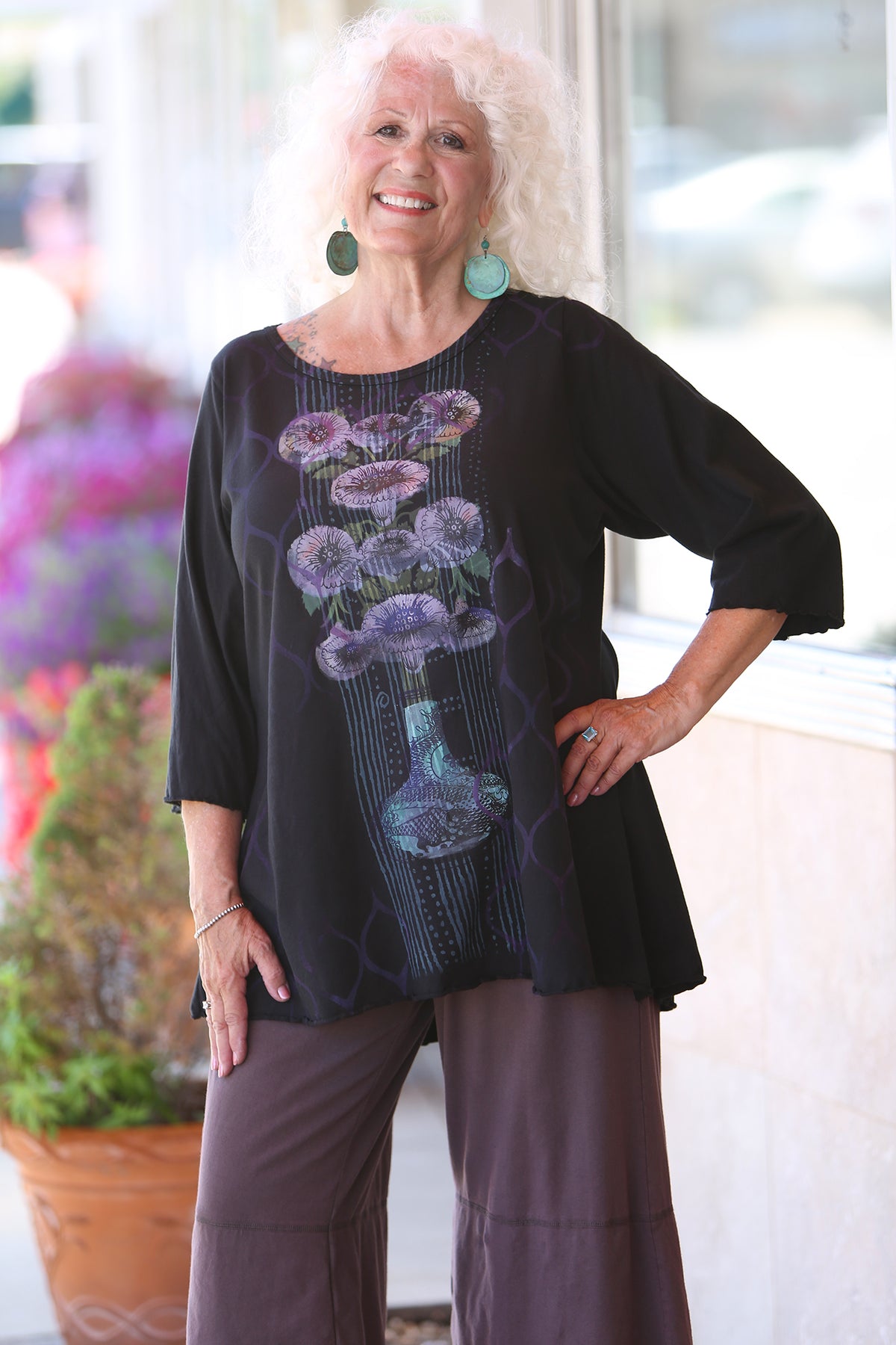 Your favorite café tee style with lettuce-edged finish at hem and elbows. Perfect weight organic cotton, somewhere in between tissue and our heavier weight studio tee fabric. This longer top has the characteristic A-line swing, wide at the bottom. A great piece because it can be layered or worn alone. The printed version transforms this top into a singular artful garment.