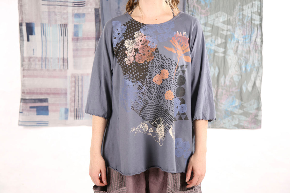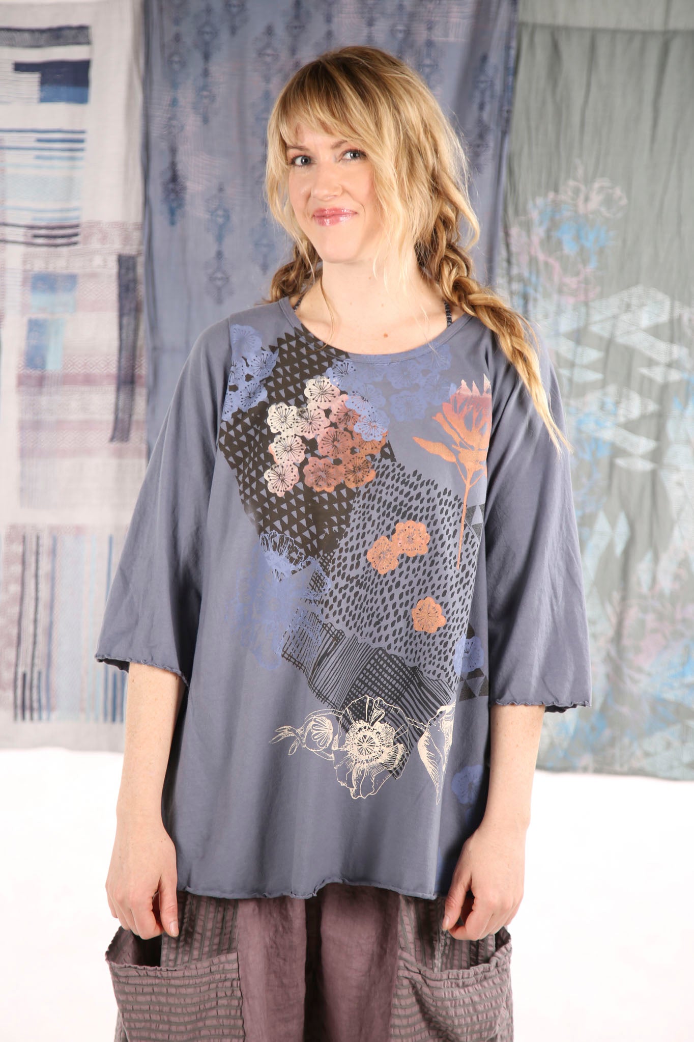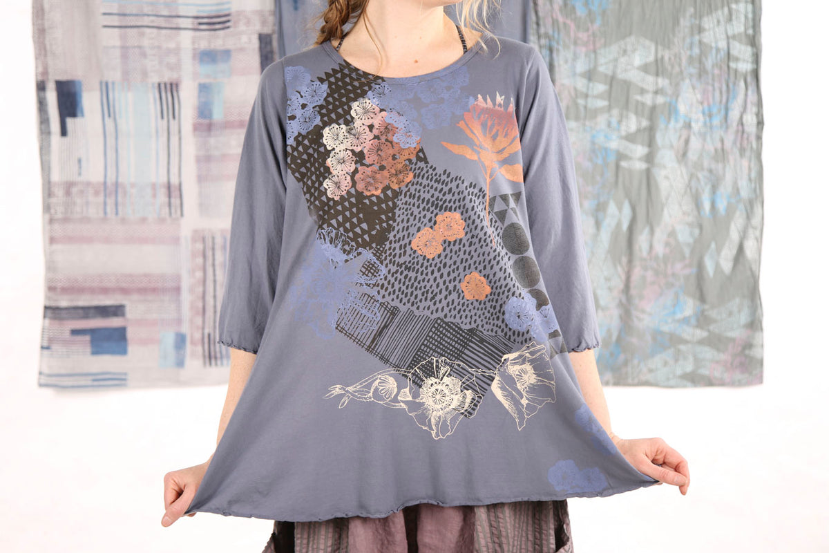 Your favorite café tee style with lettuce-edged finish at hem and elbows. Perfect weight organic cotton, somewhere in between tissue and our heavier weight studio tee fabric. This longer top has the characteristic A-line swing, wide at the bottom. A great piece because it can be layered or worn alone. Available printed or unprinted. The printed version transforms this top into a singular artful garment.