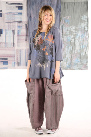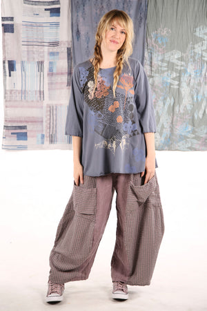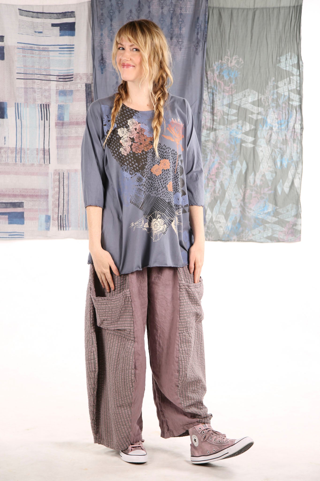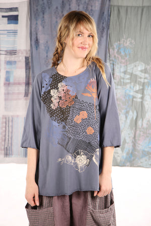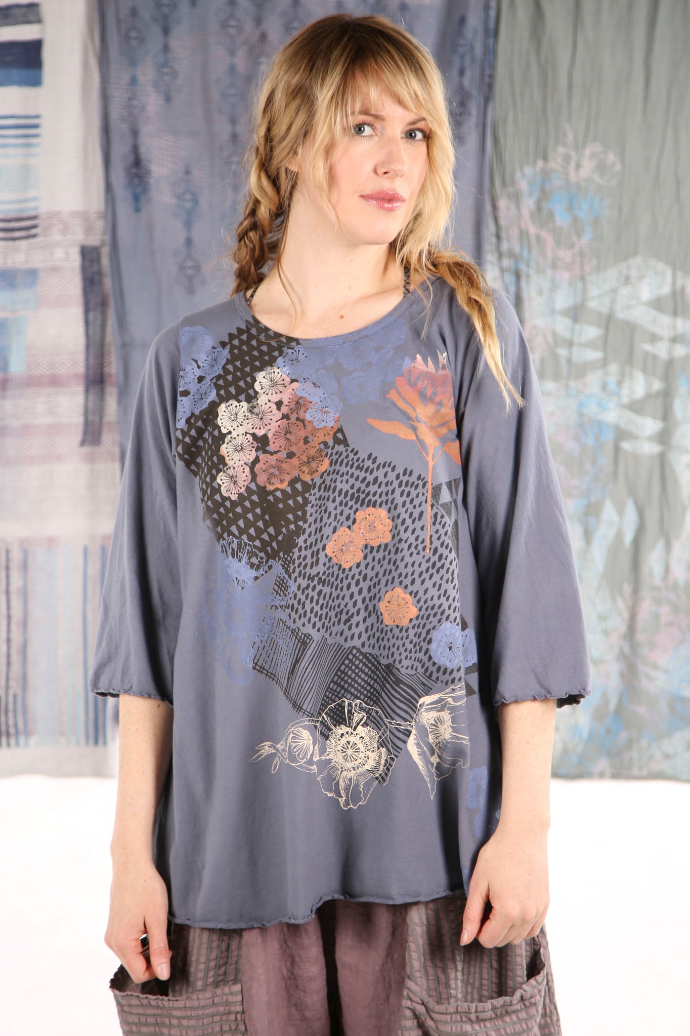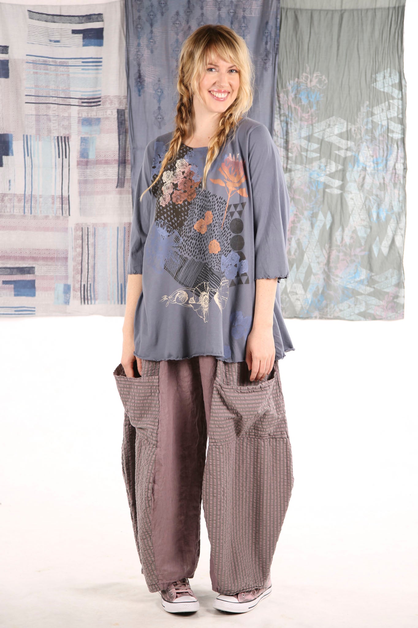 Your favorite café tee style with lettuce-edged finish at hem and elbows. Perfect weight organic cotton, somewhere in between tissue and our heavier weight studio tee fabric. This longer top has the characteristic A-line swing, wide at the bottom. A great piece because it can be layered or worn alone. Available printed or unprinted. The printed version transforms this top into a singular artful garment.