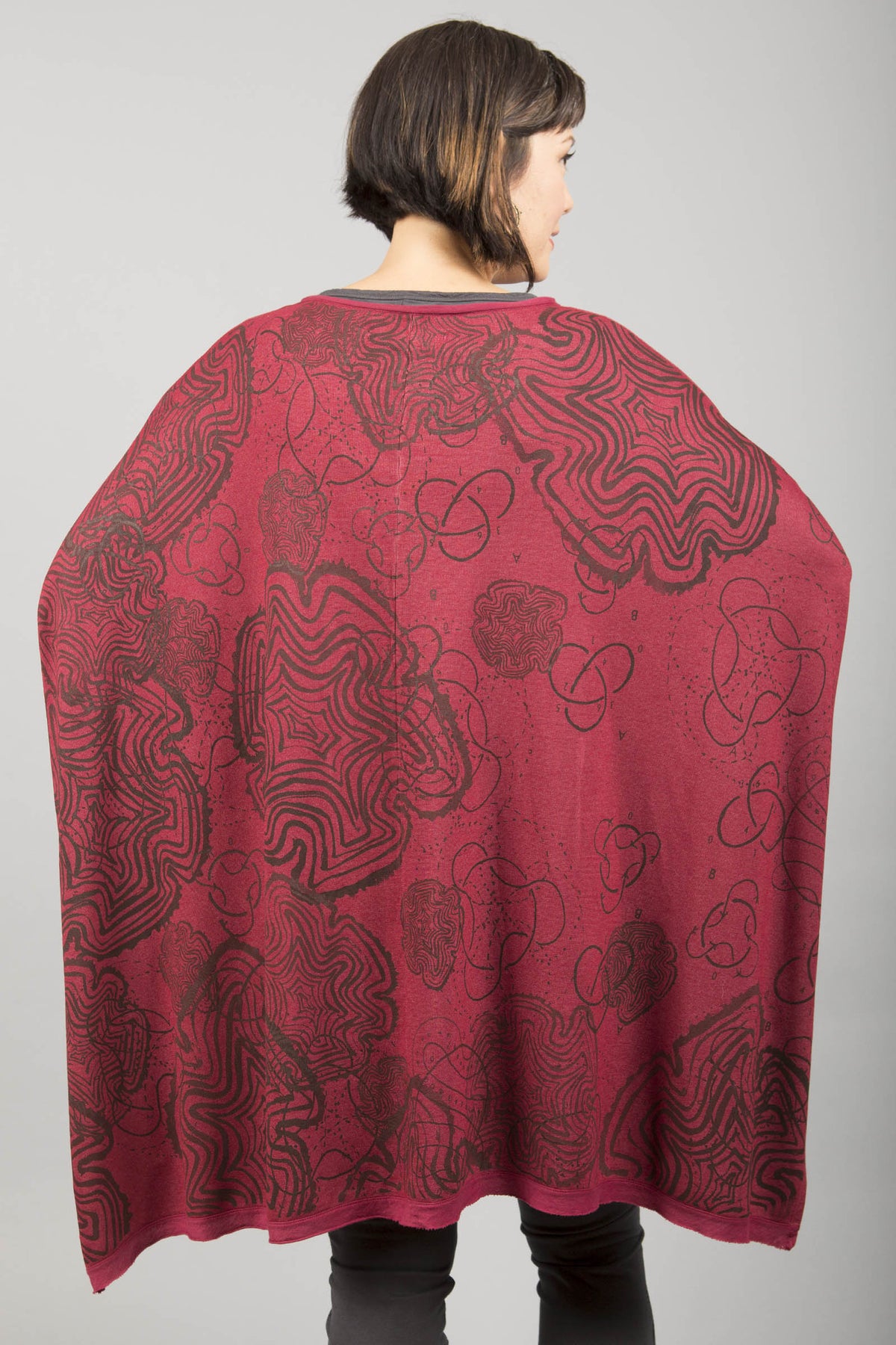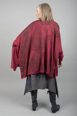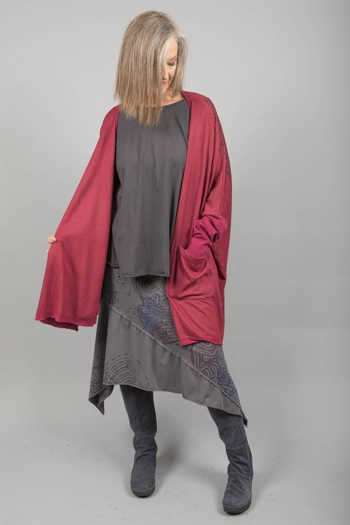 This extremely oversized square one size cardi is a statement piece and has so much lovely drape! Made in USA of heavier, dense, soft fabric comprised of rayon and lycra, this cardigan is a throw-on piece that flatters all sizes. Designed to be worn open, layered over. Large patch pocket on front. The sleeves are fitted to the arm from elbow to wrist. It is hand printed on the back.