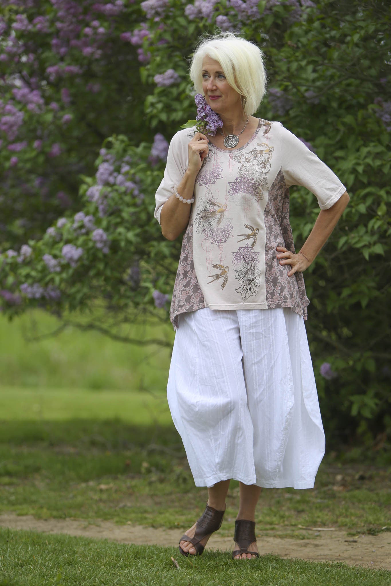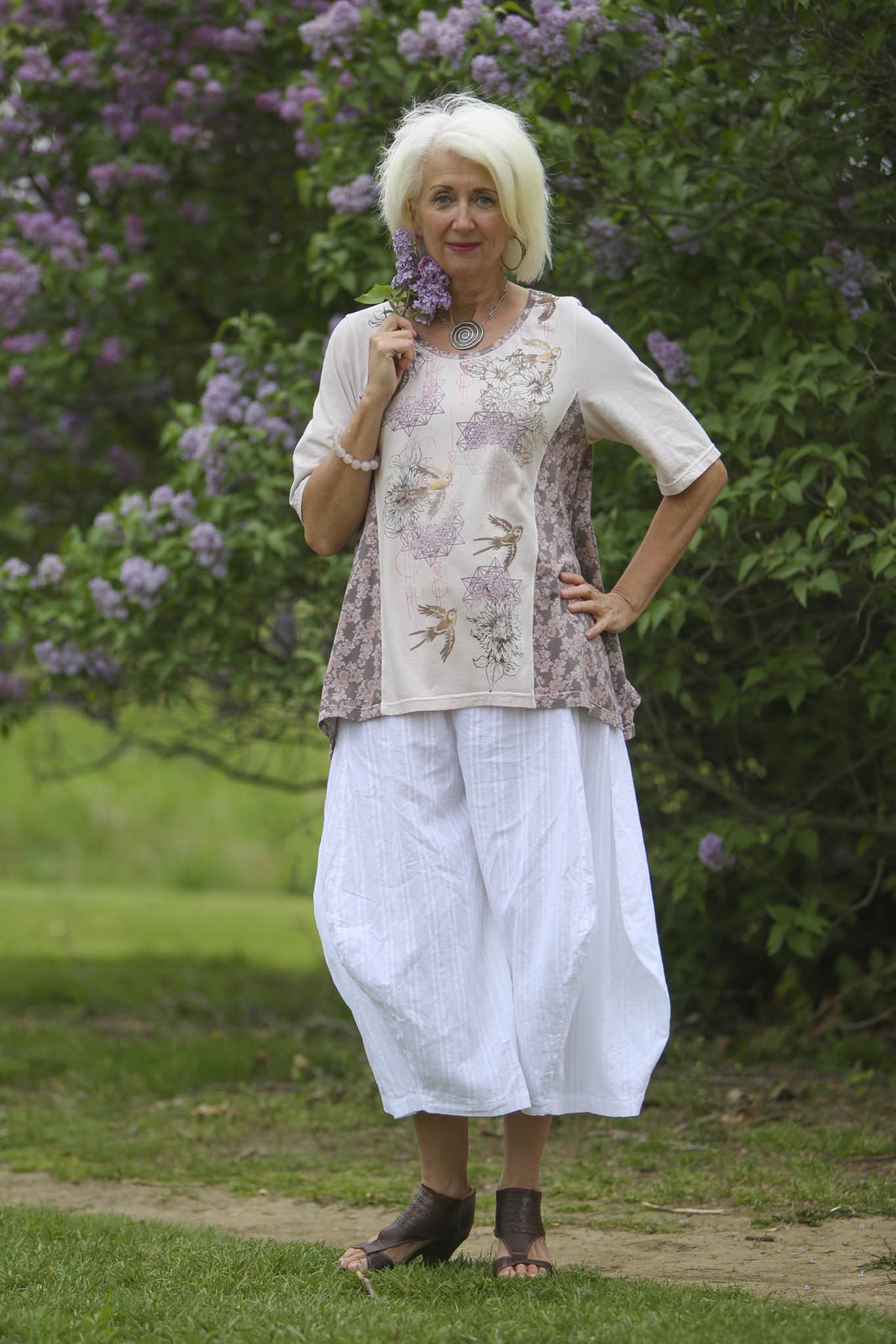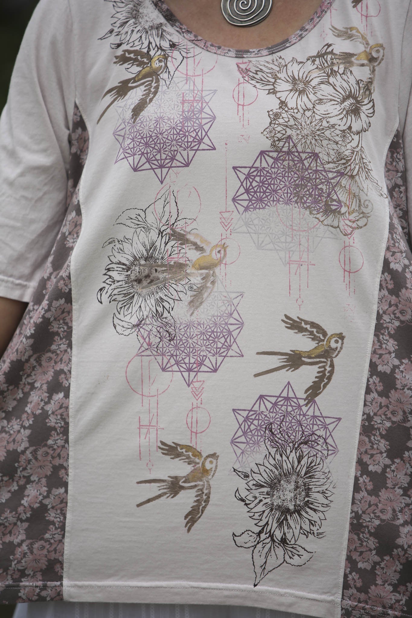 This favorite style top, remade with limited edition flowered fabric and hand printed with fun layered designs is sure to make people happy!