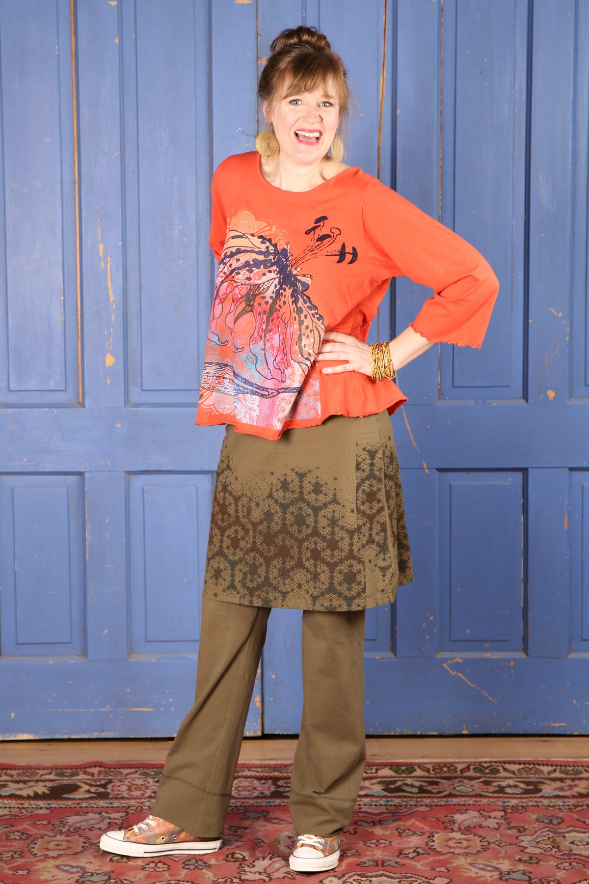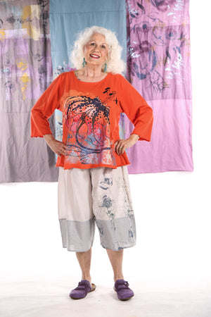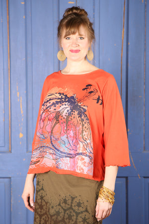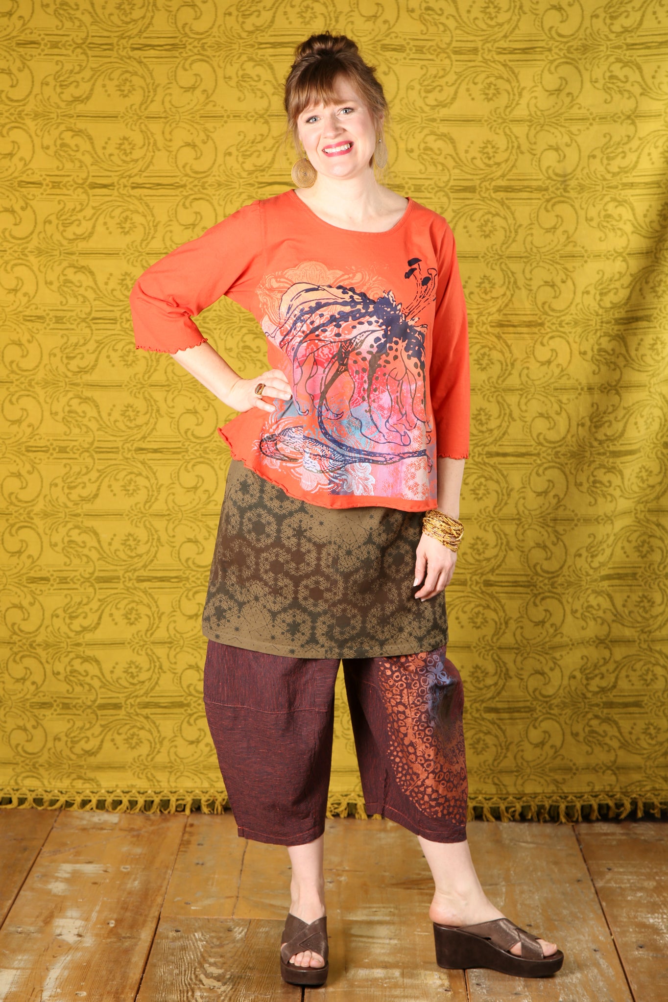 Your favorite café tee style with lettuce-edged finish at hem and elbows. Perfect lightweight organic cotton, somewhere in between tissue and our heavier weight studio tee fabric. This top has the characteristic A-line swing, wide at the bottom, and a few inches shorter for spring outfits . A great piece because it can be layered or worn alone, throughout the seasons.