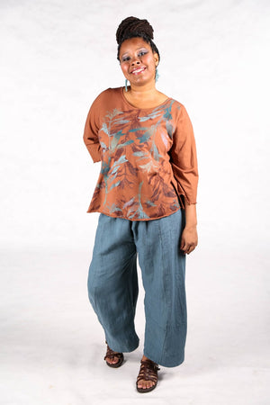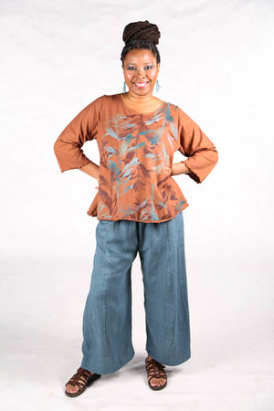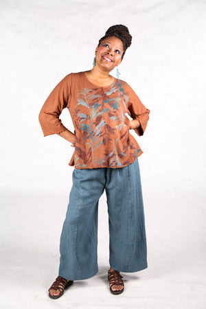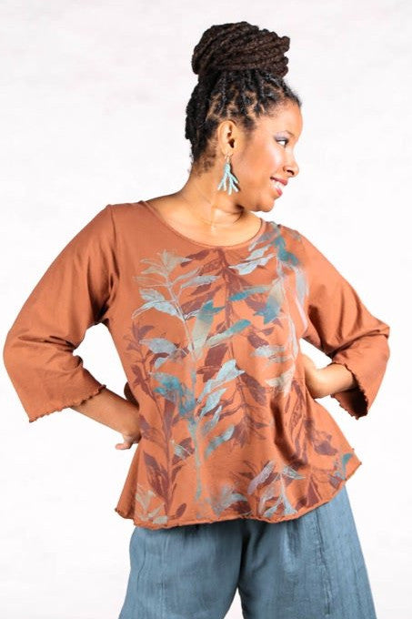 Your favorite café tee style with lettuce-edged finish at hem and elbows. Perfect lightweight organic cotton, somewhere in between tissue and our heavier weight studio tee fabric. This  top has the characteristic A-line swing, wide at the bottom, and a few inches shorter for spring outfits . A great piece because it can be layered or worn alone, throughout the seasons.