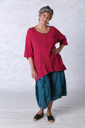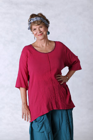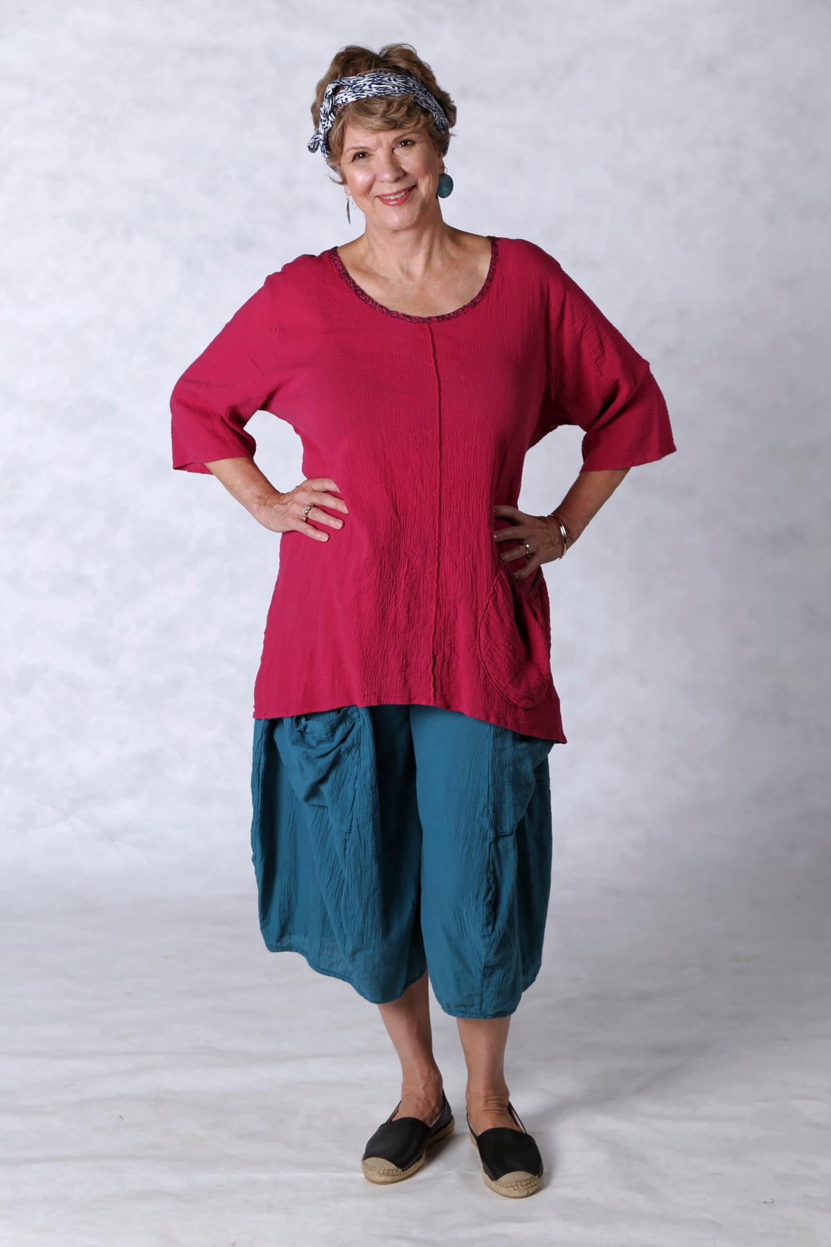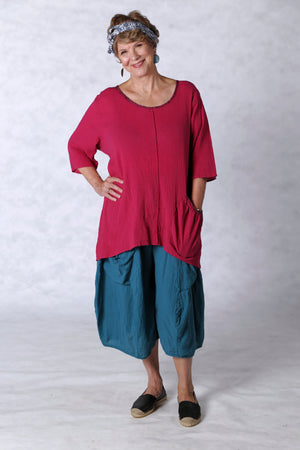 Wonderfully textured, this crinkly cotton gauze top has a flattering shape and features a prominent rounded patch pocket, and adjustable drawcord at the back for the perfect fit. Cotton voile binds the neck, pocket and hem for a refined finish. Pair it with any of our cotton gauze cropped pants and culottes, also great with linen pants for the perfect summer wardrobe solution!