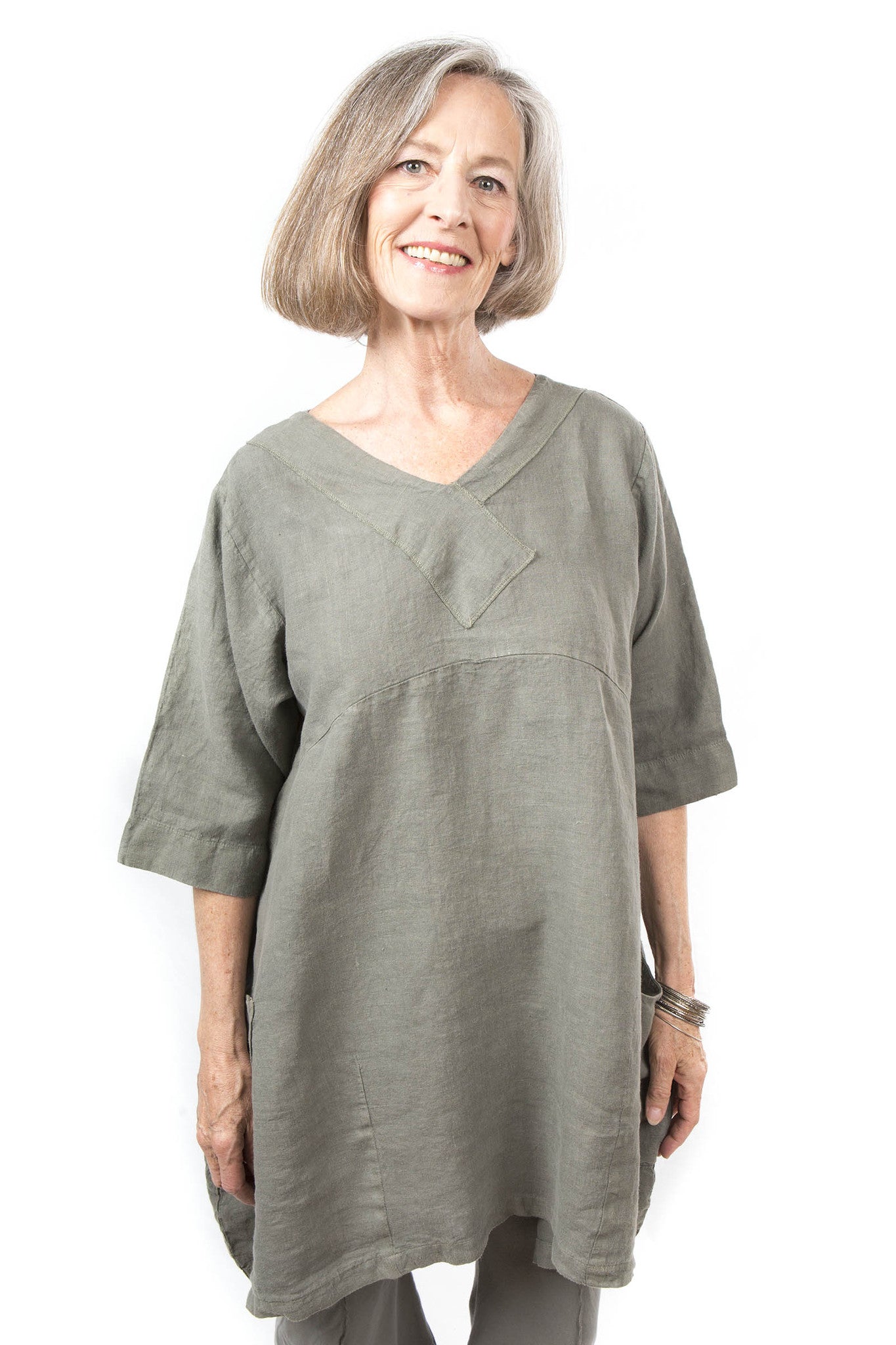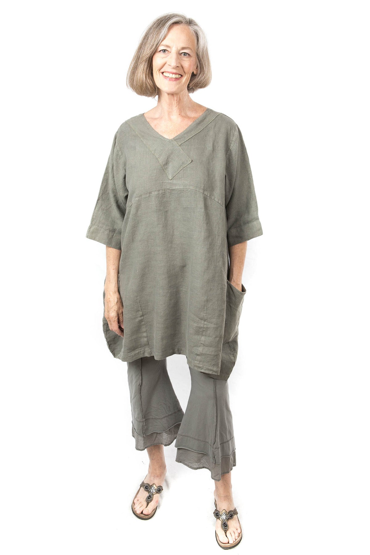 A casually sophisticated tunic in mid-weight linen, with a unique wide crossover yoke and square patch pockets. The bodice is a gentle A-line with a slight taper at the curved hem for subtle shaping. Sleeves come to just below the elbow. Colors are beautifully complex mineral hues, inspired by the natural elements of Scotland. A timeless piece to look and feel wonderful in!