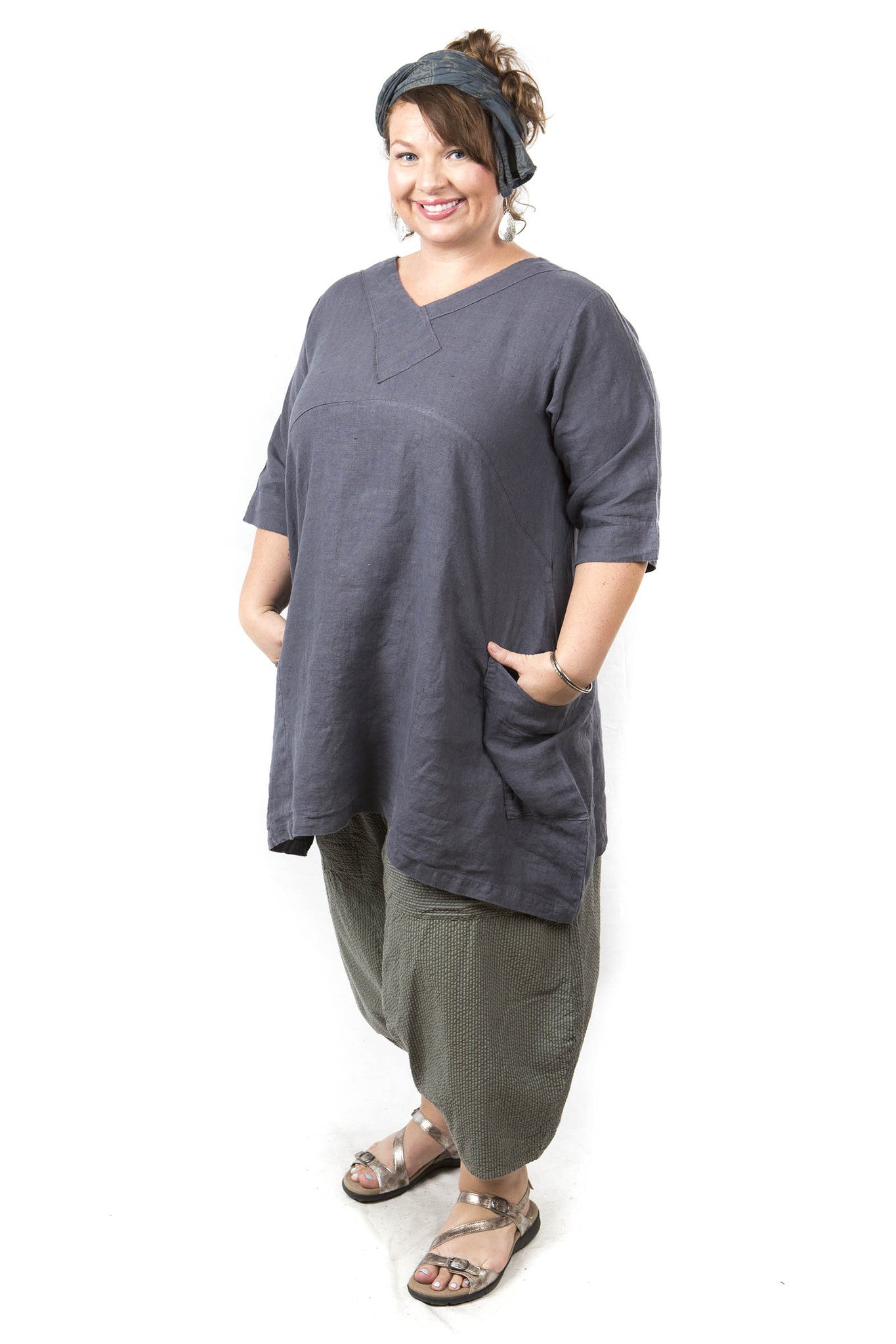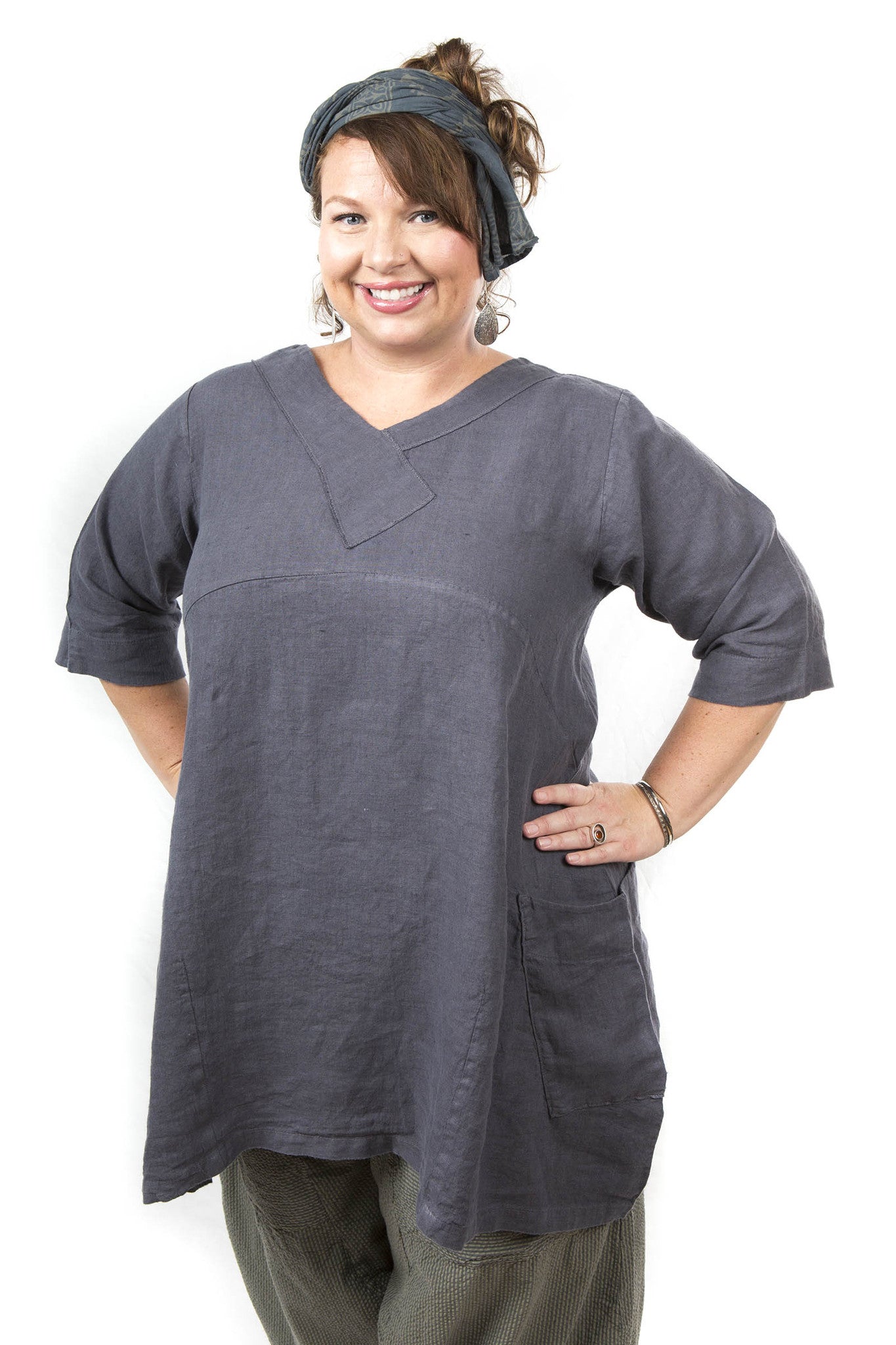 A casually sophisticated tunic in mid-weight linen, with a unique wide crossover yoke and square patch pockets. The bodice is a gentle A-line with a slight taper at the curved hem for subtle shaping. Sleeves come to just below the elbow. Colors are beautifully complex mineral hues, inspired by the natural elements of Scotland.  A timeless piece to look and feel wonderful in!