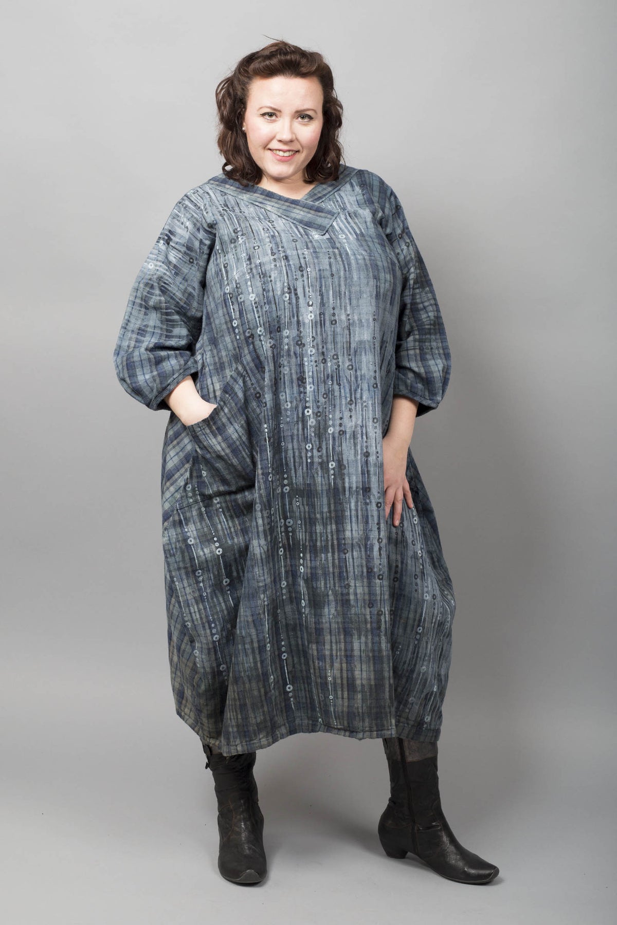 When I first saw them, I thought- 'these dresses are blue moon dresses'... they are rare and gorgeous. We have crafted them in the USA from a perfect-weight brushed cotton plaid which we have dyed several times by hand, and hand printed in intricate layers of shade, design, and texture. Each is unique. The style is perfect, a favorite lengthened to 50" which flatters us all whether shorter or taller. Lovely details at sleeve opening and crossover neckline. Made in extremely limited quantities. A dress to fall in love with.