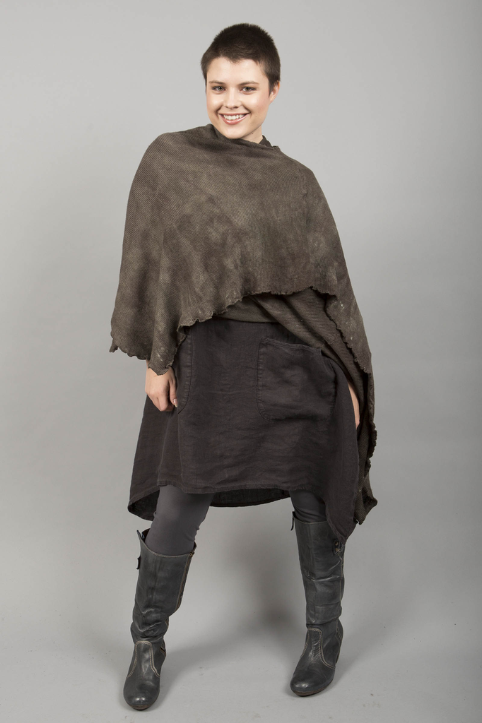 This wrap = rustic elegance. An ultra wide oversized wrap which can be worn many ways. Allow yourself to play and you will find many looks from this beautifully dyed piece. It is a very long rectangle, the wide back can be draped low in back, or it can be wrapped to fit. Create an asymmetrical look by using one armole as the neck opening. Any way you wear it, a sophisticated design. We suggest pairing it with some of the gorgeous new large copper and pearl or crystal hammered hoop earrings from our Frenchtown shop.