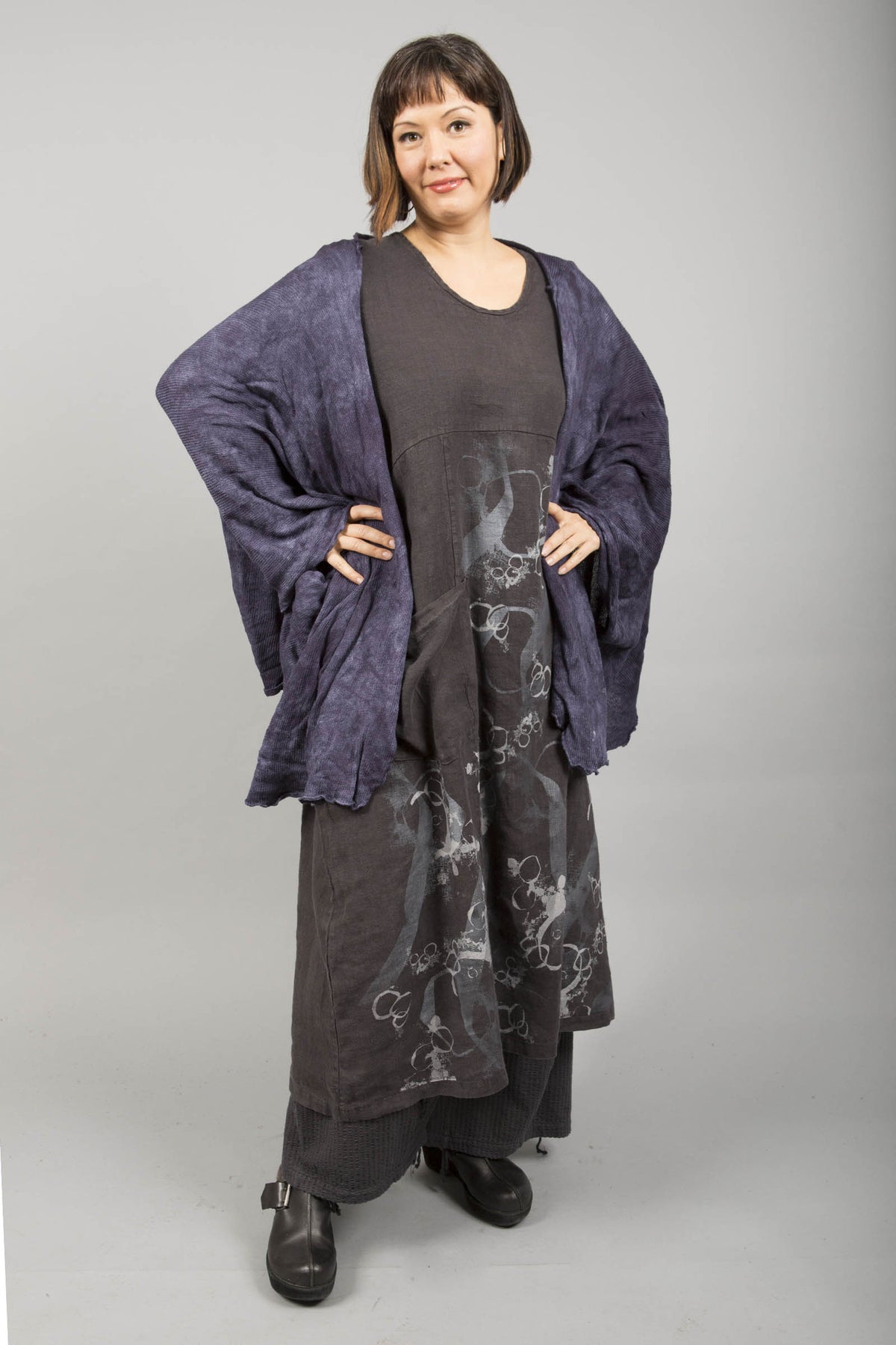 This wrap = rustic elegance. An ultra wide oversized wrap which can be worn many ways. Allow yourself to play and you will find many looks from this beautifully dyed piece. It is a very long rectangle, the wide back can be draped low in back, or it can be wrapped to fit. Create an assymetrical look by using one armole as the neck opening. Any way you wear it, a sophisticated design. We suggest pairing it with some of the gorgeous new large copper and pearl or crystal hammered hoop earrings from our Frenchtown shop.