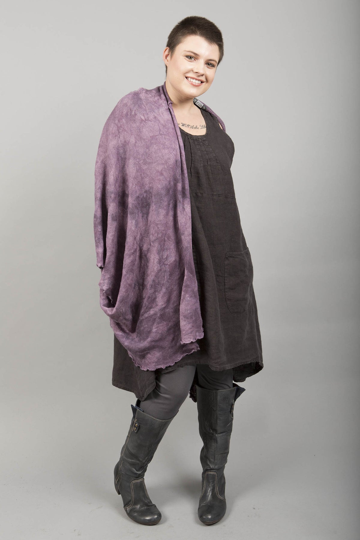 This wrap = rustic elegance. An ultra wide oversized wrap which can be worn many ways. Allow yourself to play and you will find many looks from this beautifully dyed piece. It is a very long rectangle, the wide back can be draped low in back, or it can be wrapped to fit. Create an assymetrical look by using one armole as the neck opening. Any way you wear it, a sophisticated design. We suggest pairing it with some of the gorgeous new large copper and pearl or crystal hammered hoop earrings from our Frenchtown shop.