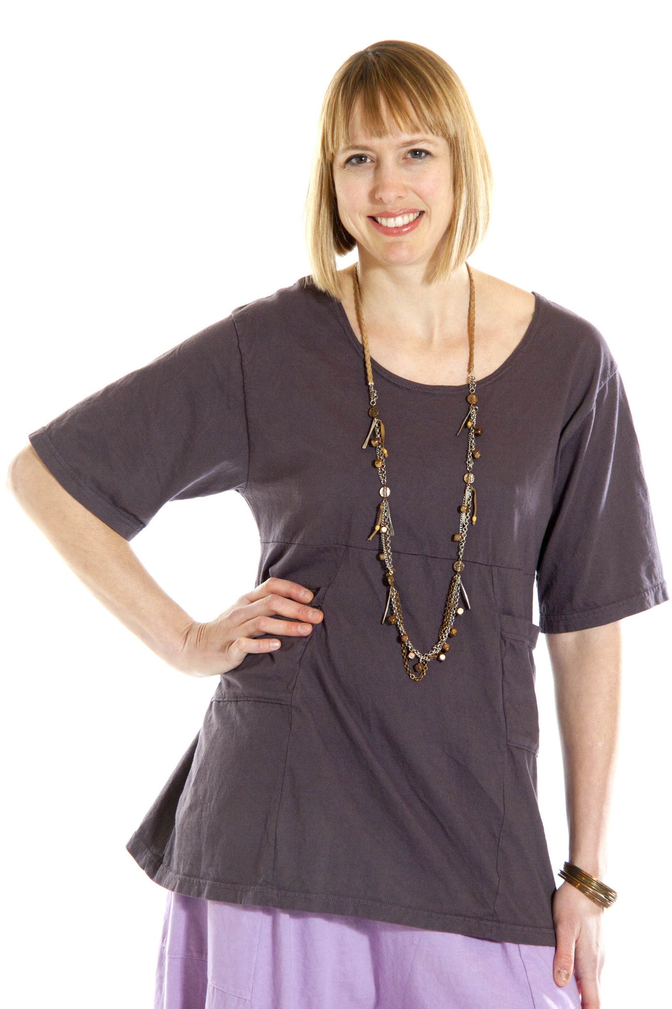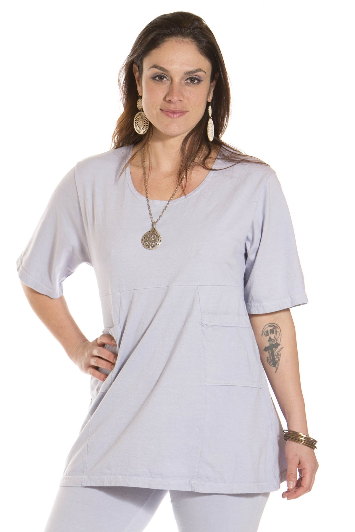 A new short sleeve pocket tunic with an empire waist! It has a flattering fit, with scoop neckline, and 2 handy pockets making it a new favorite.