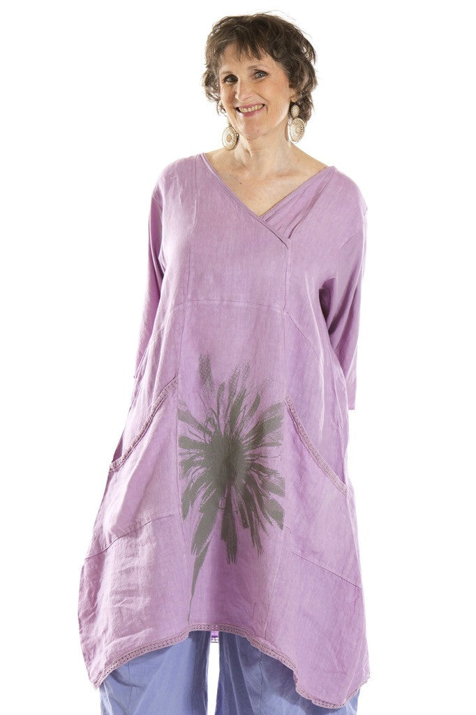 An easy warm weather tunic-dress that can transform for any occasion. Crossover neckline styling with large patch pockets in medium weight linen that is soft without being sheer. The sleeves are cotton jersey and the pockets and hem are trimmed with European cotton lace. This style is an over-sized Blue Fish shape, and drapes beautifully. Please check our measurement guide to find your perfect size.