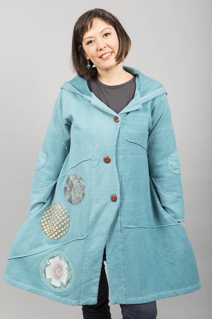 This classic Blue Fish fleece hoodie coat is our go-to for warmth & style. Fun circular patches at the elbow add interest, while the waved button closure adds a unique place for 3 buttons. The a-line tiers are very flattering, and allow for lots of layers underneath.Two pockets on the sides complete the design.