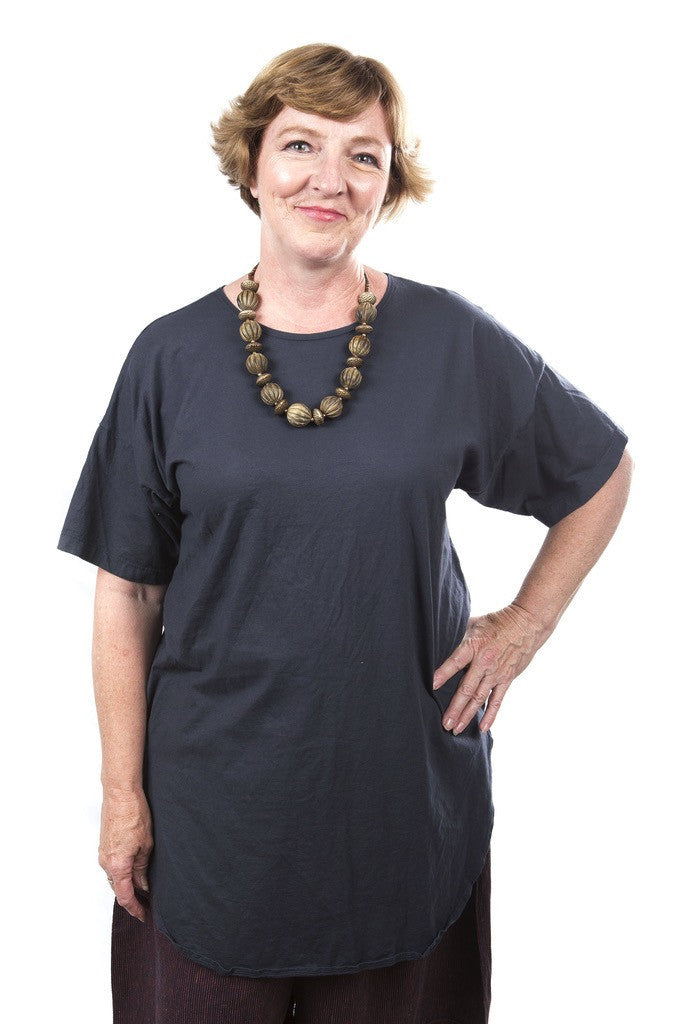 A dramatic scooped hem light-weight organic cotton jersey knit tunic. In fun summer-worthy colors and bold, fun new prints. This is an oversized tunic which can be adjusted via the drawcord across the back.