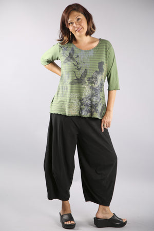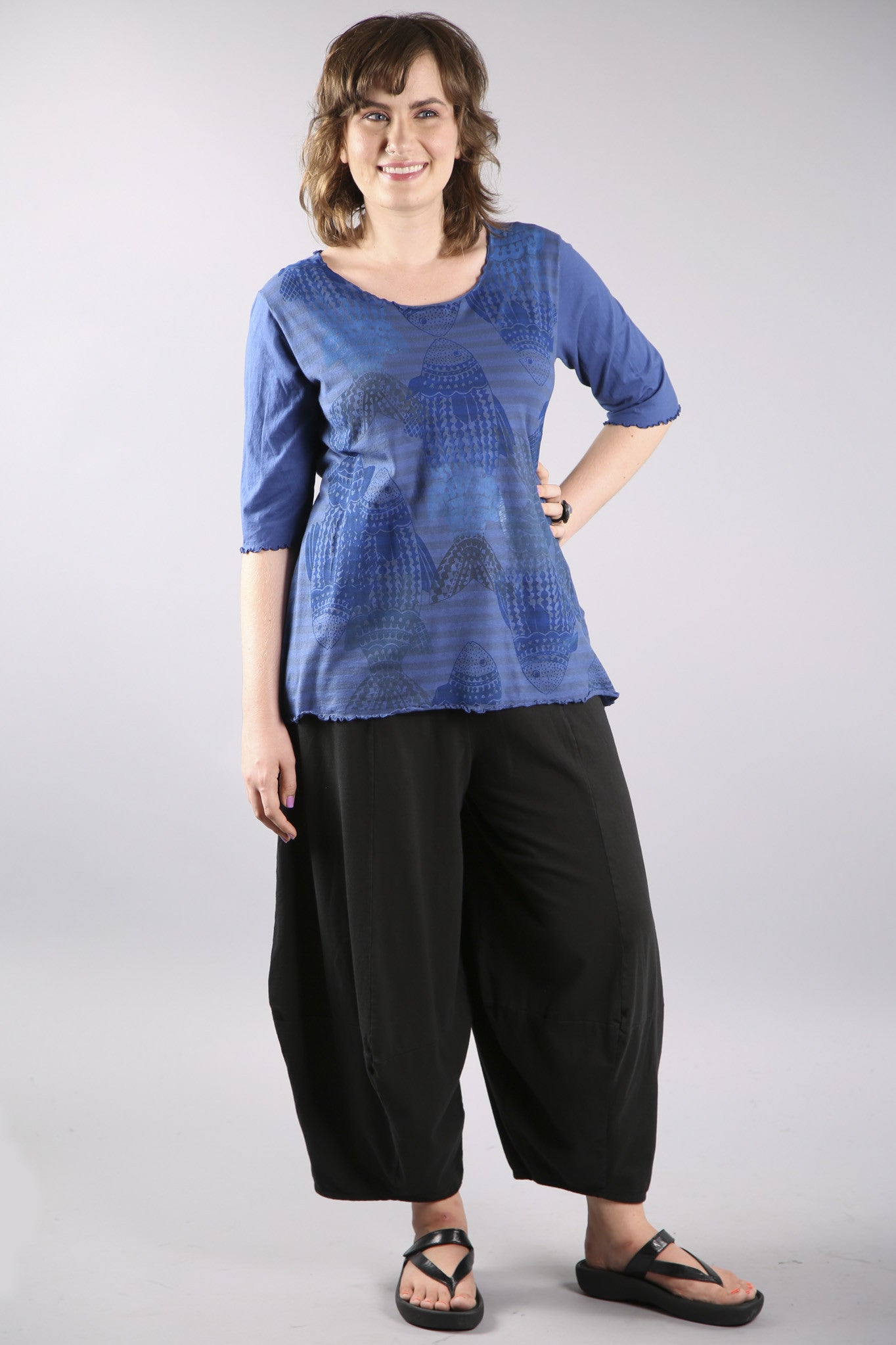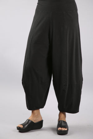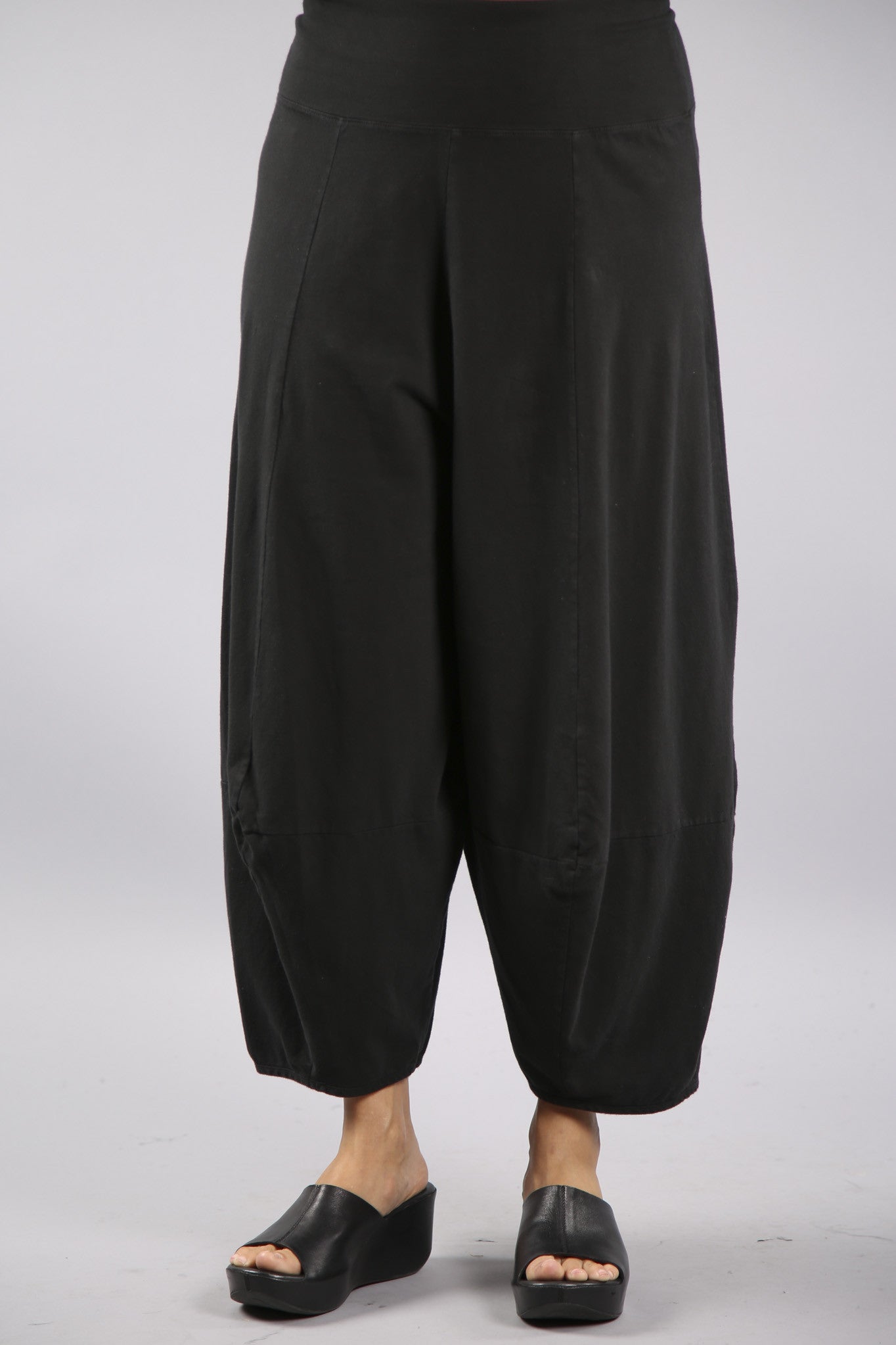 We've added even more dimension to this favorite eclectic pant by creating more architectural shaping. This Blue Fish classic adds "fabulous" to any outfit. We've made these pants extra-comfy using organic cotton lycra jersey. Waistband is a wide doubled band, so you can fold it to where it fits and feels best to you-it fits a variety of sizes and heights in pure comfort.