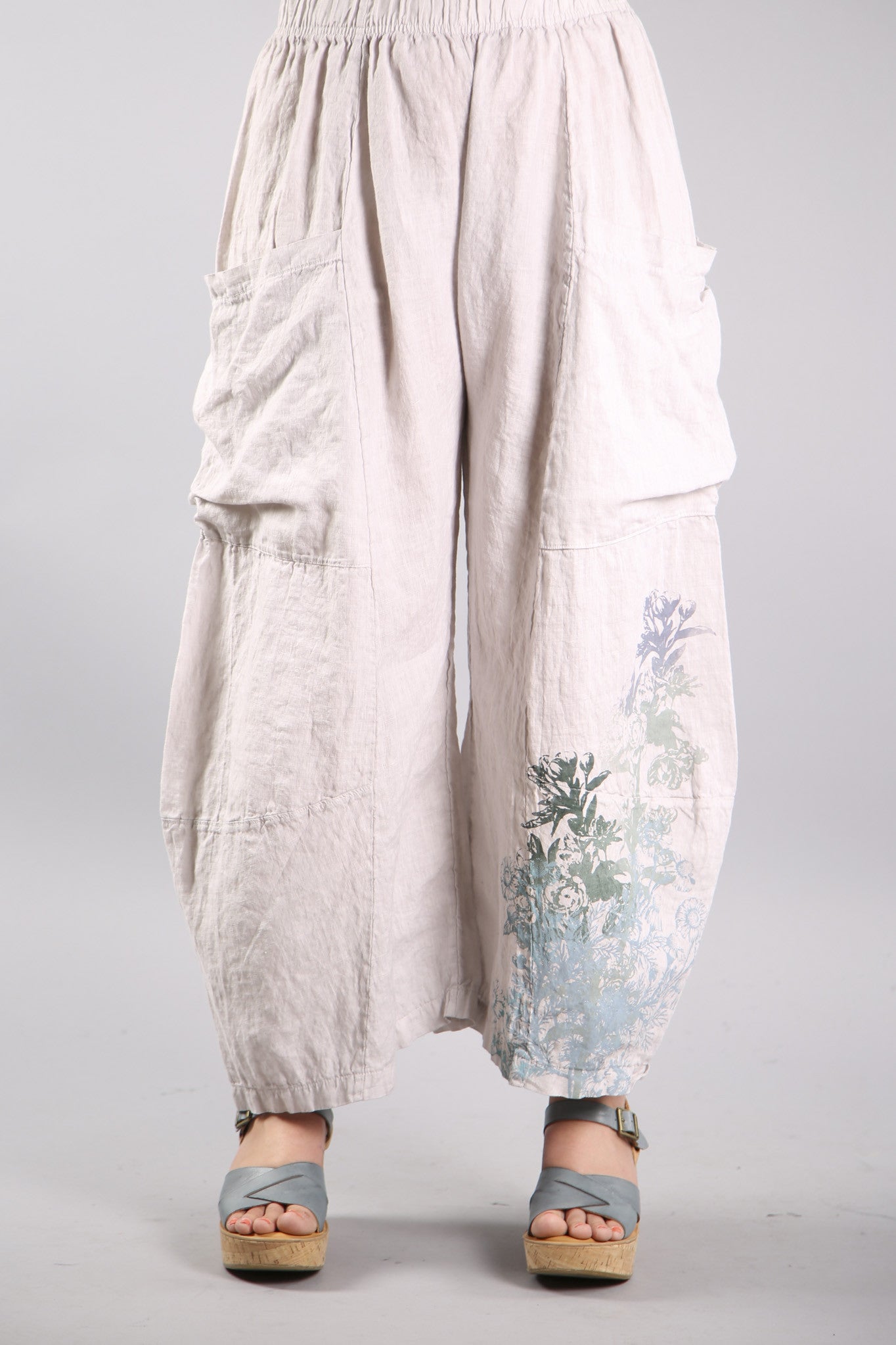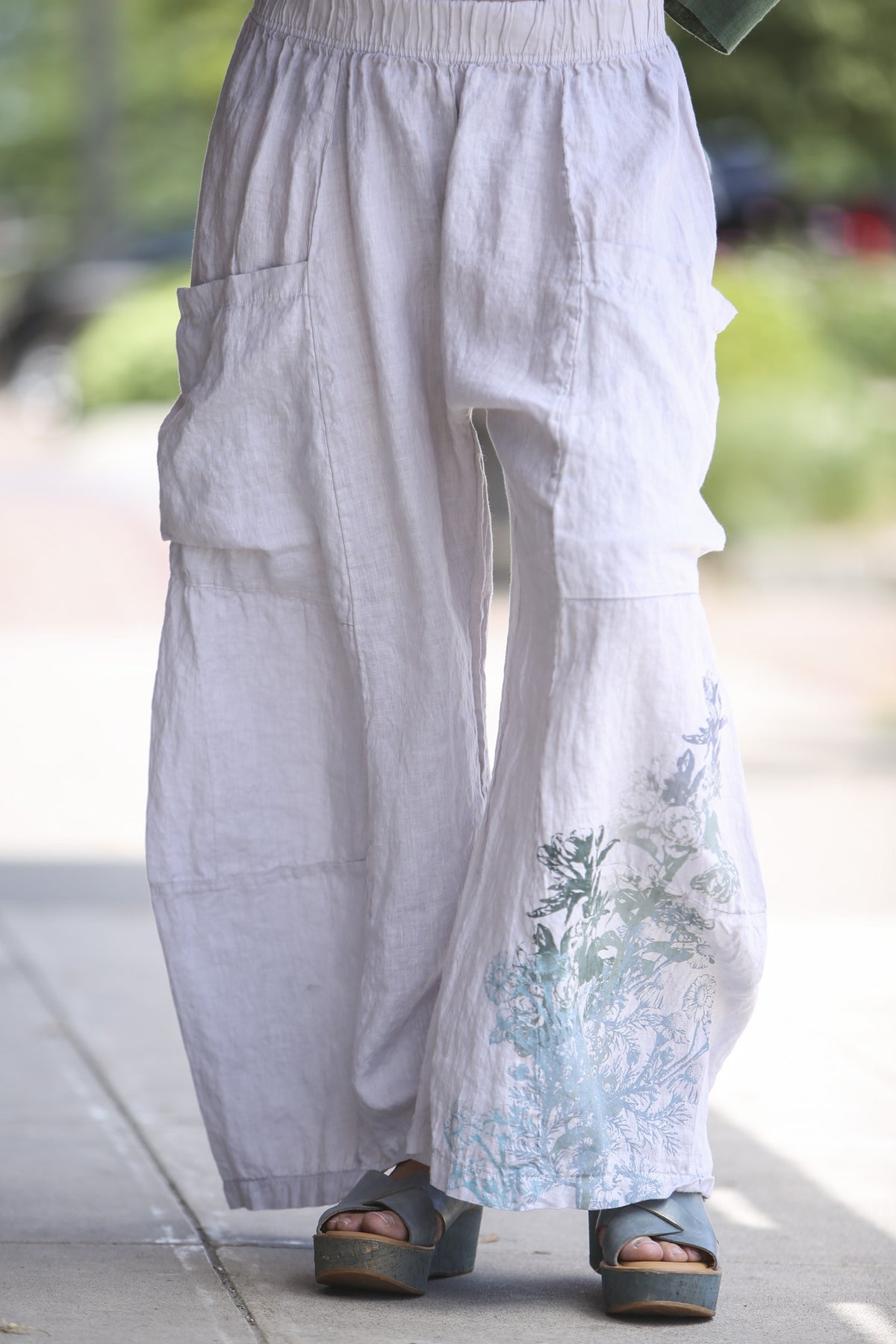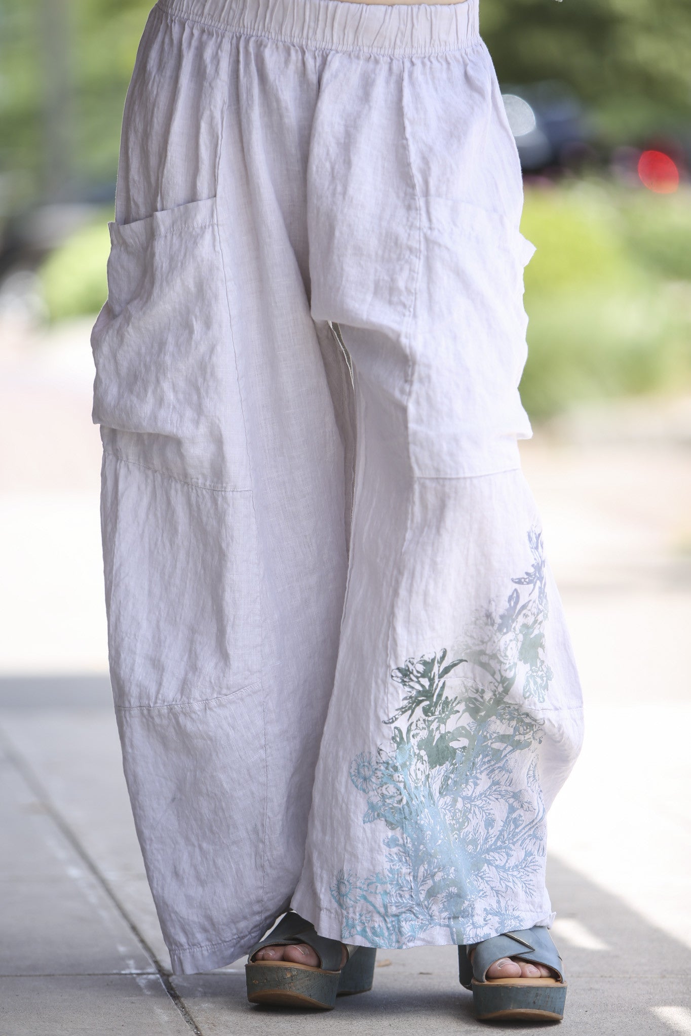 Simple or dramatic linen pant style with pockets, wide legs, wide elastic waist.