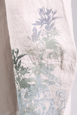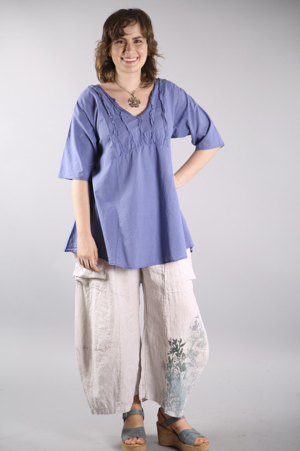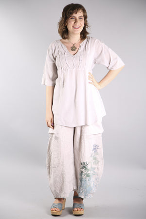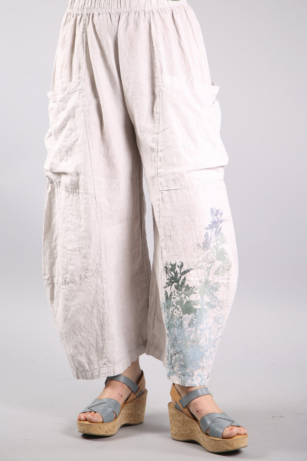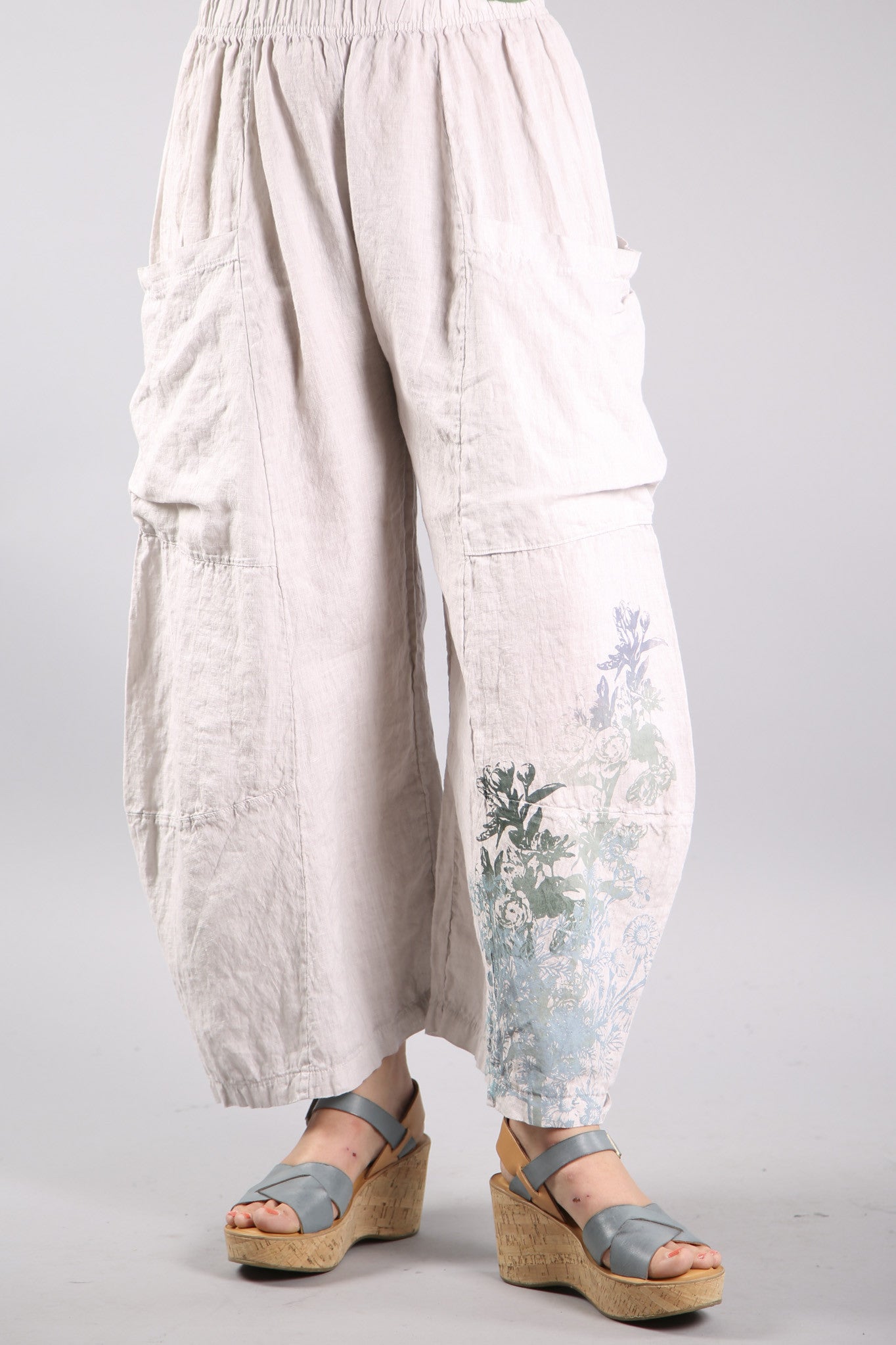 Simple or dramatic linen pant style with pockets, wide legs, wide elastic waist.