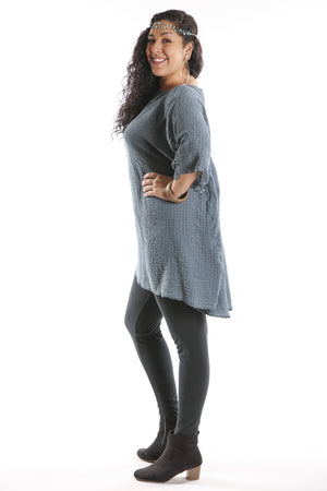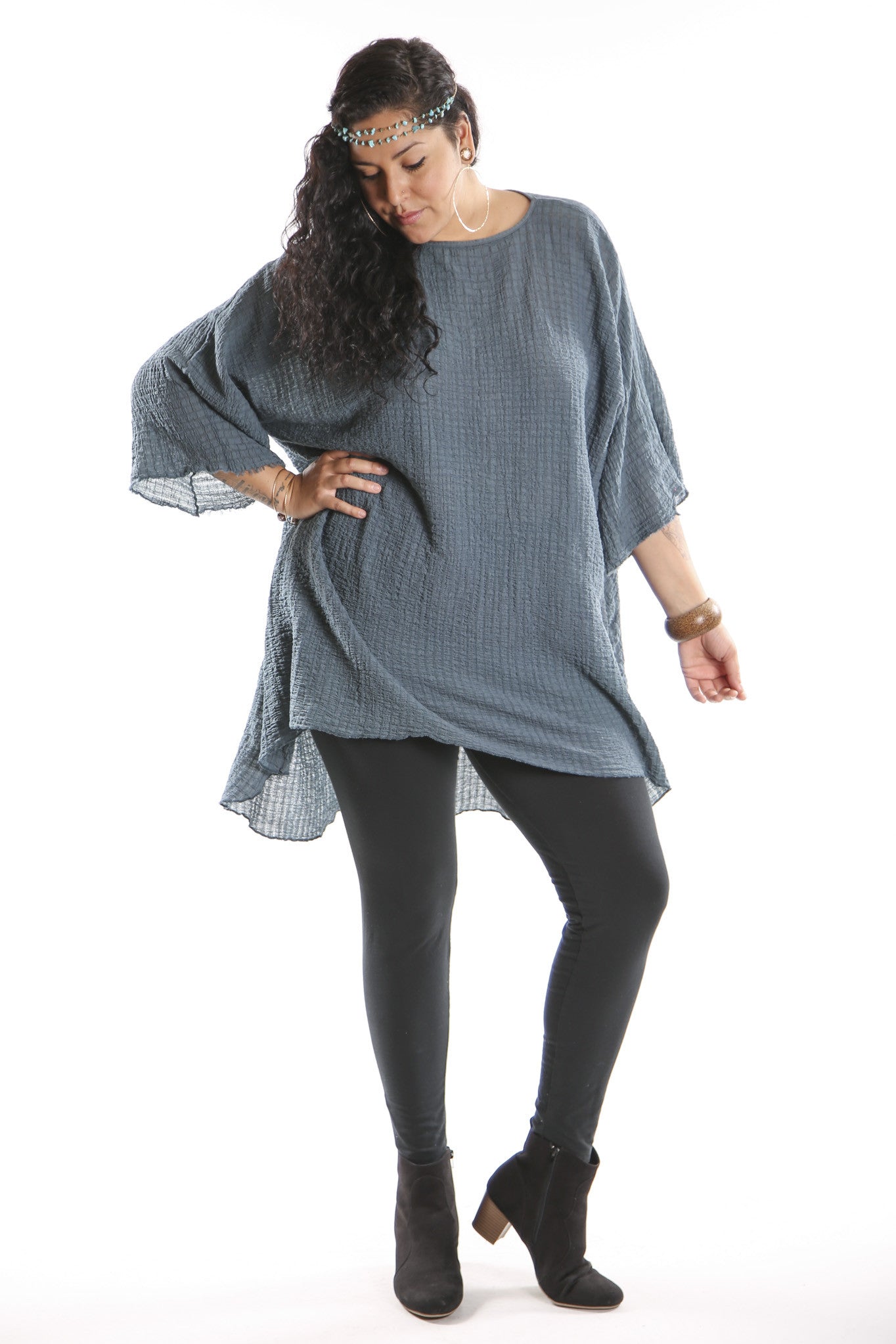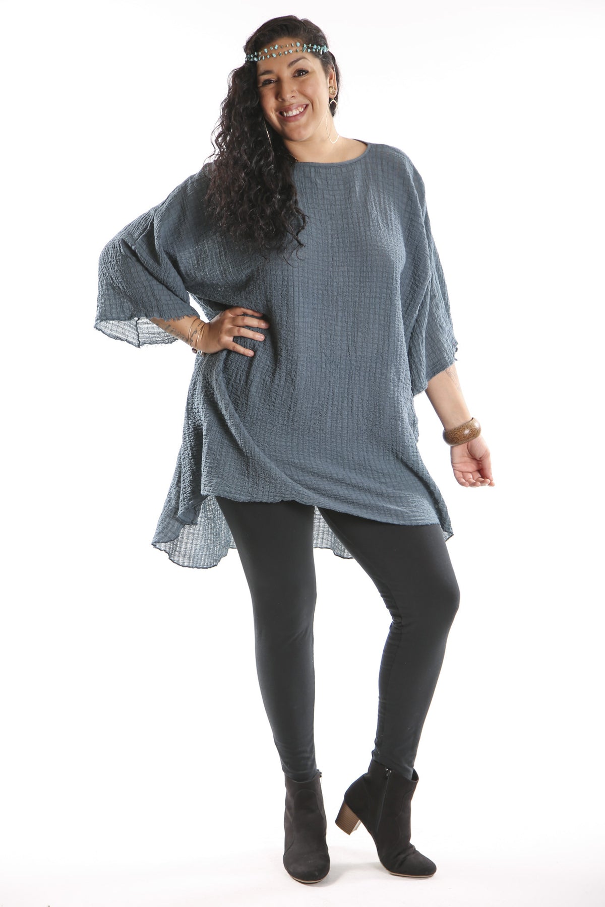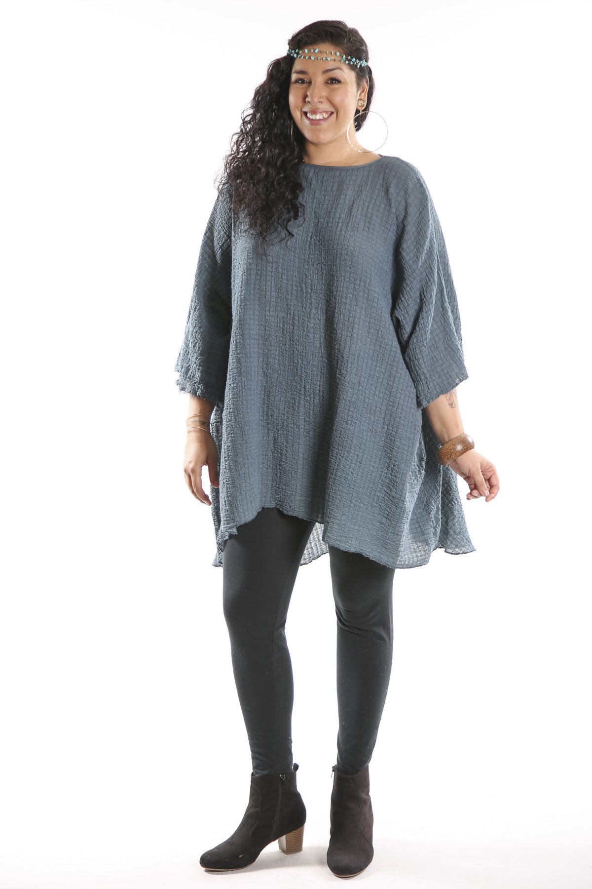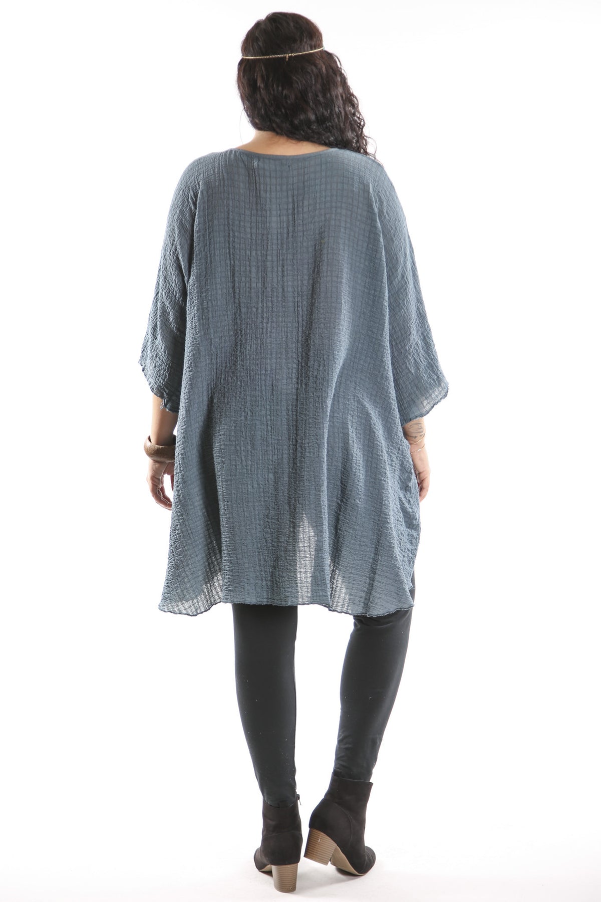 This hand dyed tunic has a thread of lycra which causes it to pucker when dyed, creating a wonderful textural appeal. Hand dyed, each piece will vary in tone and texture.
