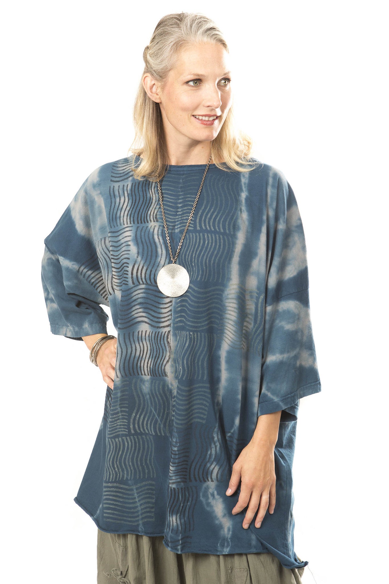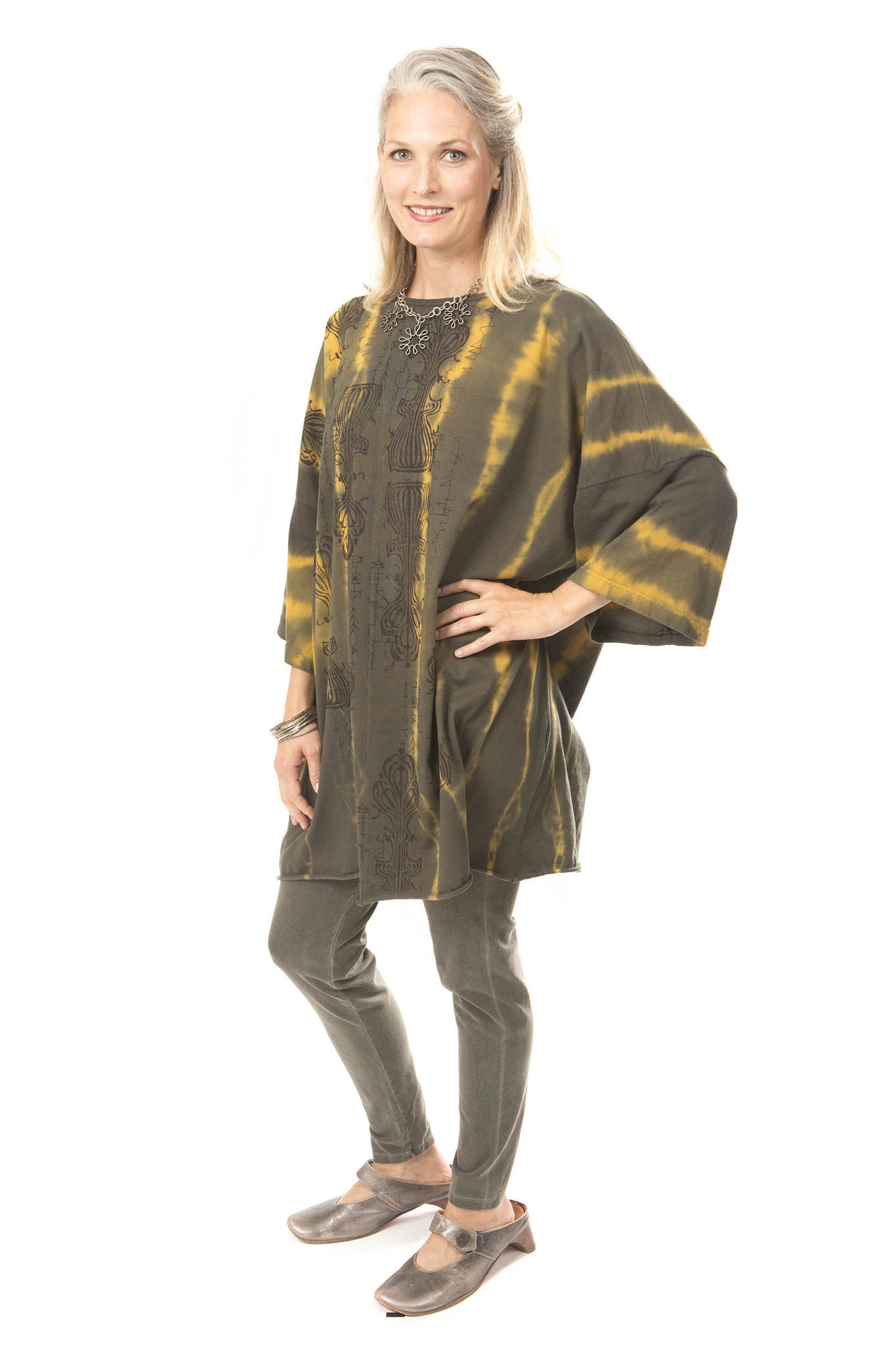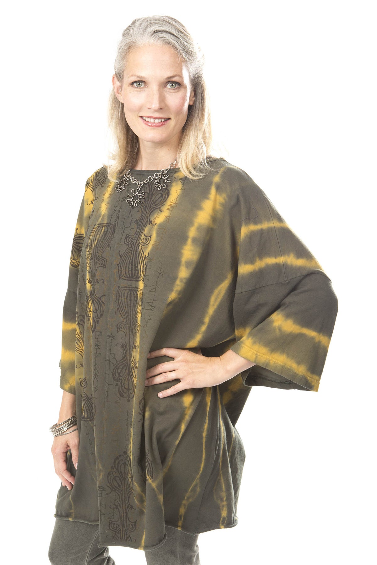 Perfect one-size tunic to wear now and into autumn...New subtle designs in modern shades that we have hand printed minimally for maximum effect. In shades of olive/gold, dim grey/lilac, and caribbean/ fog Limited quantities.