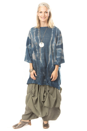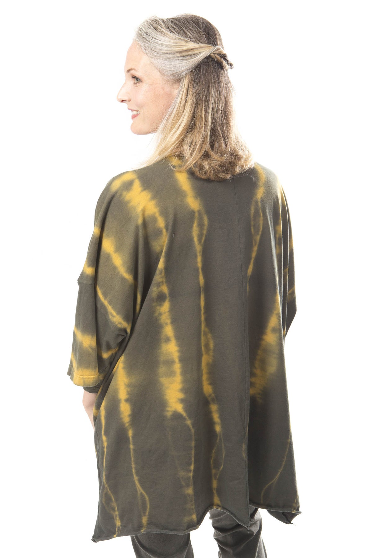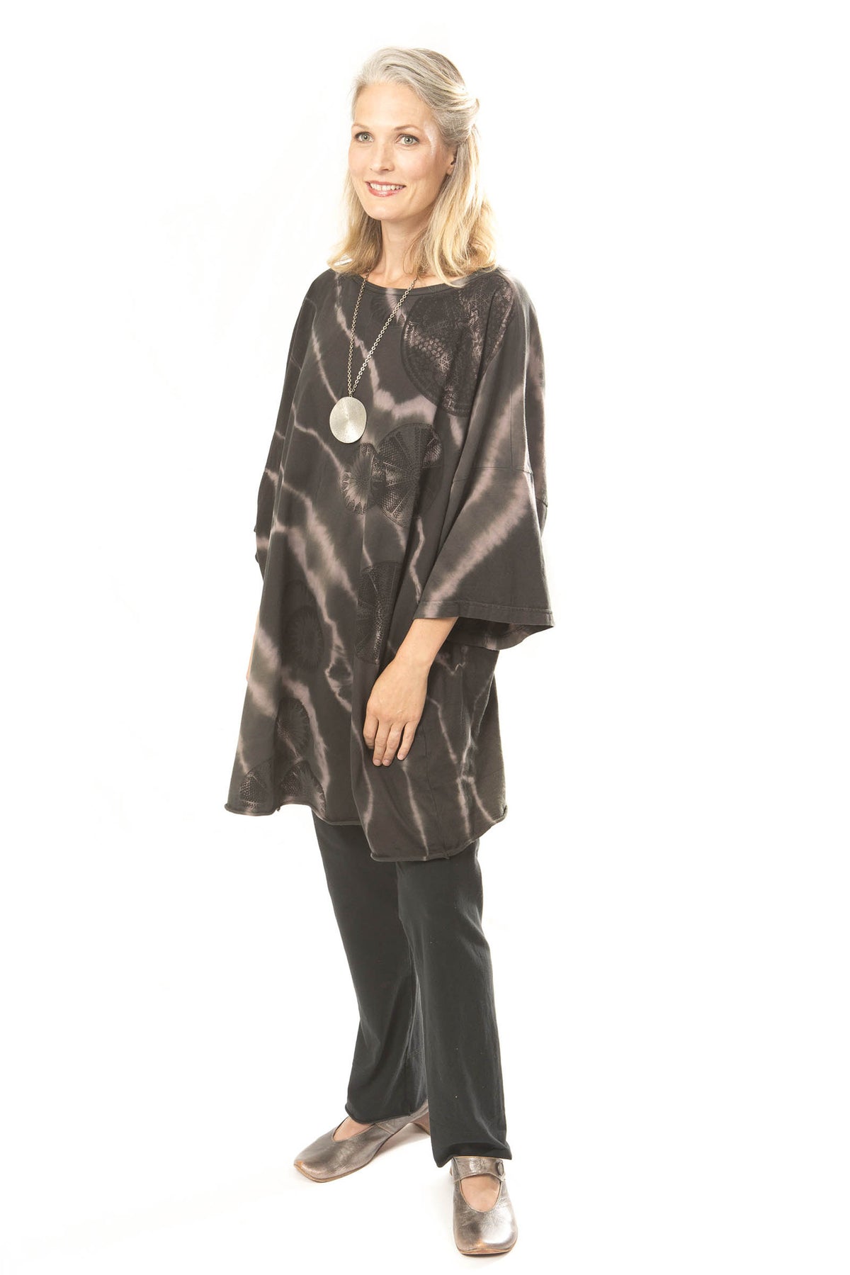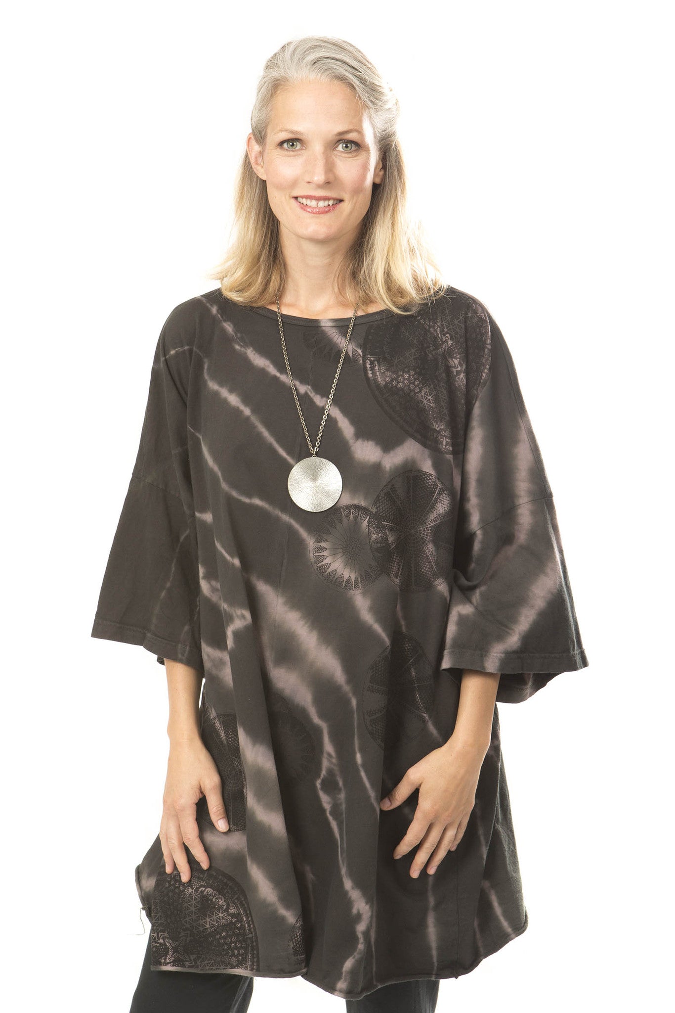 Perfect one-size tunic to wear now and into autumn...New subtle designs in modern shades that we have hand printed minimally for maximum effect. In shades of olive/gold, dim grey/lilac, and caribbean/ fog Limited quantities.