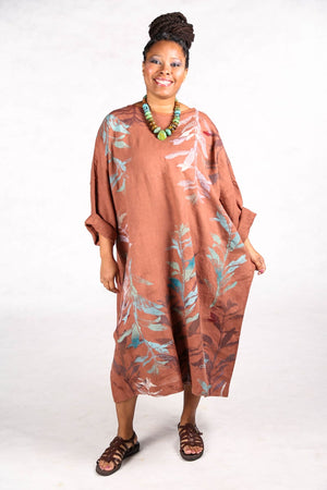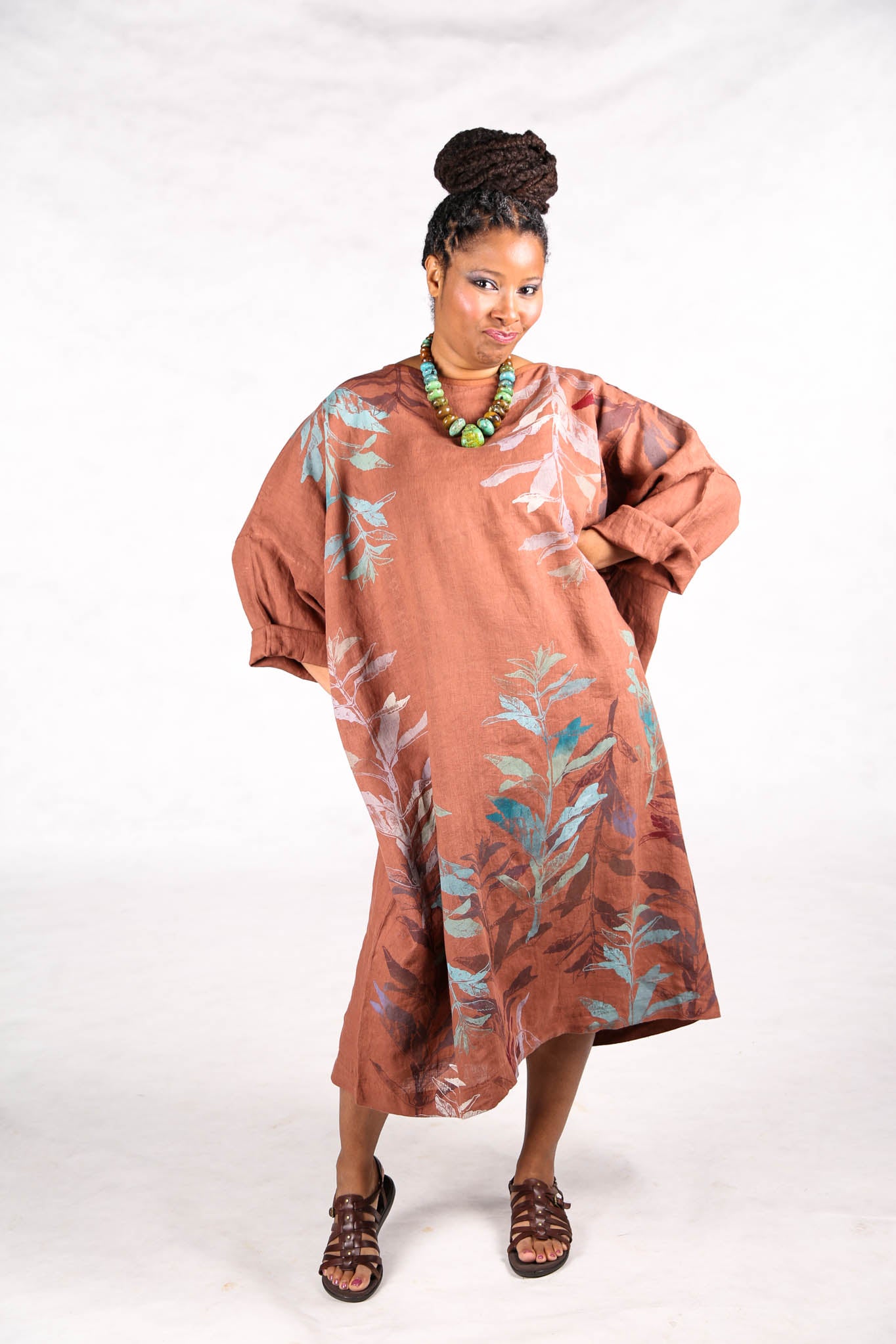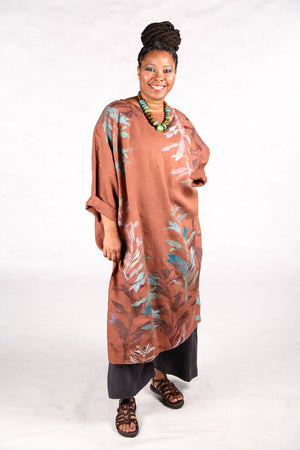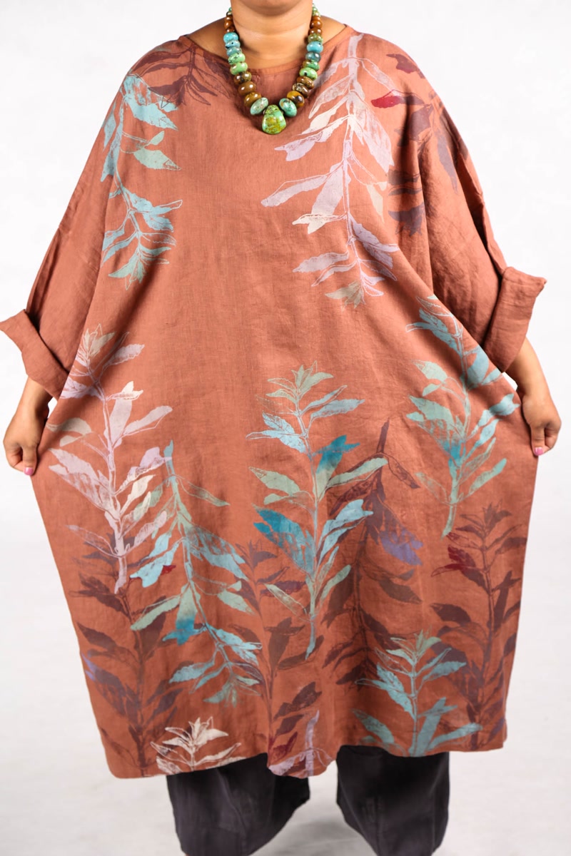 Our mariposa top taken to full length drapes elegantly and flatters every figure. Cool and comfortable, this linen top will be your favorite go-to this summer. Our artists created deliciously fun prints for eclectic style. Wear alone or over the linen pant from this collection in Arrowhead or Kingfisher to pick up the colors of the art.