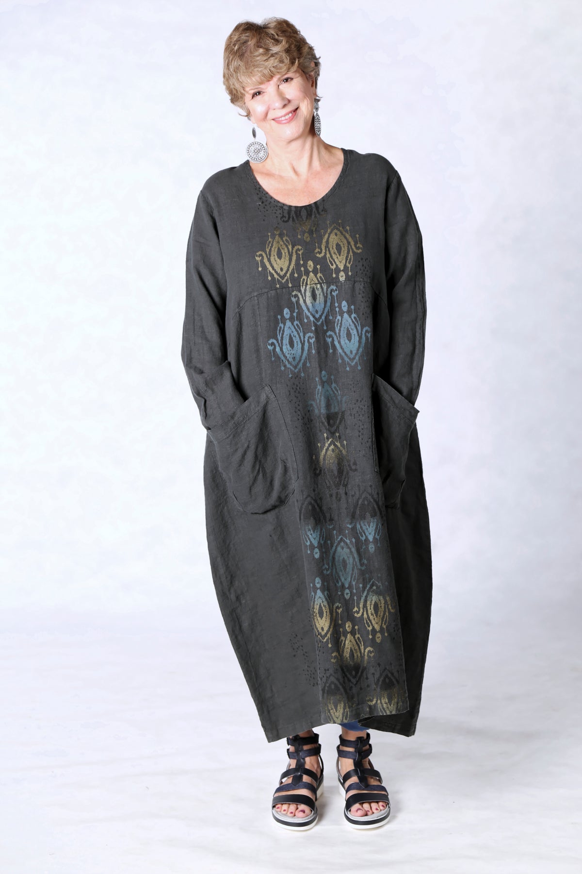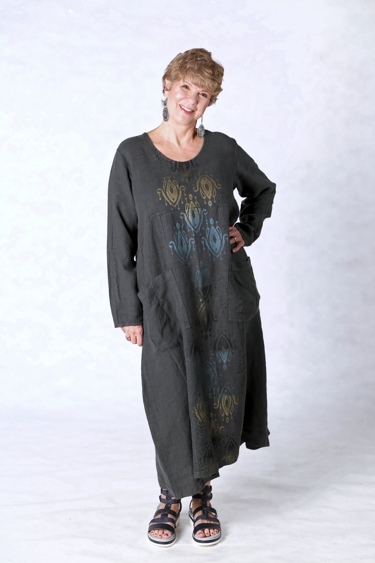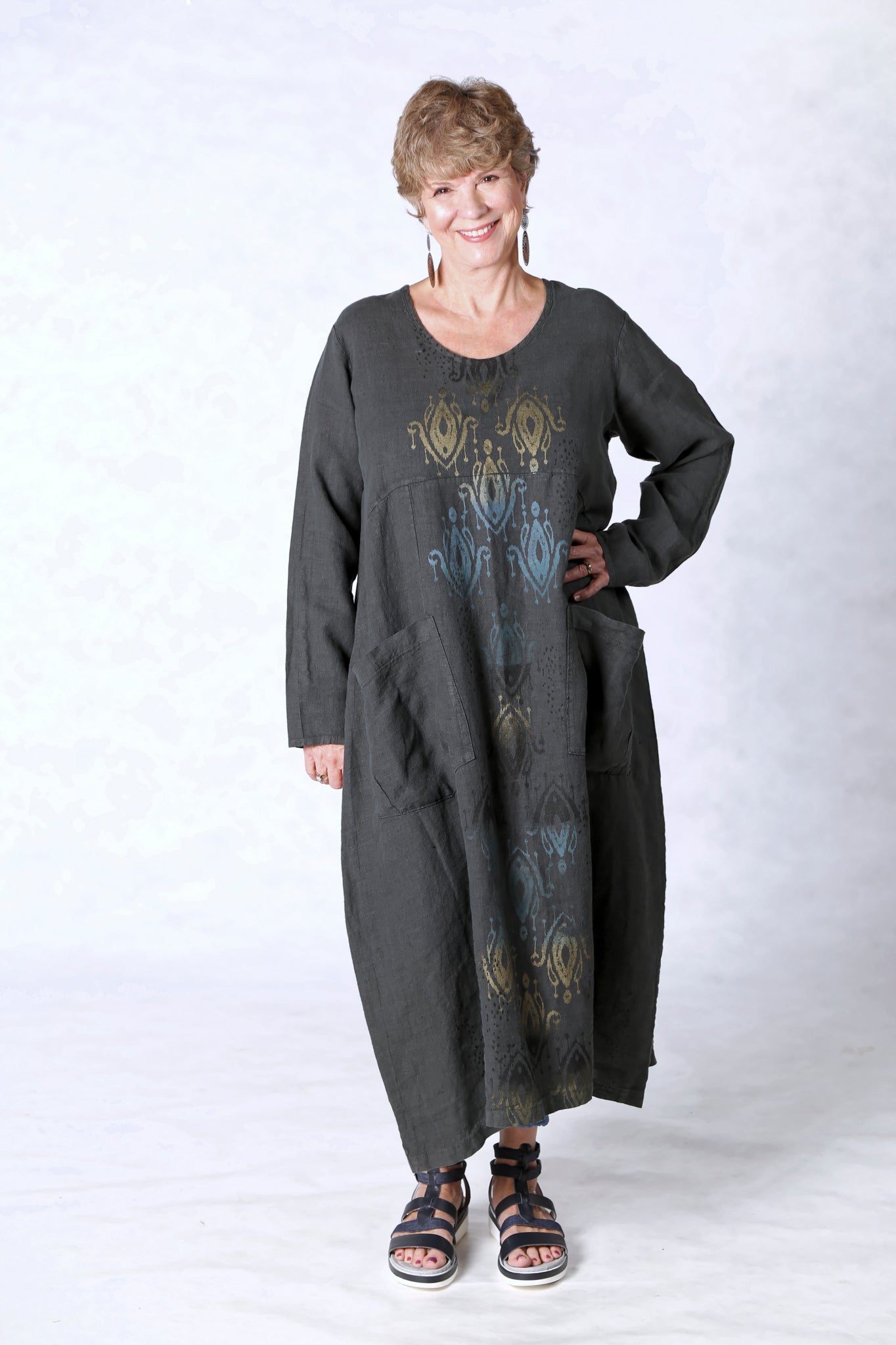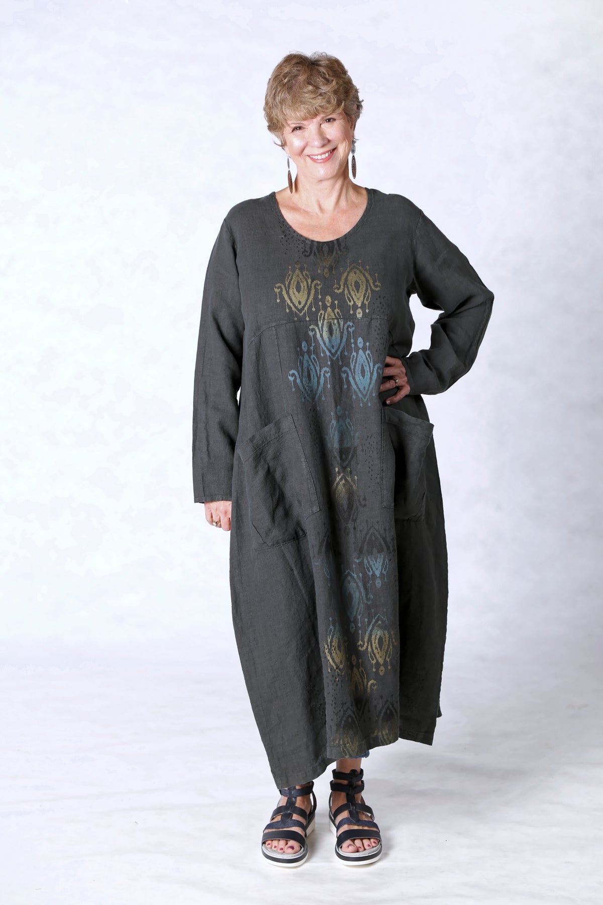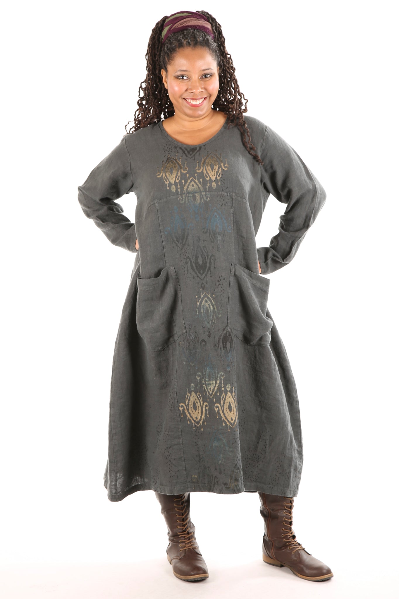 We love this elegant linen dress, timeless in its simplicity. Patch pockets add functionality, while the gently belled shape is perfectly flattering for every body. Just beautiful! Click on the eye that appears over the photo- to enlarge and see how pretty the print is.