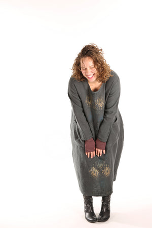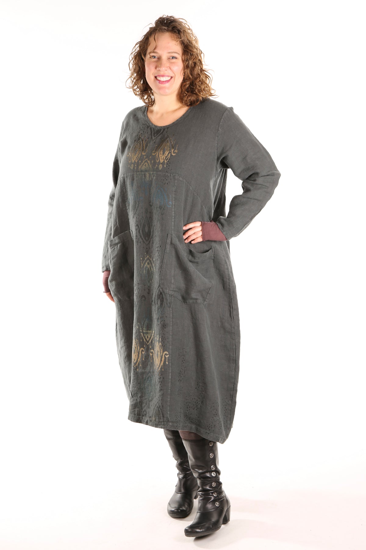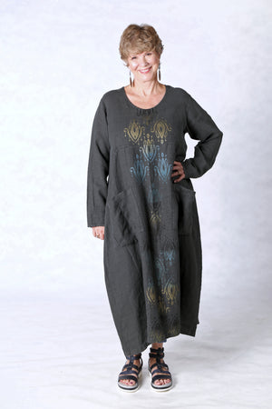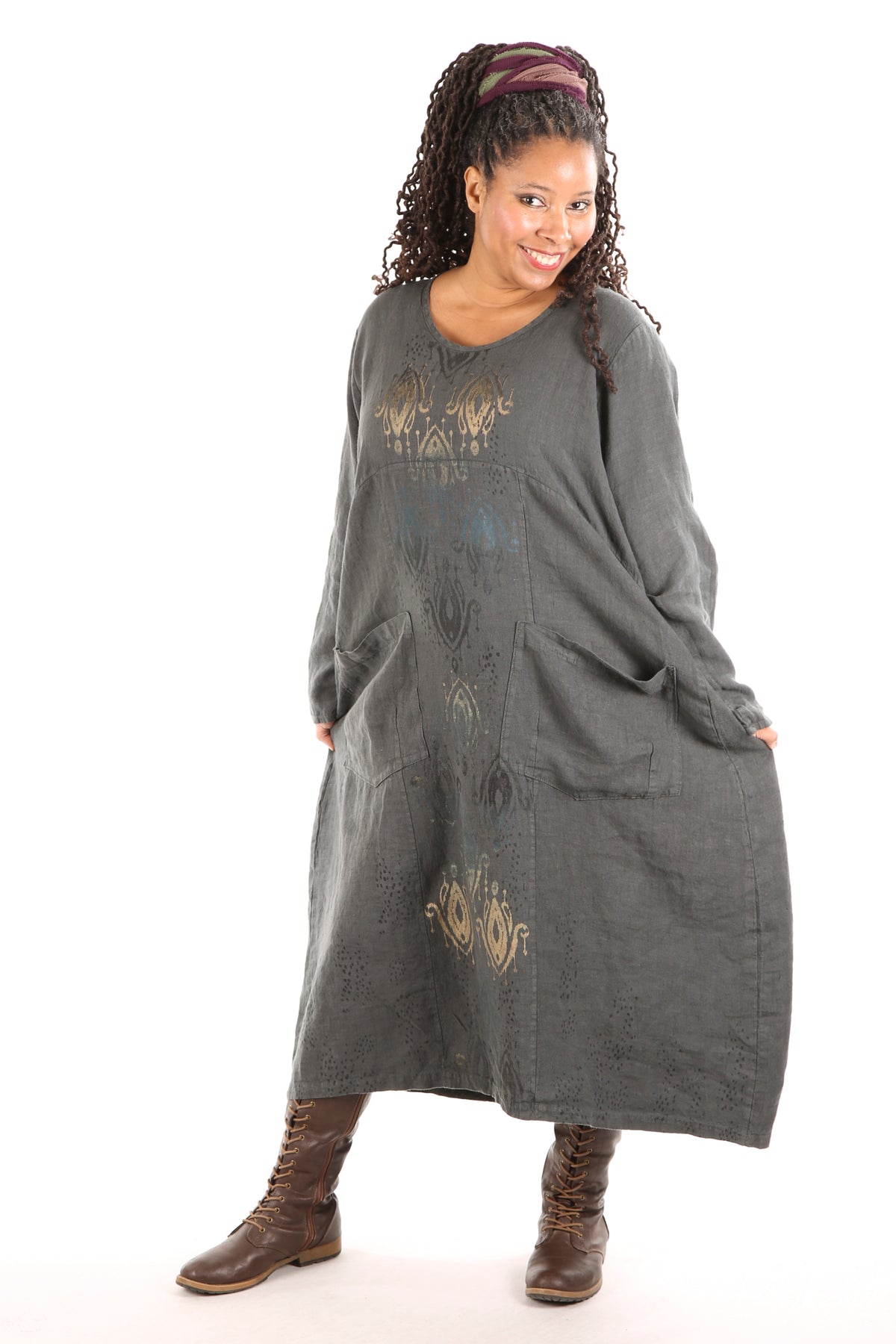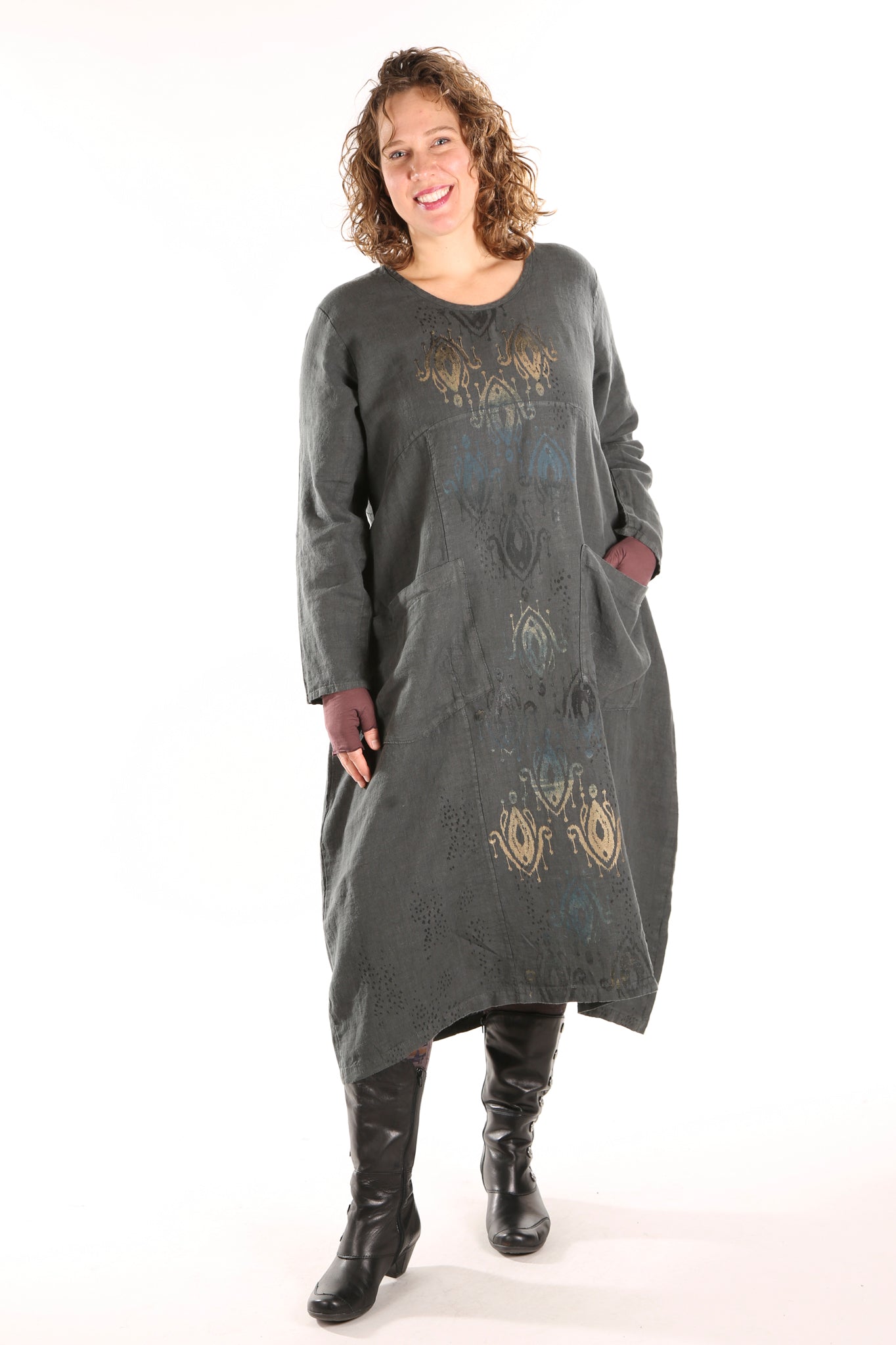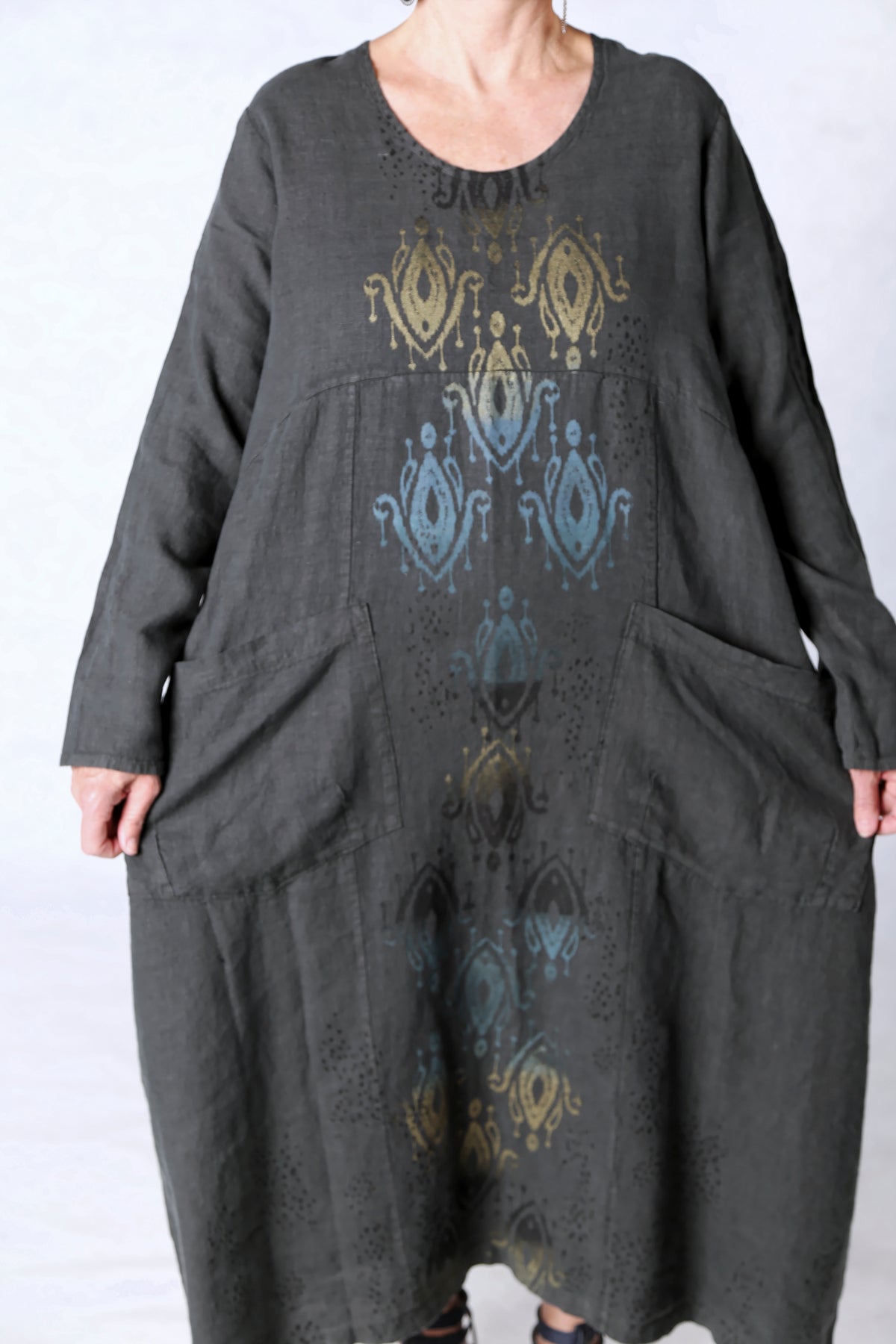 We love this elegant linen dress, timeless in its simplicity. Patch pockets add functionality, while the gently belled shape is perfectly flattering for every body. Just beautiful! Click on the eye that appears over the photo- to enlarge and see how pretty the print is.