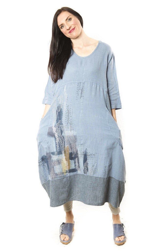 This beautiful loosely-fitting linen dress will be your new go-to piece for comfortable elegance on hot days. The striped trim at the pockets and bottom hem adds a contrast, setting off the lovely soft colors. This is a dress you can live in all-summer long!