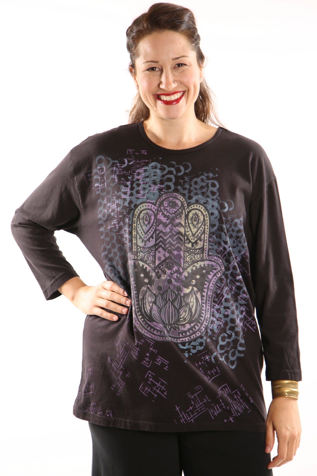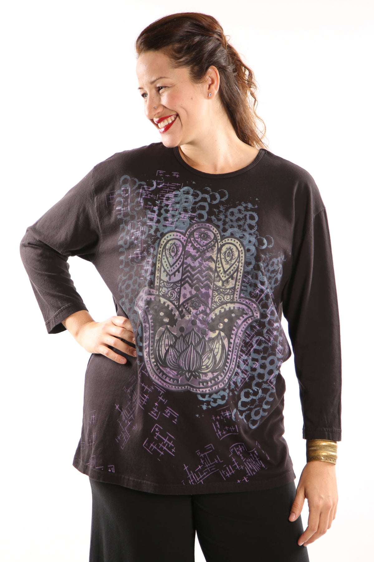 Our classic, long-sleeved organic cotton tee, reinvented each time with new colors and assorted hand-printed designs. Please note that the Blue Fish artists add their own touches to these tees, no two are exactly alike!
